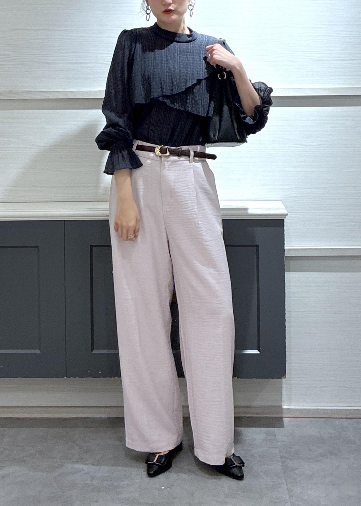 春を連想するピンクのカラーパンツをフリルブラウスと合わせました♡