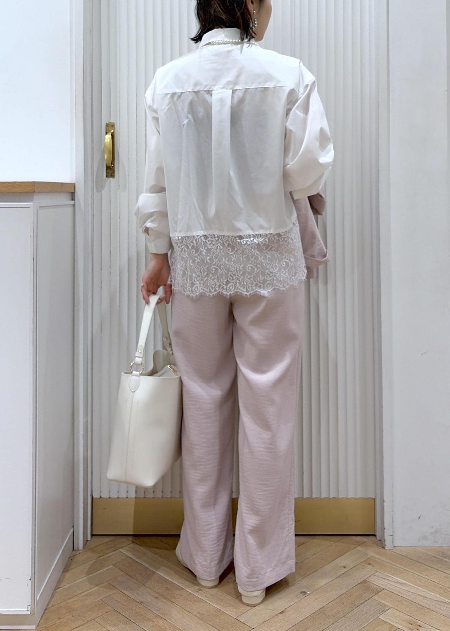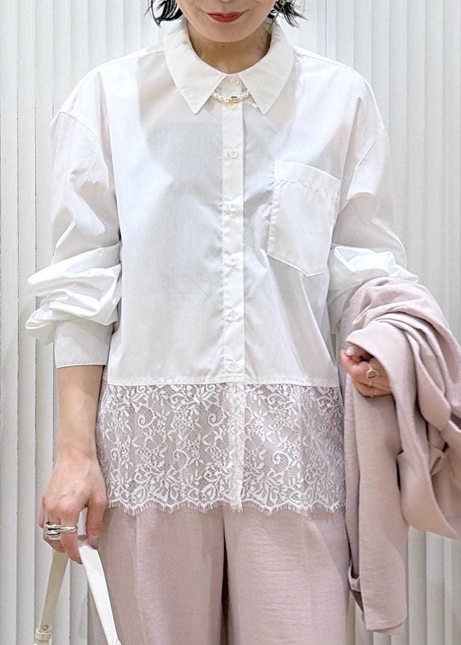VIS裾レースドッキングシャツオフホワイト / F¥6,589レビューレイヤードでも単品でもかわいい裾レースデザインのシャツ。ブラックをリアルバイしました!ボクシーなサイズ感で、骨格ナチュラルさんにお勧めのサイジング。肩周りや身幅にゆとりがあり華奢感を出せるので、1枚ではもちろんニットやジャケットのインとしてレイヤードスタイルにもお勧めです。