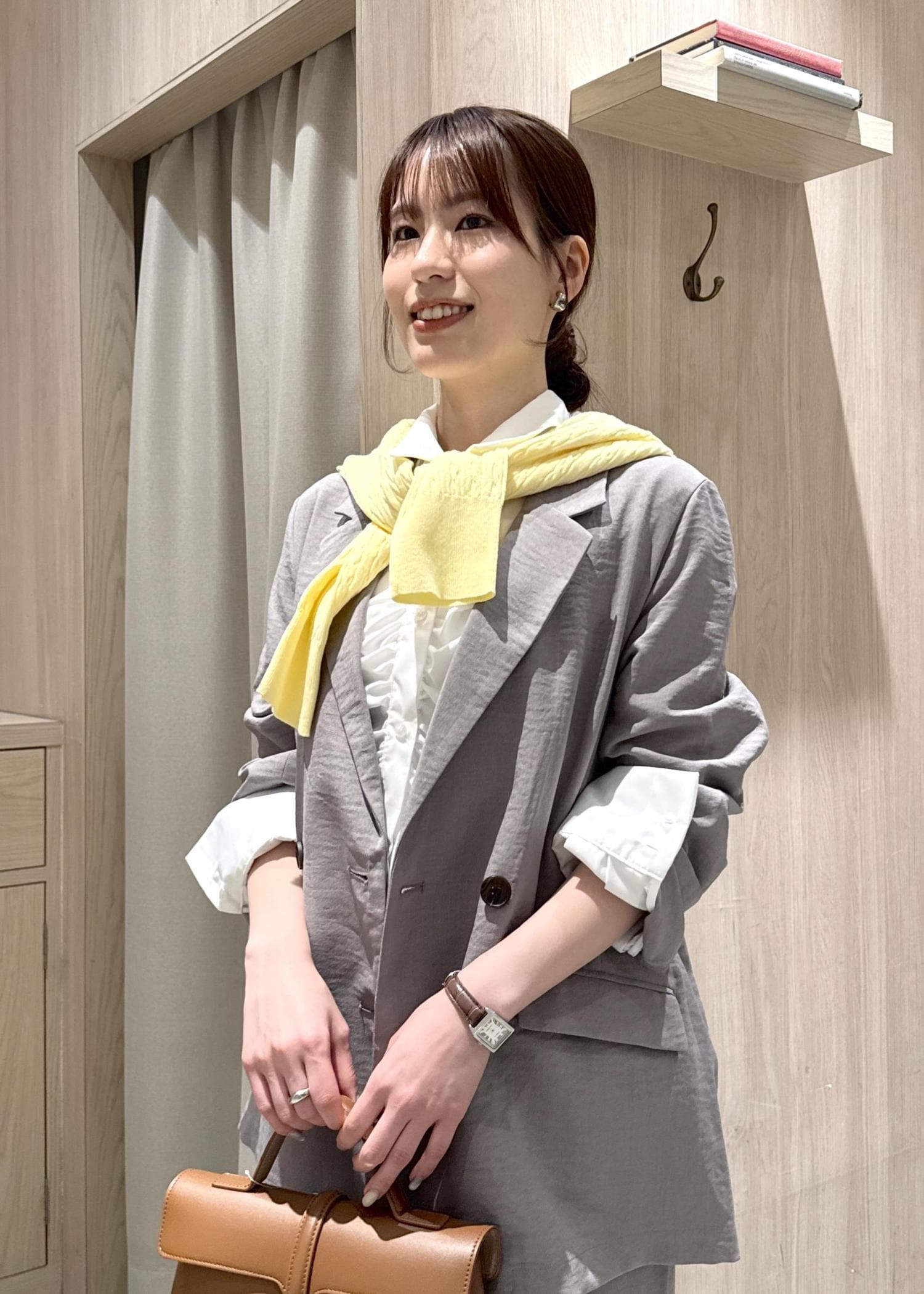 ヒップに少し掛かる丈感です。ブラウスの中では短めなので、ボトムスにインしても腰回りがゴワつかないところが推しポイント!