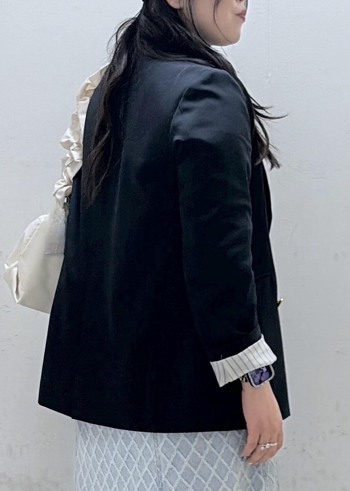 丈感は長めですが、肩幅はジャストでくるのでカジュアルダウン過ぎず、きちんとスタイルにもおすすめです。 -