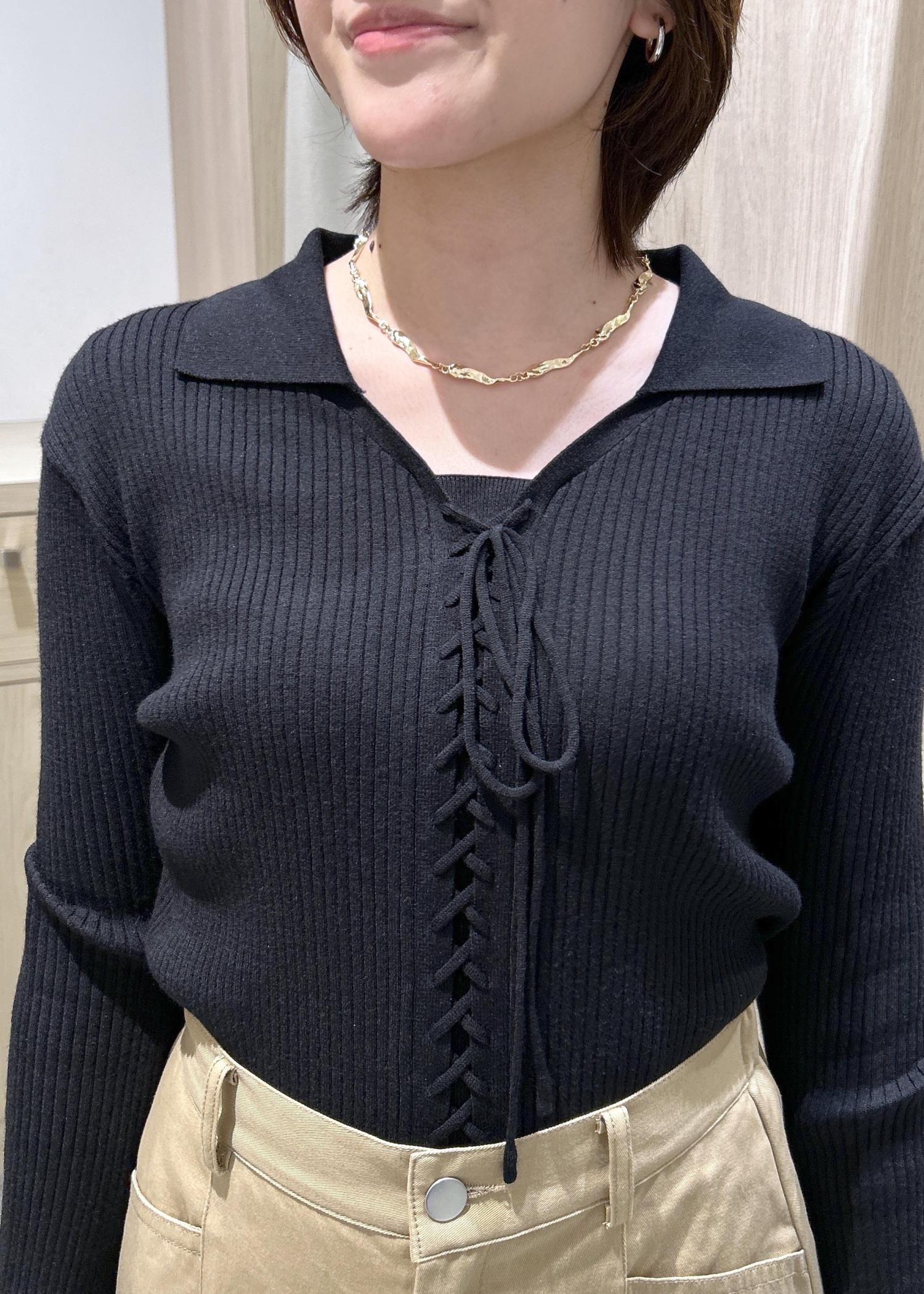 VISレースアップリブニットブラック / F¥5,929レビュー深過ぎない空き具合ですが、デコルテがキレイに見えるシルエットです。