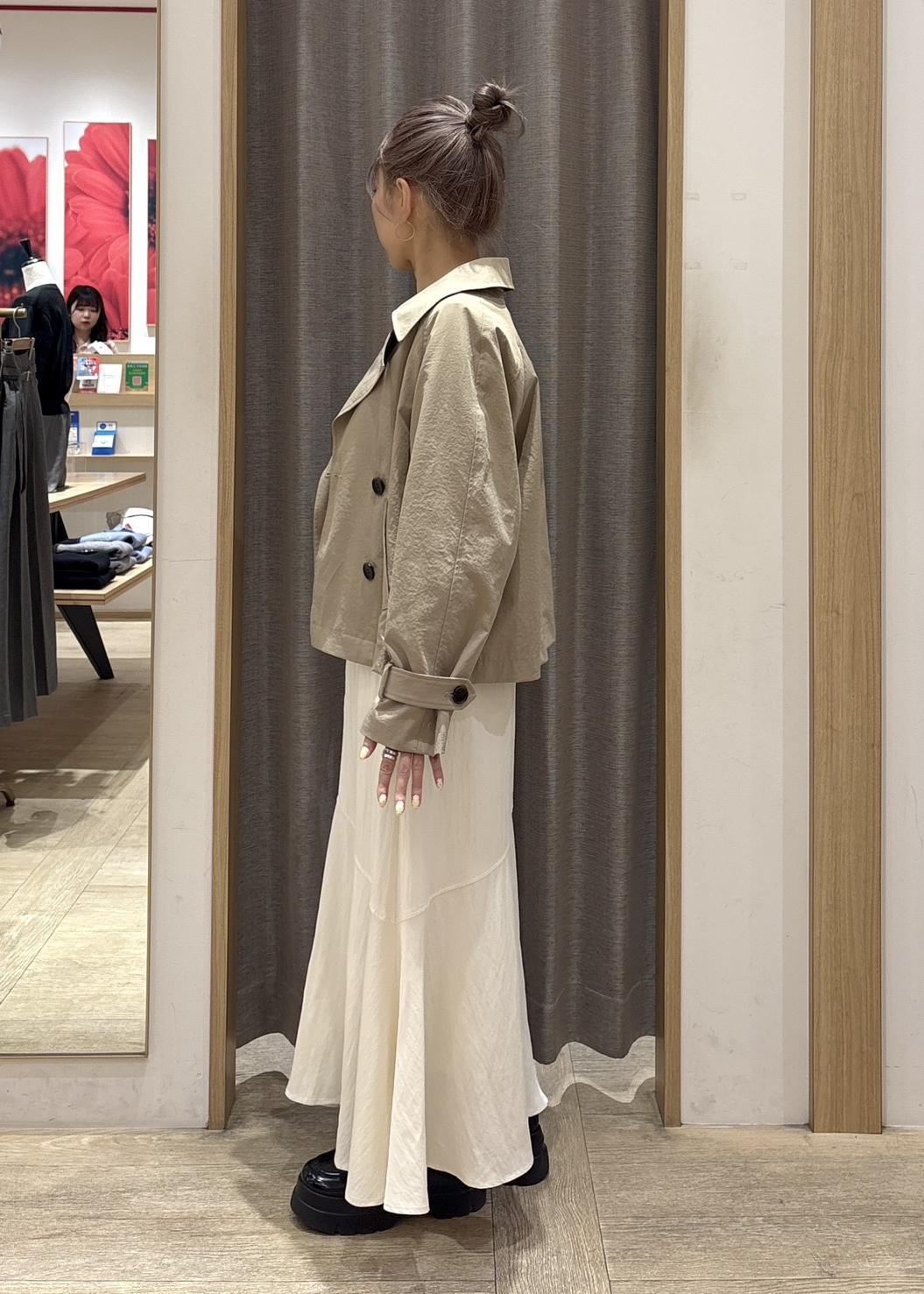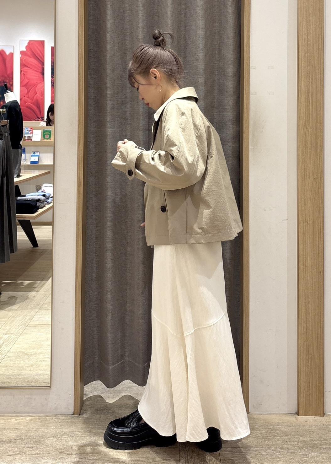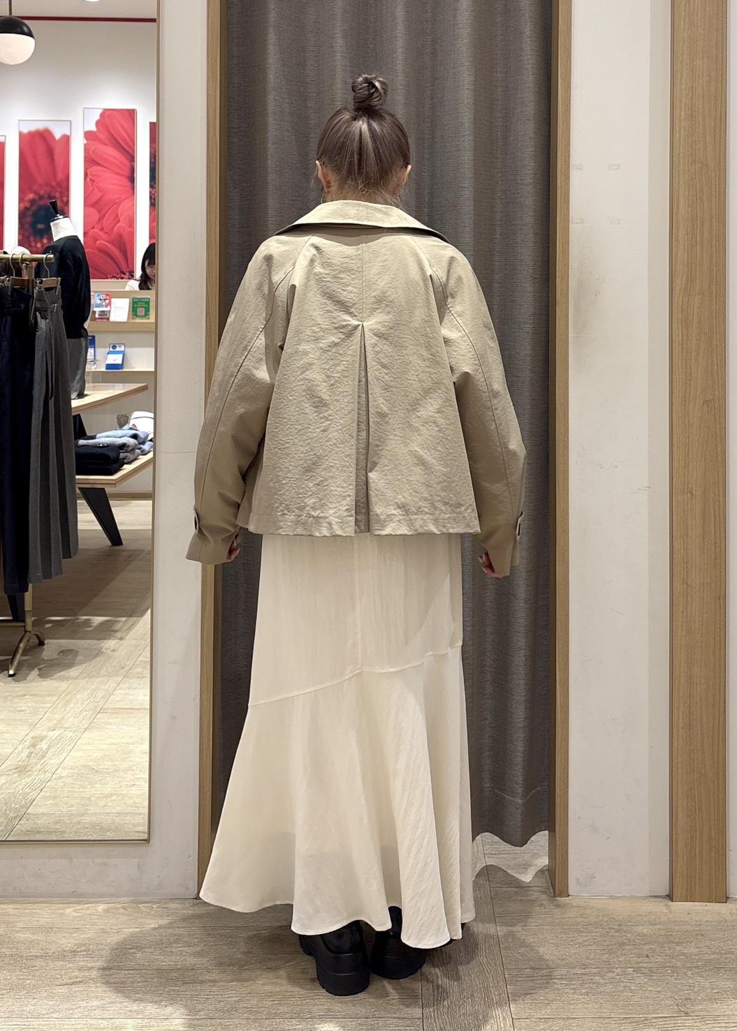 さっと羽織れるショートトレンチは、ロングスカートとの相性抜群◎