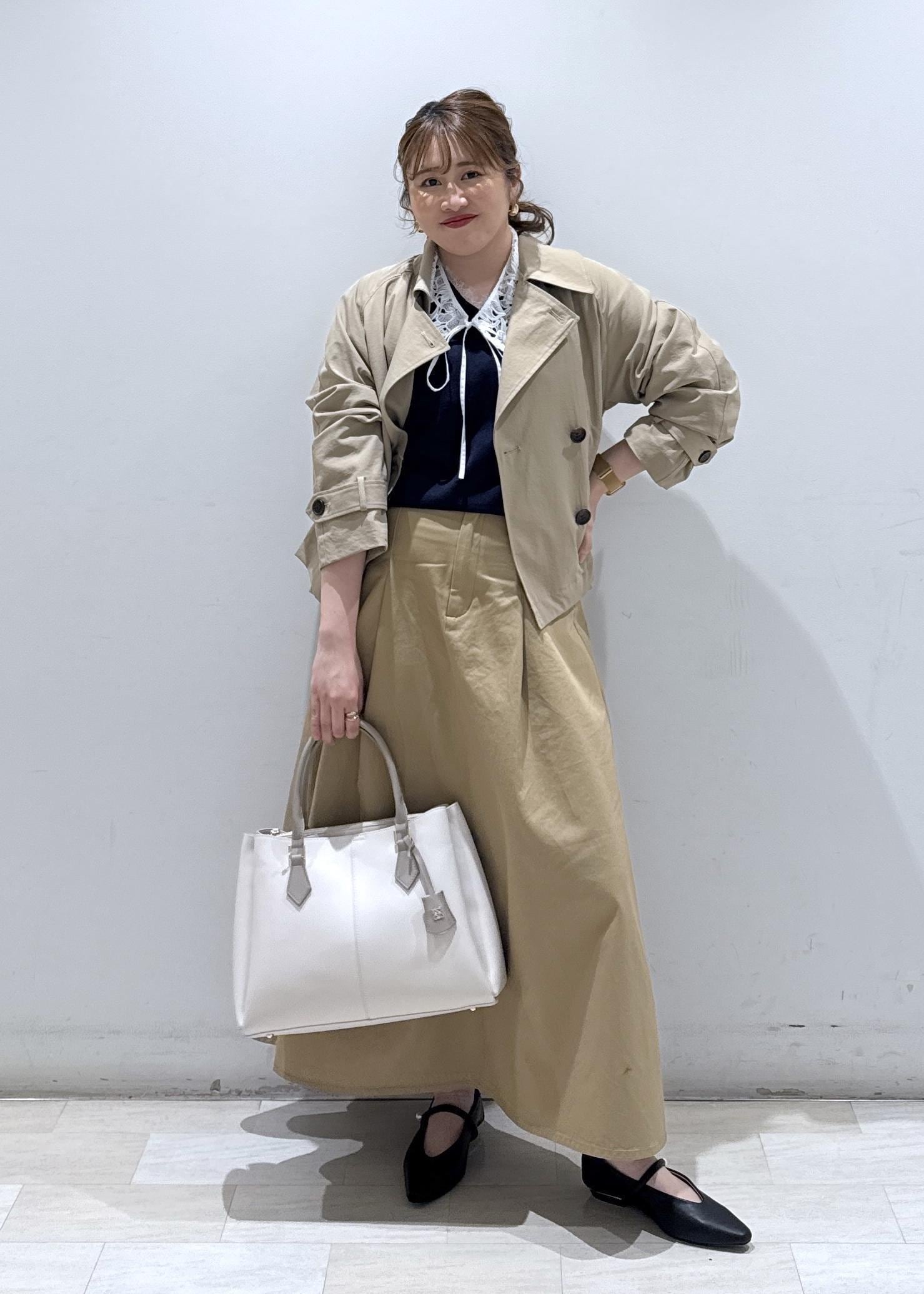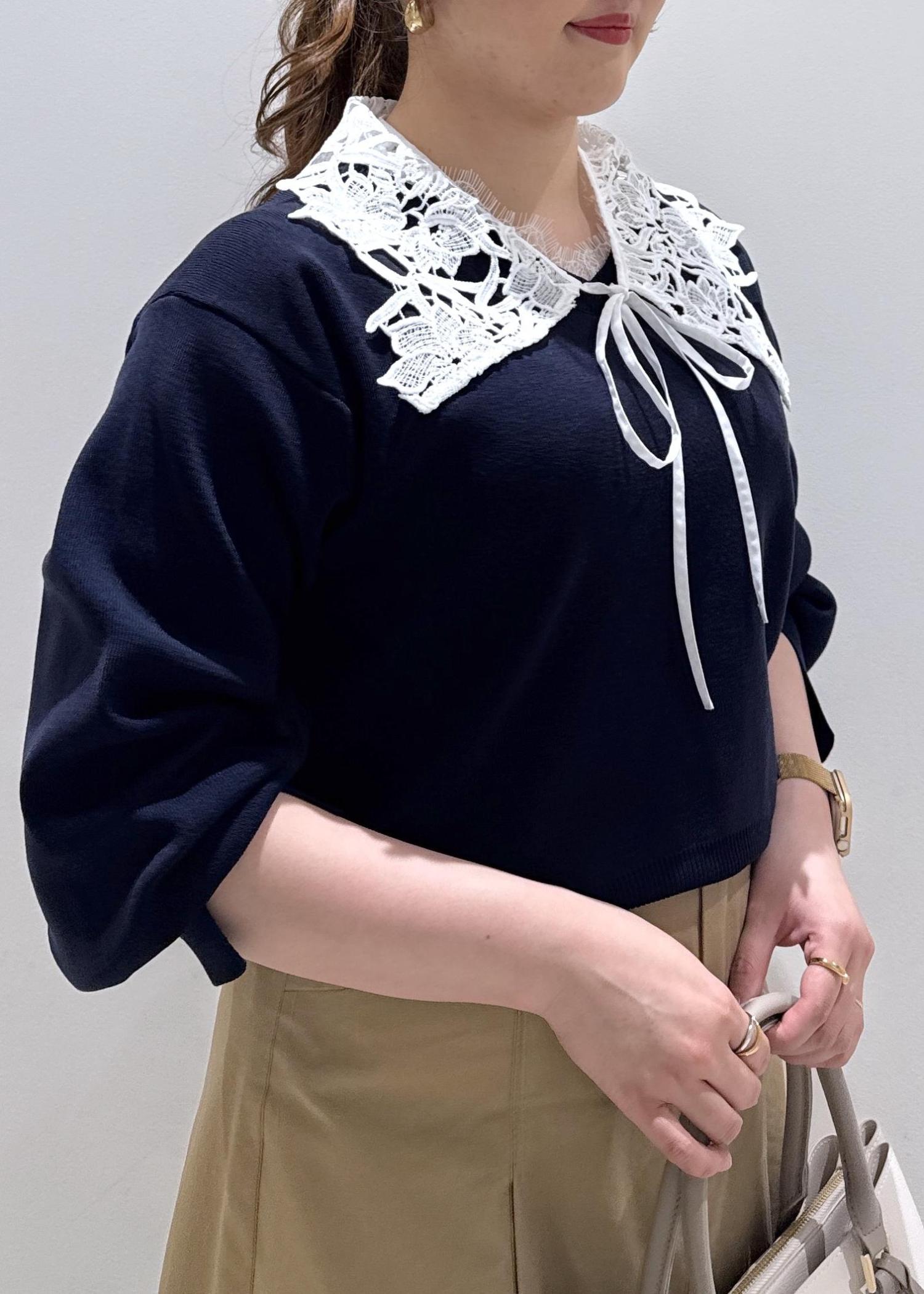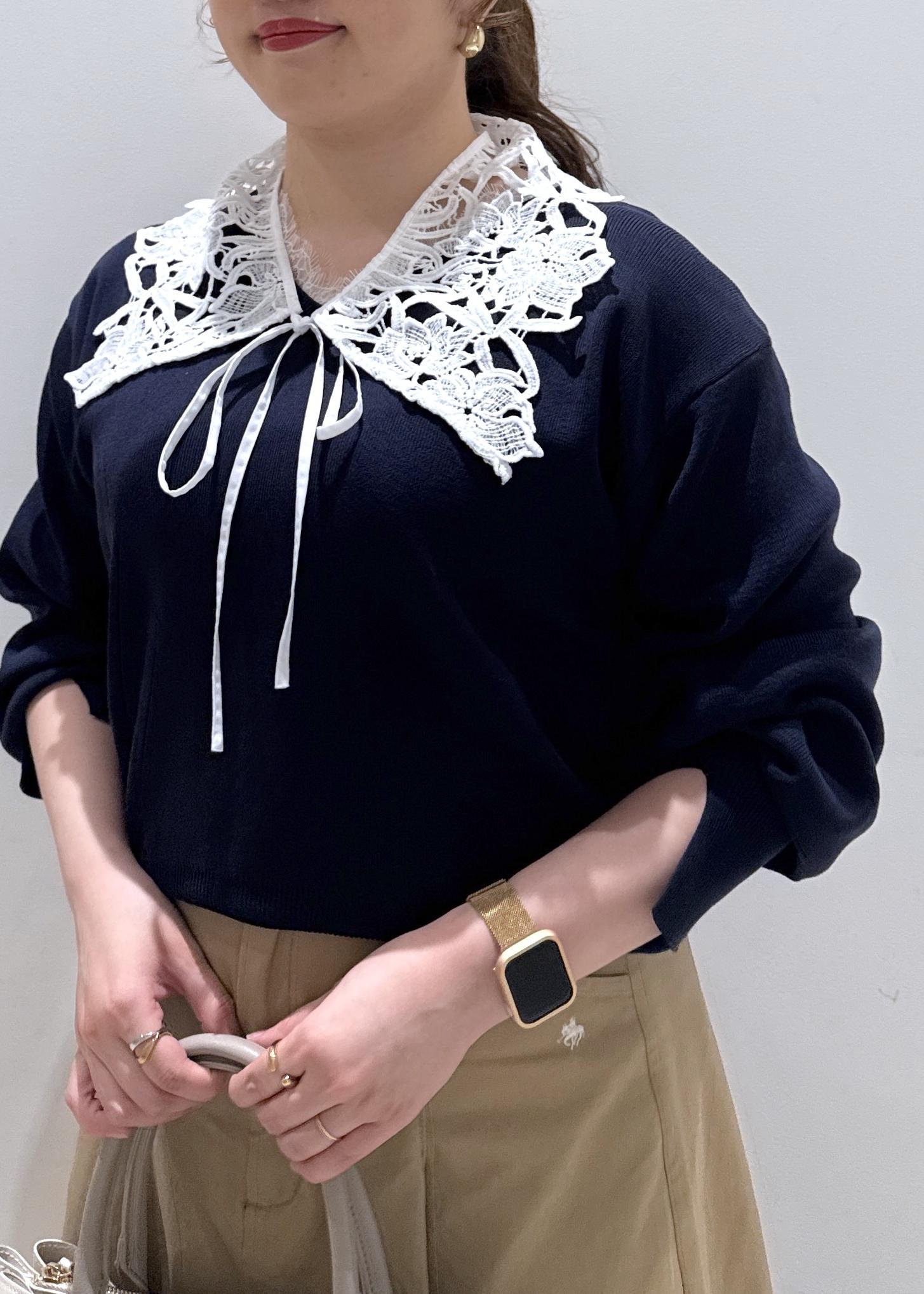 ネイビー×ベージュカラーで衿レースが付いていることで、春らしい休日のオススメコーデでございます。