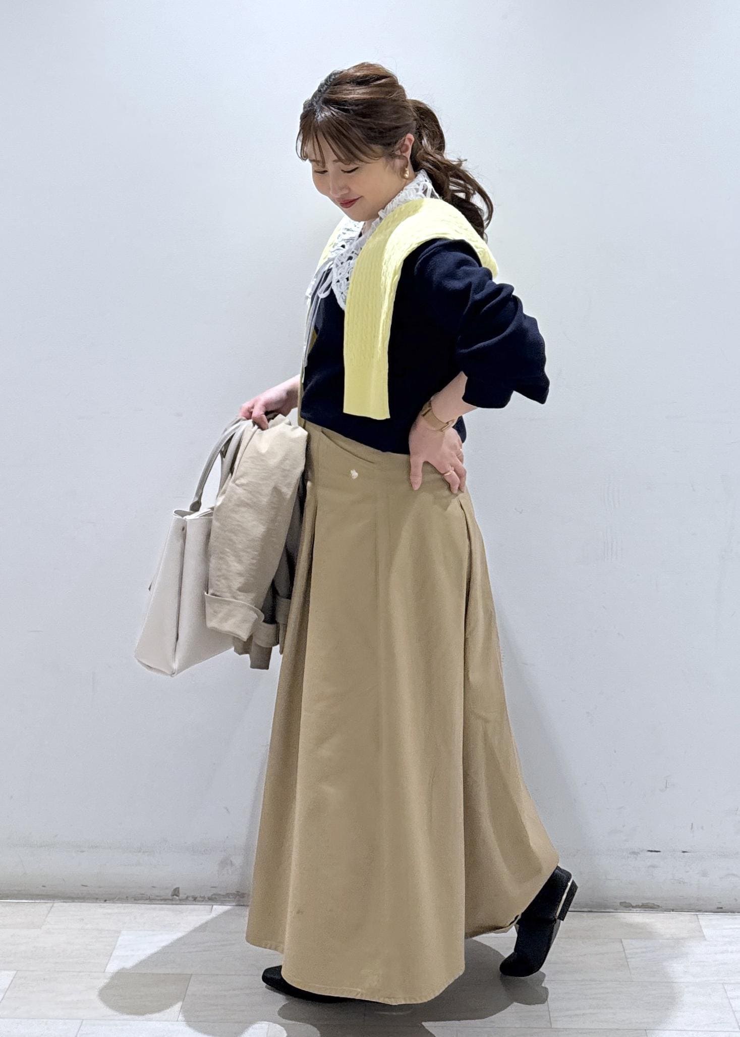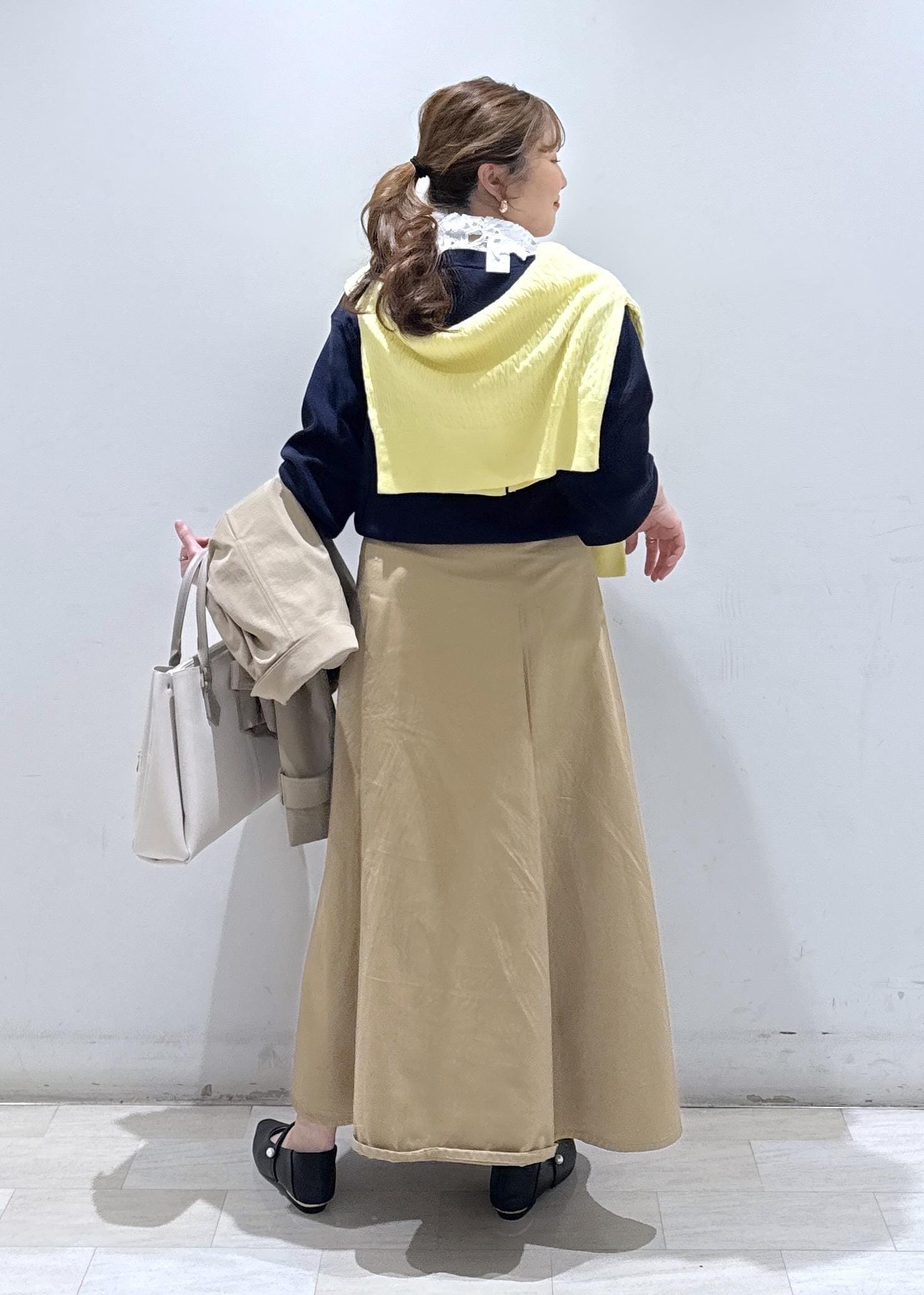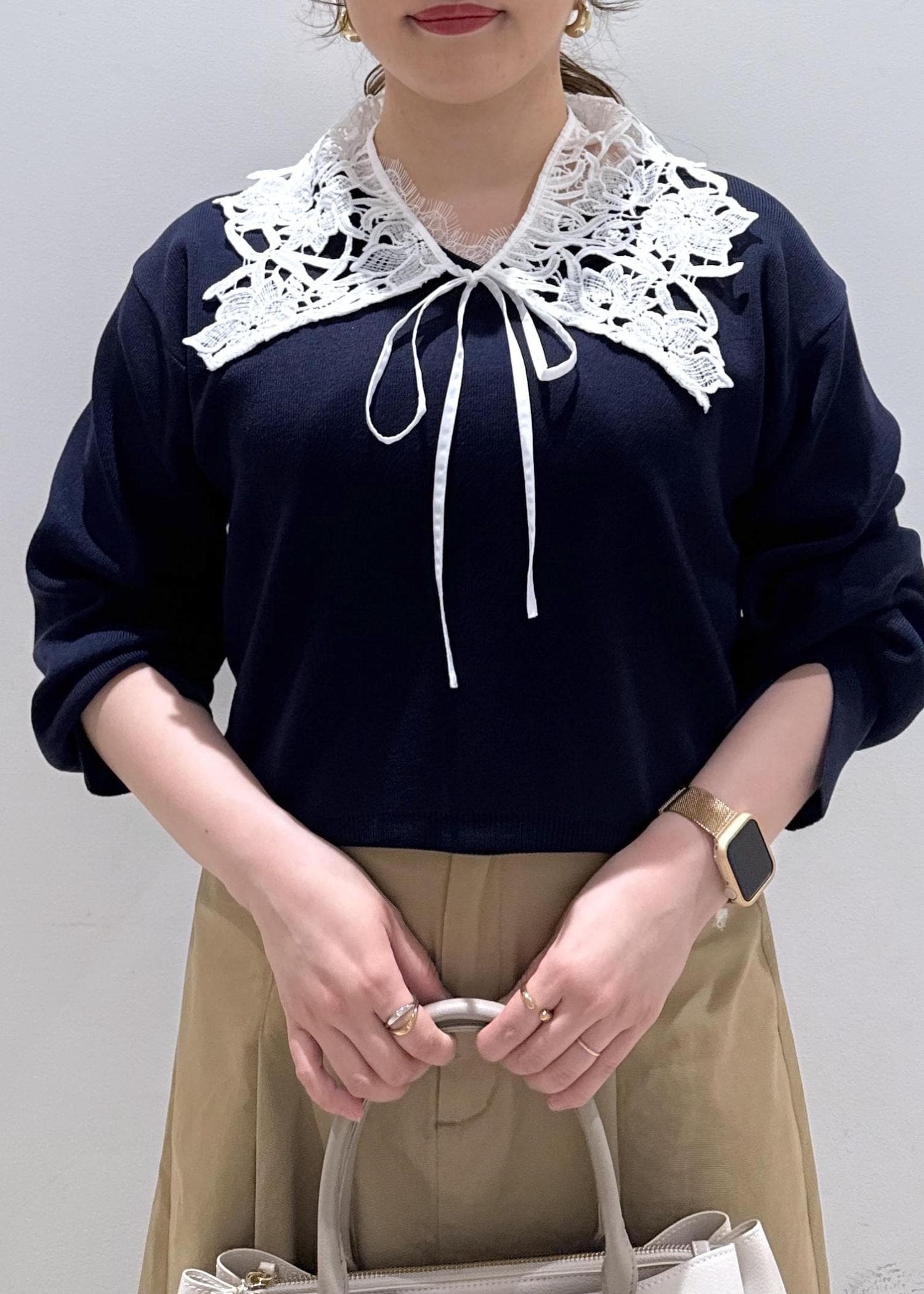 ネイビー×ベージュカラーで衿レースが付いていることで、春らしい休日のオススメコーデでございます。