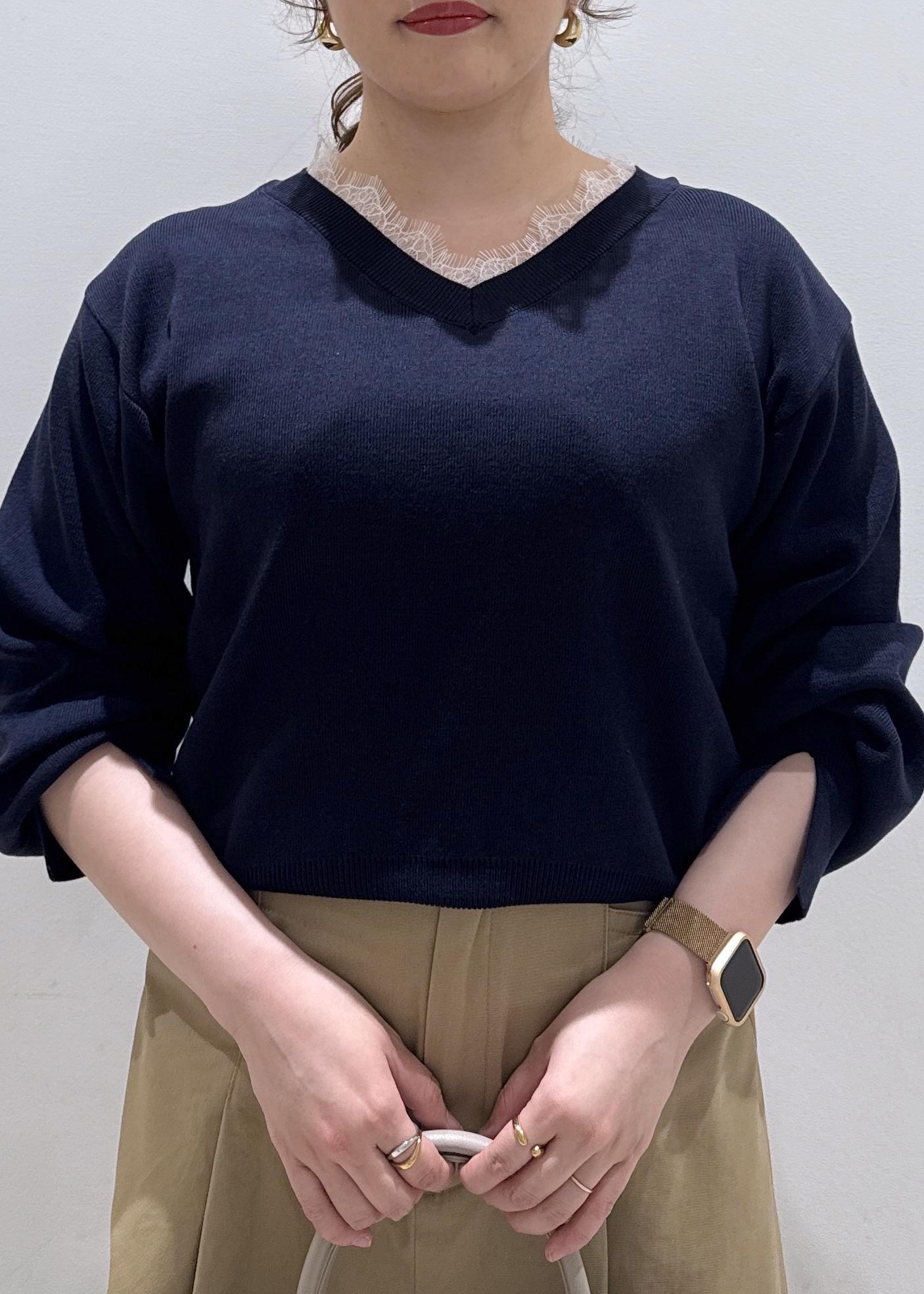 VISVネックレースプルオーバーネイビー / F¥5,929レビューVネックのところにレースがドッキングで付いているので、1枚なのにまるでレースのインナーを着ているかのように見えます⭐︎これからの春に使えそうなサラッとした素材感に、お袖がフワッとボリュームがあり女性らしさが出て可愛いです。着丈は身長157cmで腰辺りの着丈でした。ゆったりもしているのでお仕事やプライベートにもオススメ◎
