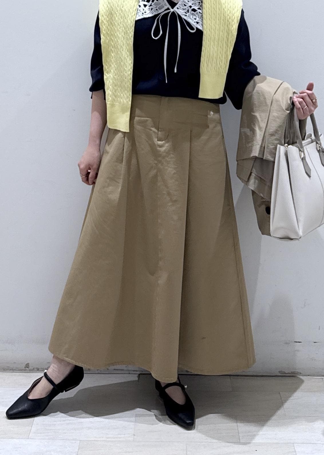 綿素材の張り感のある柔らかい生地なので、涼しく春だけじゃなく夏まで長く使えそうです。身長157cm/Mサイズ着用で足首ぐらいの少し着丈が長めなスカートで、Aラインのシルエットが絶妙に可愛いです!シワにはなりやすいので、小まめなスチームアイロンは必須です。 -