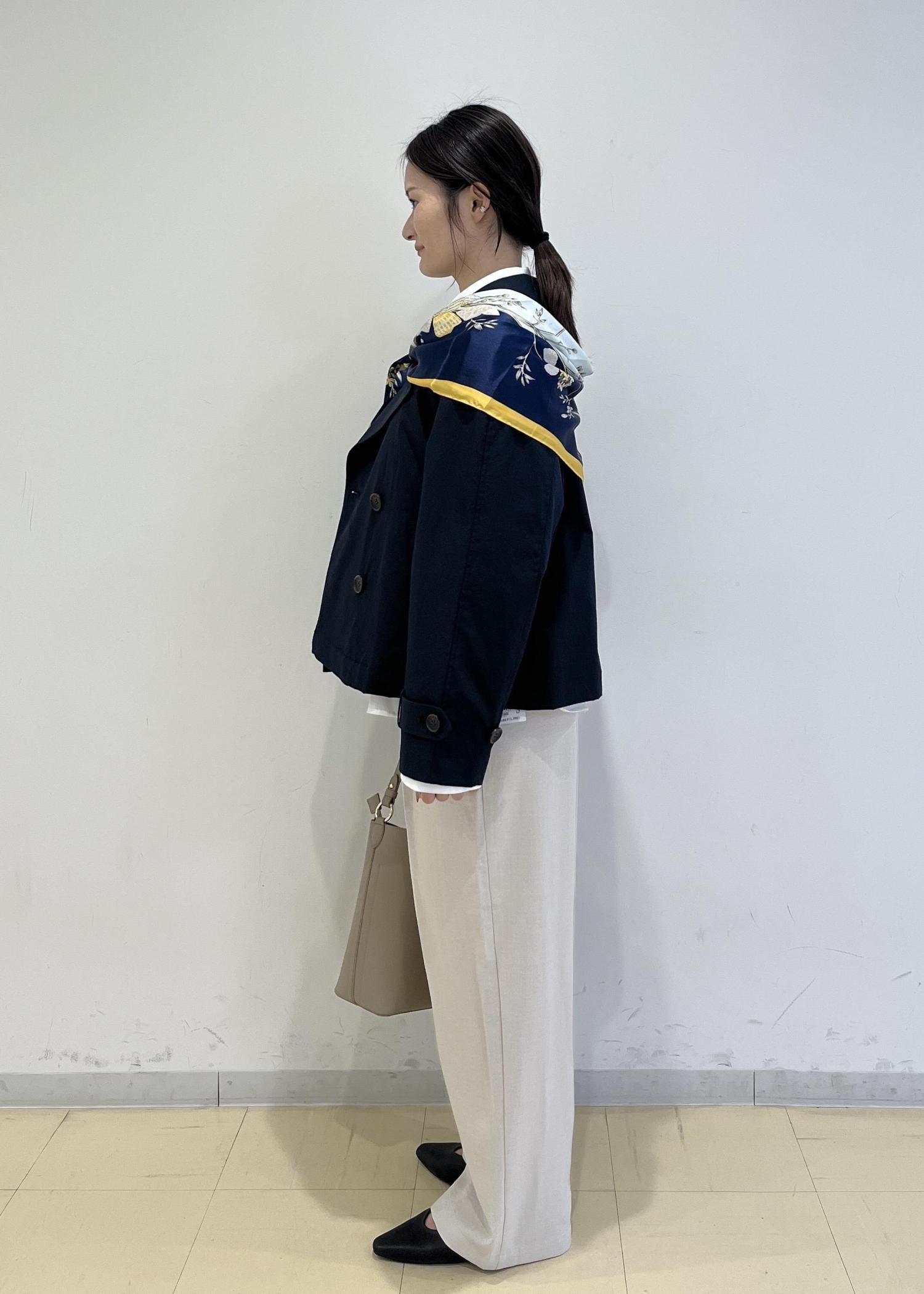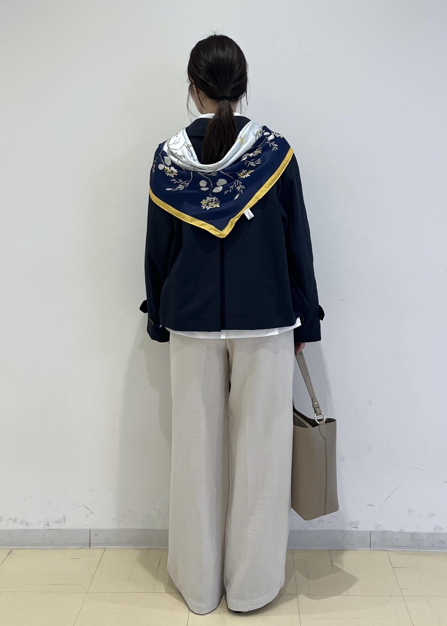 柄スカーフを重ね、顔周りに華やかさをプラスしました♩