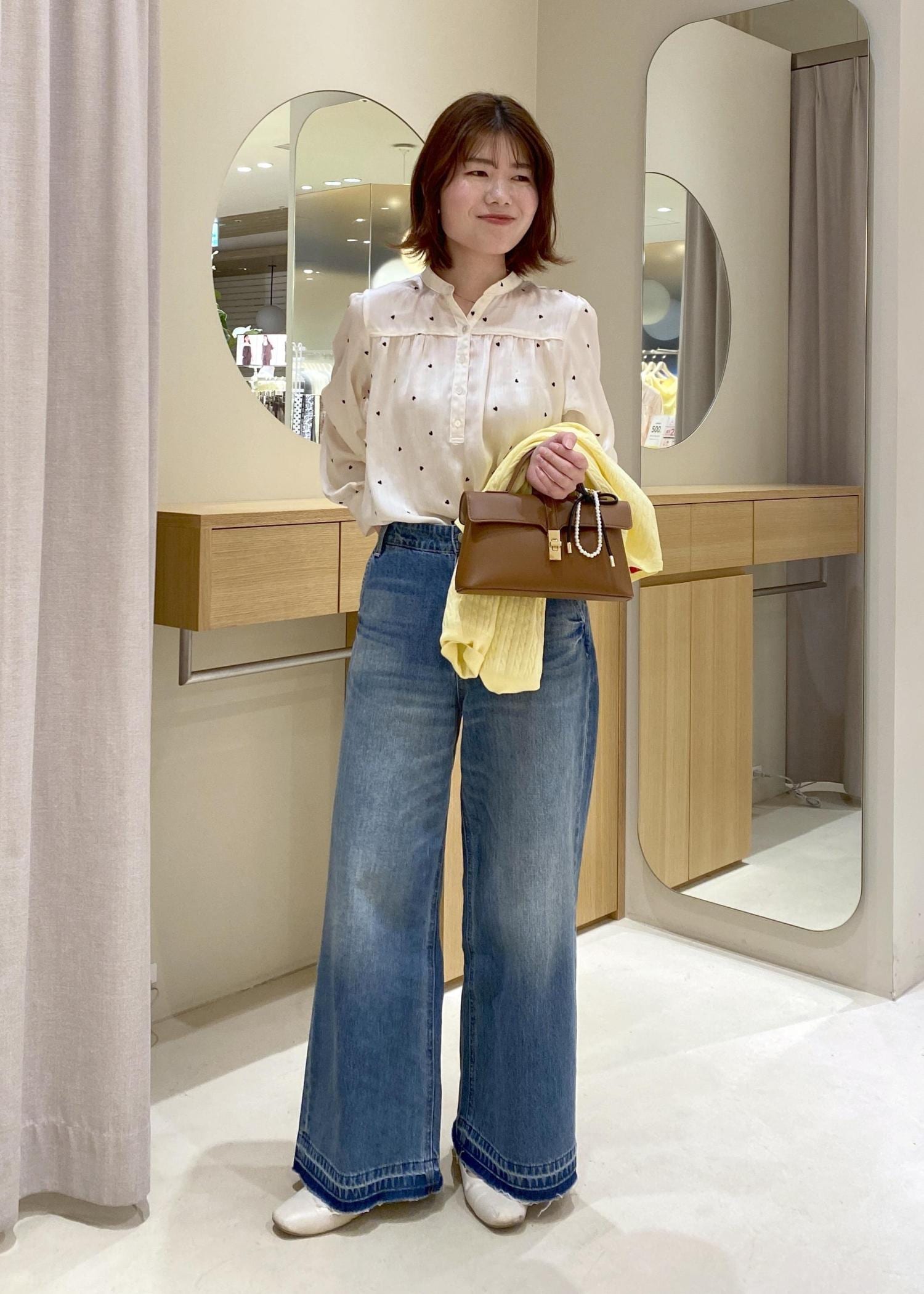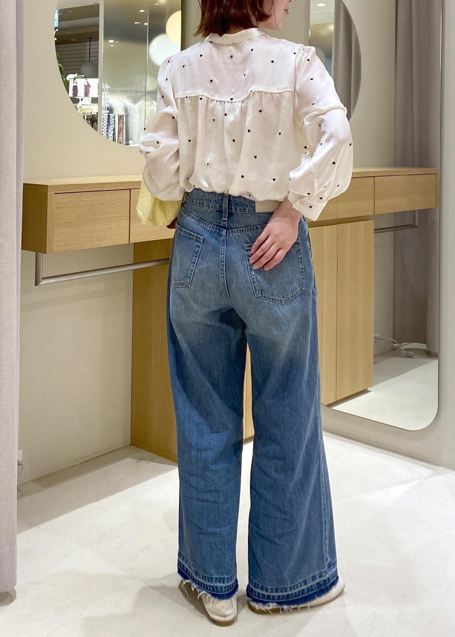 デニムでカジュアルダウンしながらも、ハート刺繍ブラウスやバッグチャームで女性らしらもプラスしています!