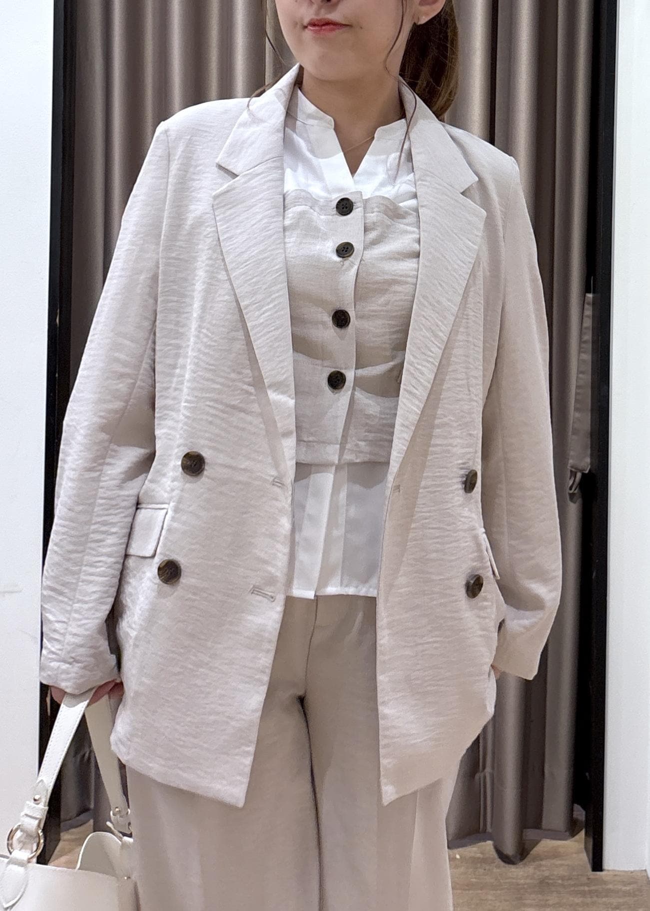 VIS美easyリネンライクテーラードジャケット/イージーケア・接触冷感・セットアップ対応キナリ / S¥7,909レビュー153cm、Sサイズ着用でおしりが隠れる丈感です!
