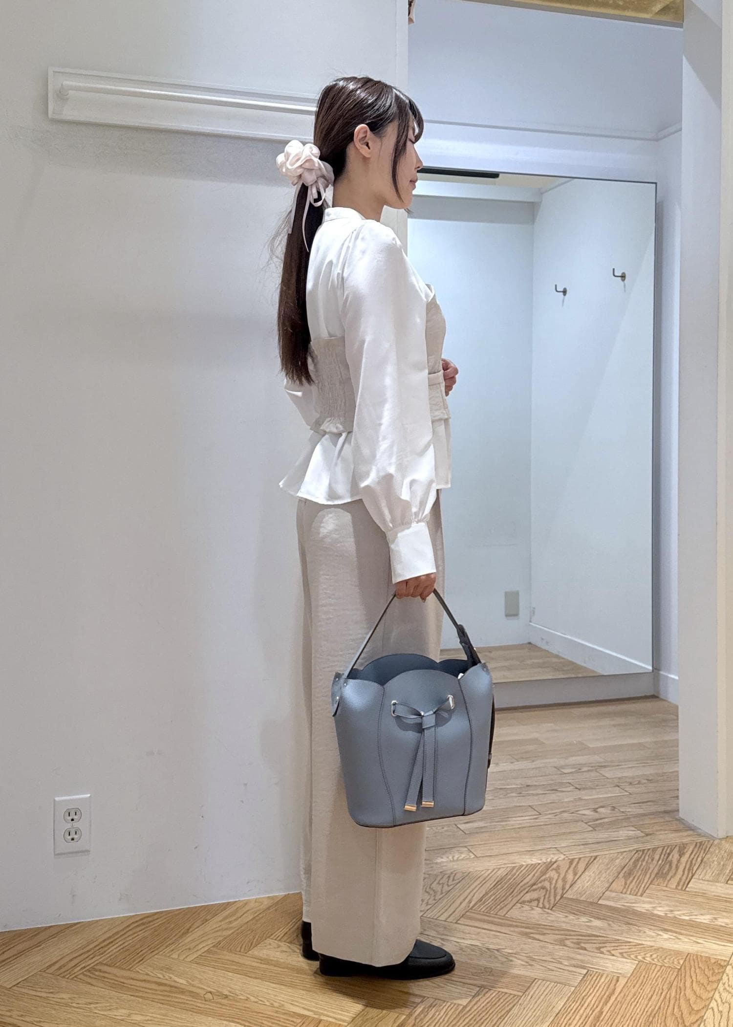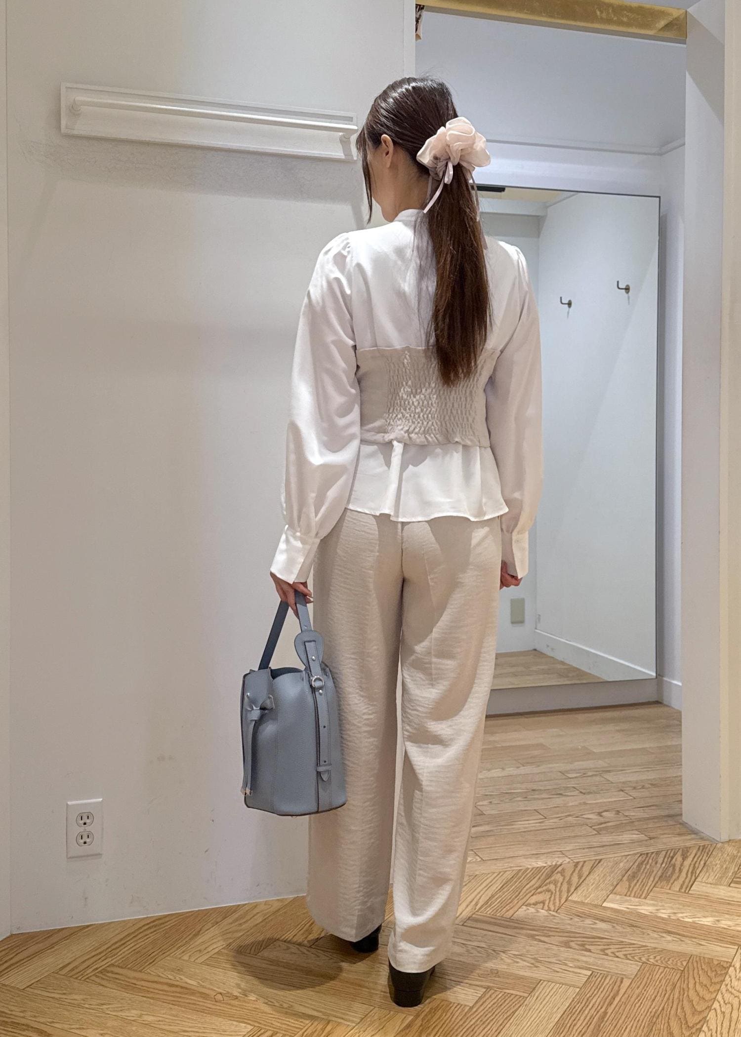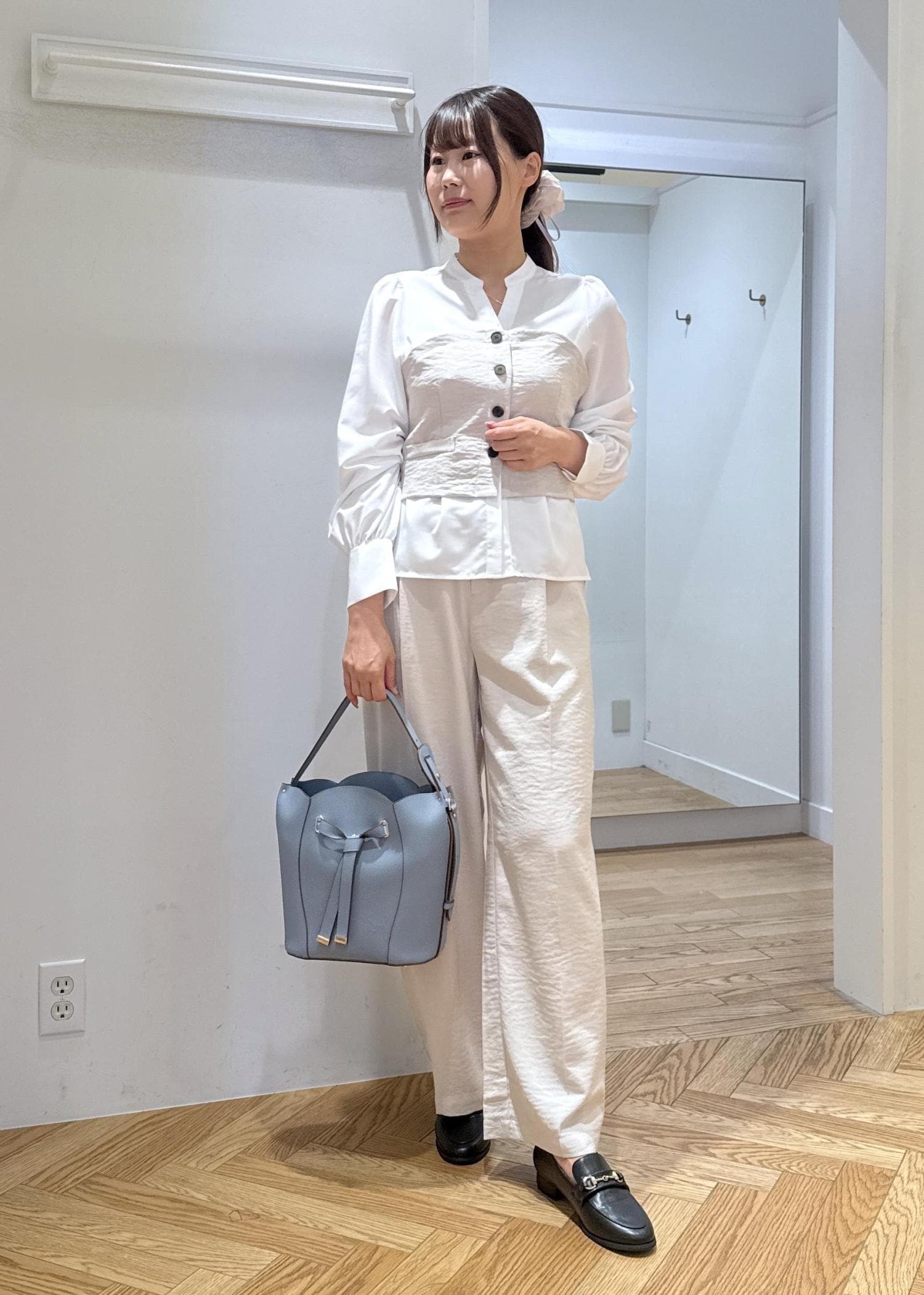 ビスチェドッキングシャツに同素材のパンツを合わせて大人カジュアルコーデにしました。春らしいホワイトカラーで統一。