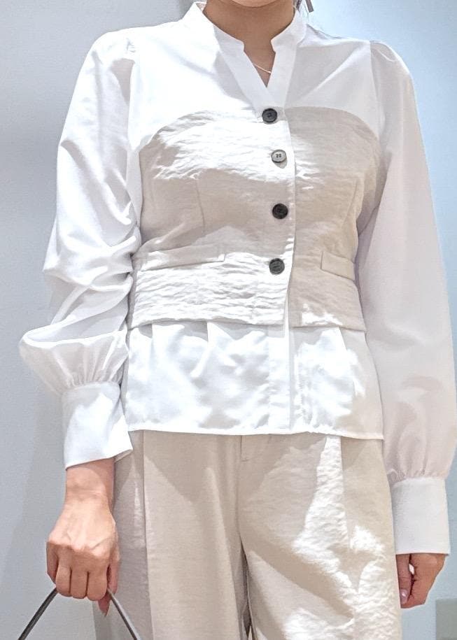 スキッパースタンドカラーシャツとビスチェがドッキングされたブラウスです。