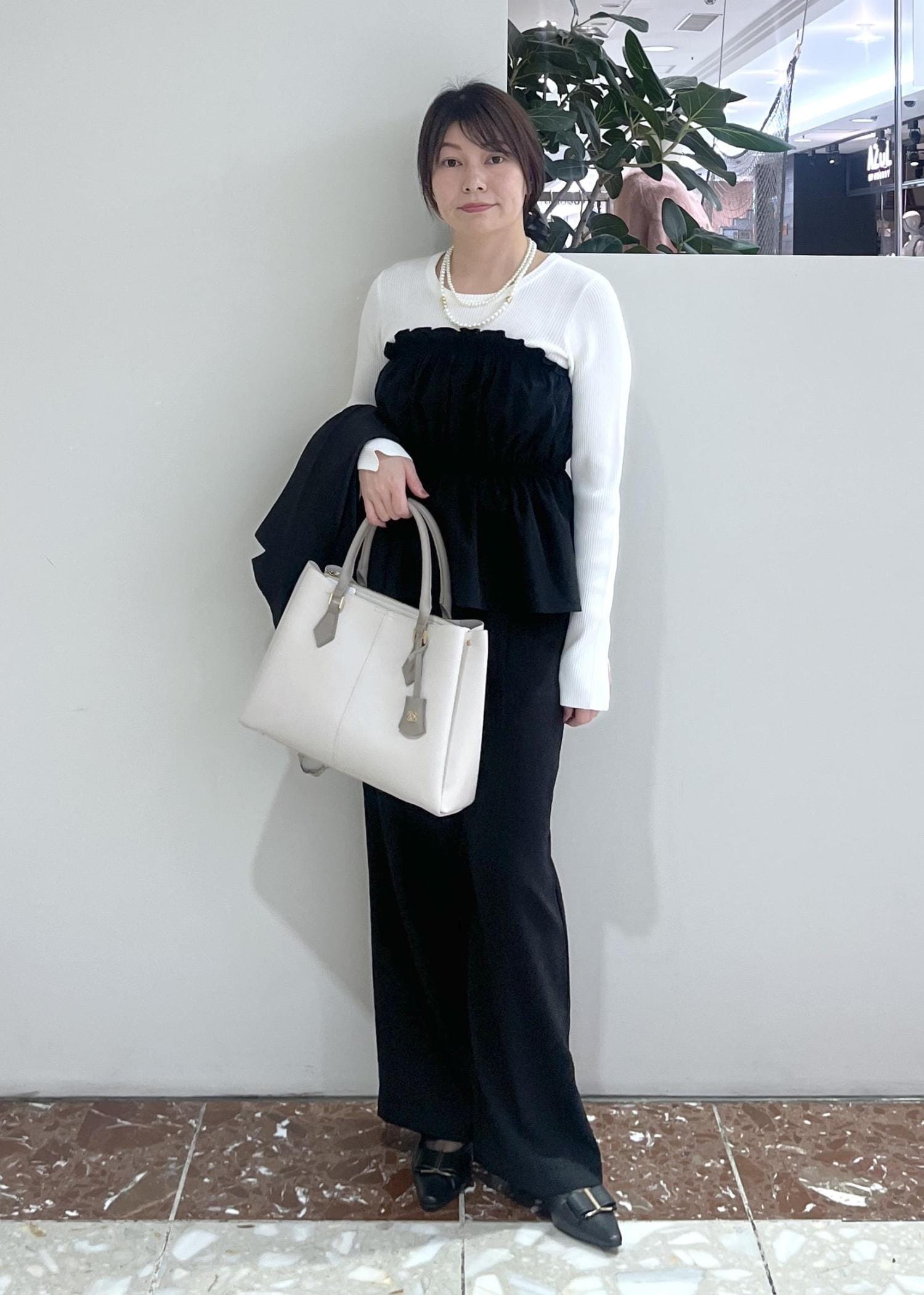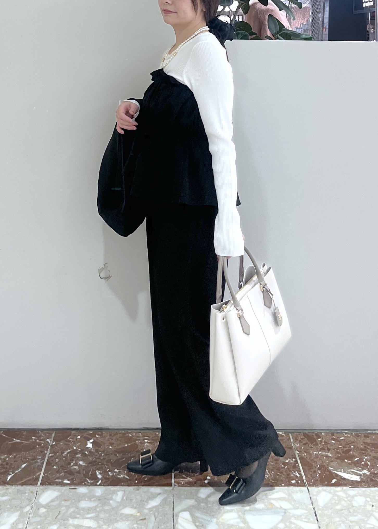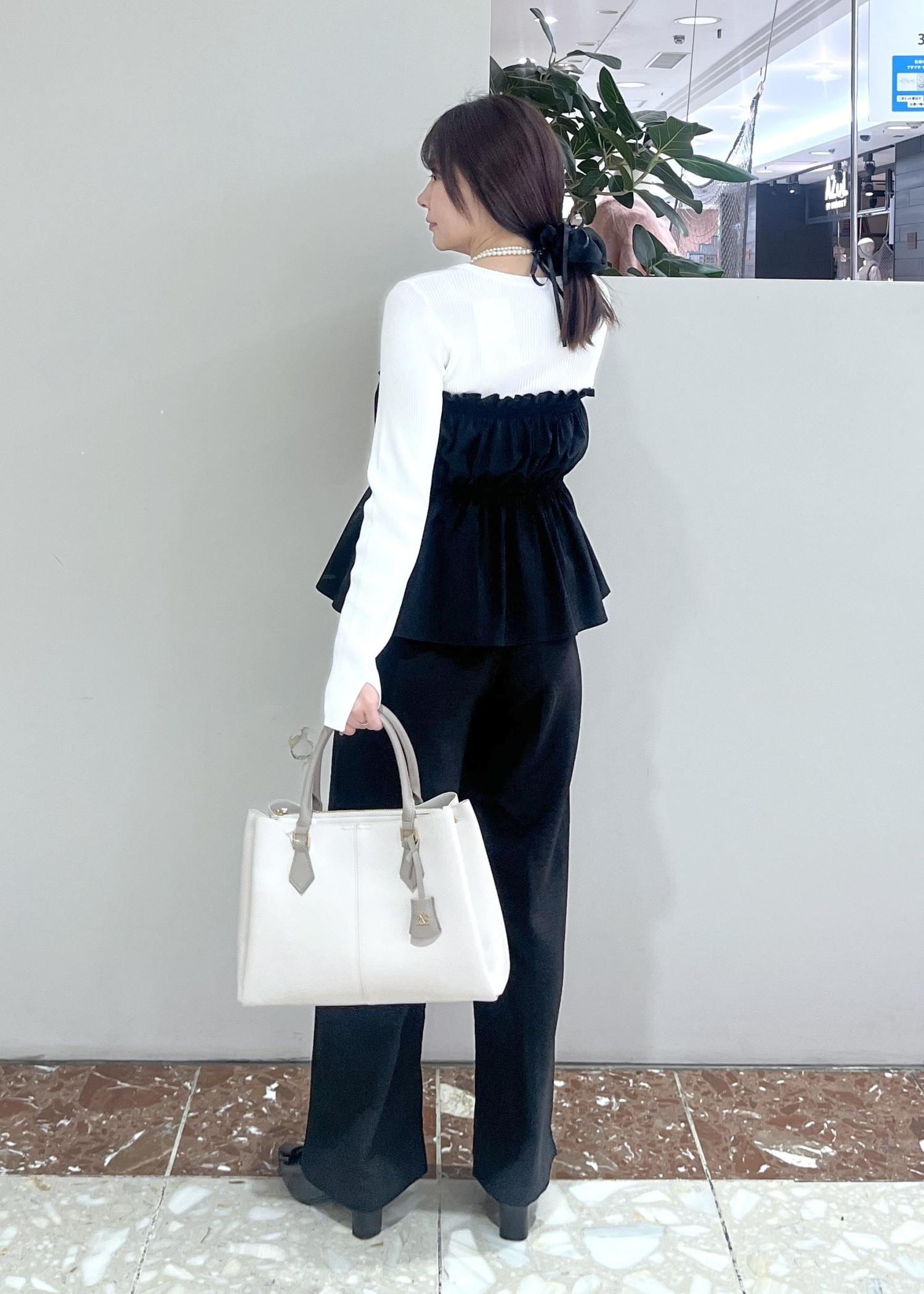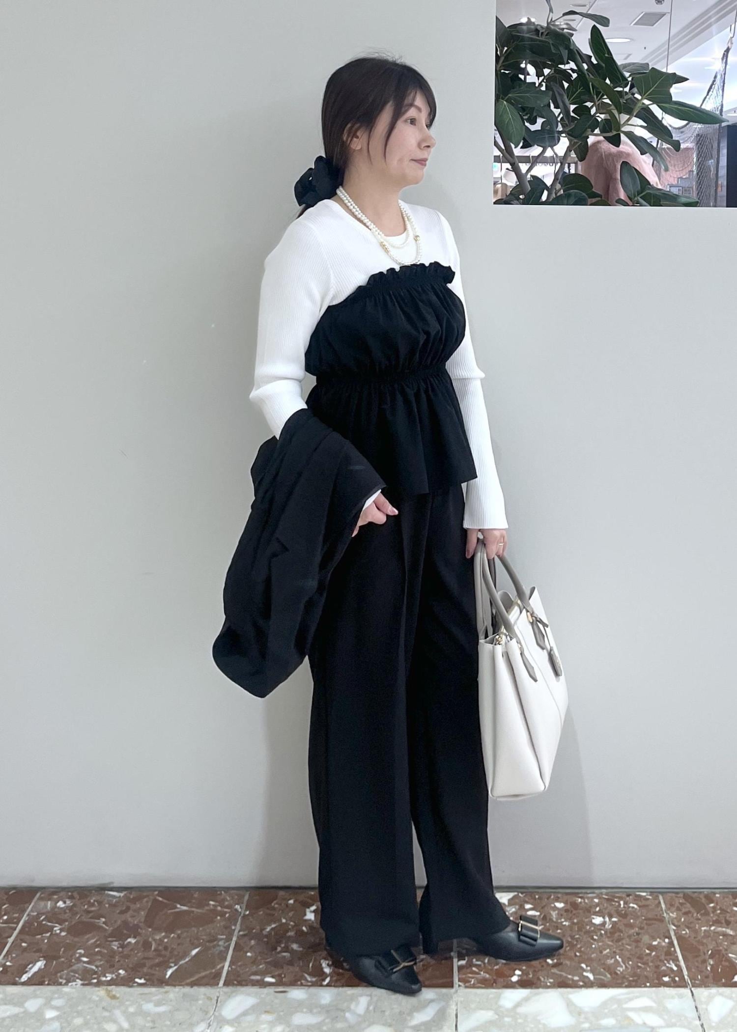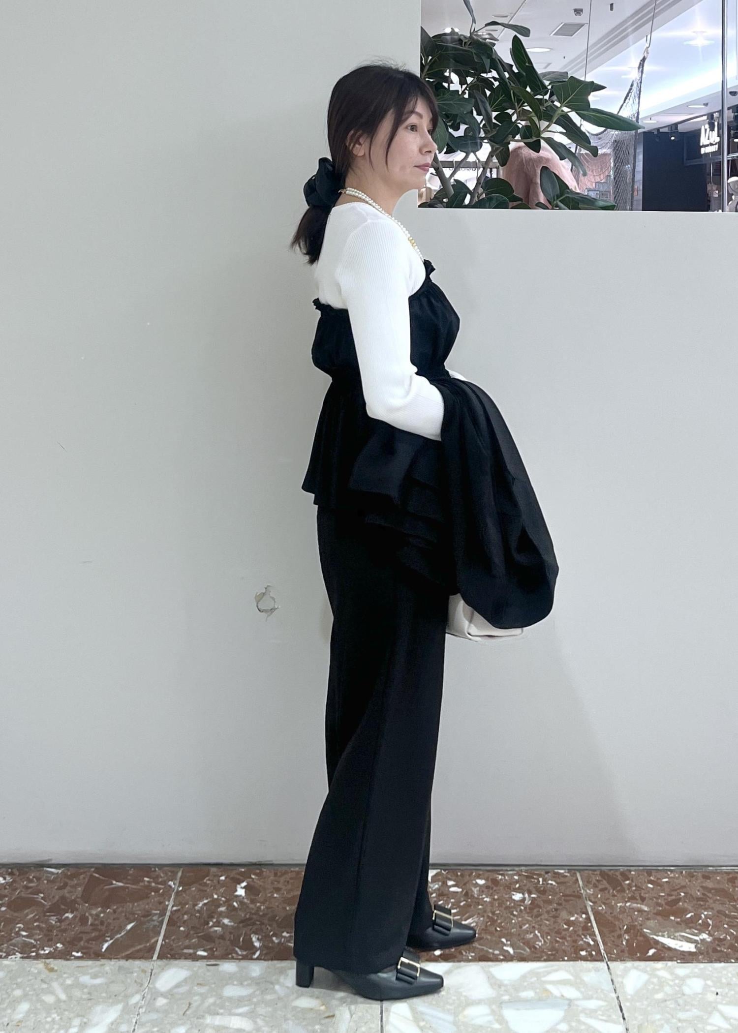 VISシャーリングビスチェドッキングニット/イージーケアブラック / F¥5,929レビューシャーリングがポイントになり着やすいデザインのトップスです。パンツを同系色で合わせるとセットアップのように着られます。