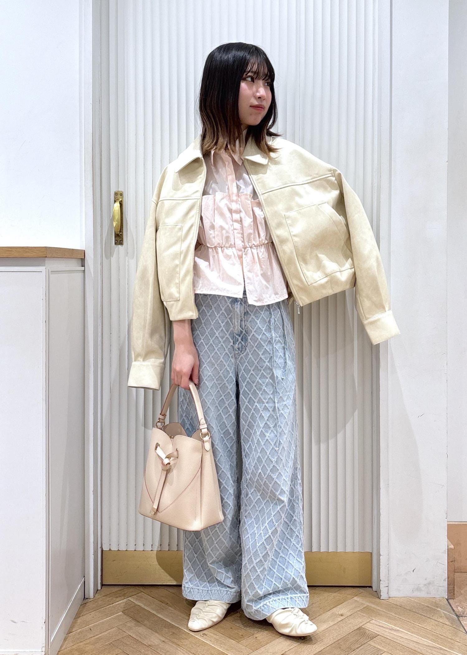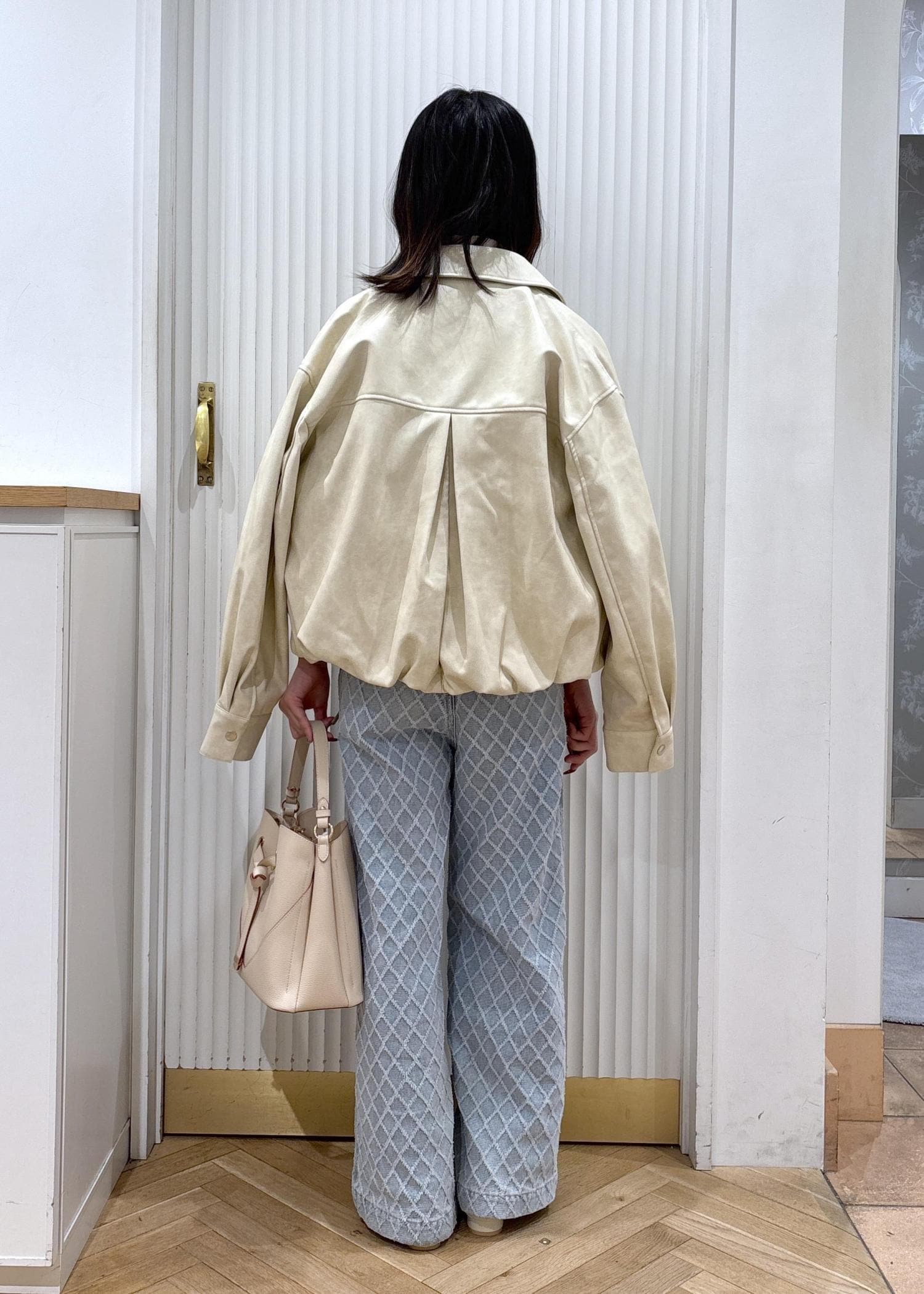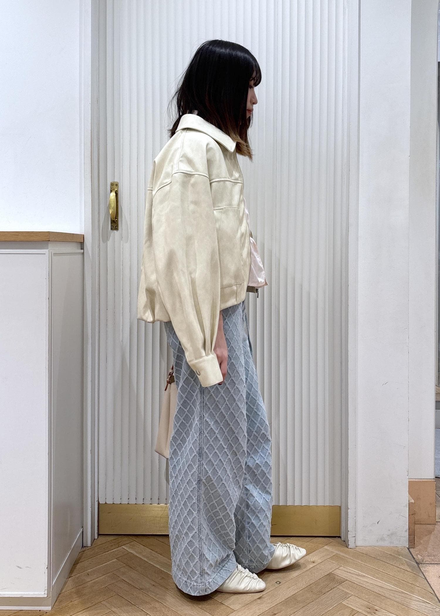 VISアウトポケット合皮ブルゾンクリーム / F¥10,989レビュー153㎝着用でヒップにかかるくらいでした!柔らかい合皮なので着やすいです。着丈も短めなので綺麗目でもカジュアルでも合わせられるのが◎丸っとしたシルエットで少し甘さもあるのがかわいいです!