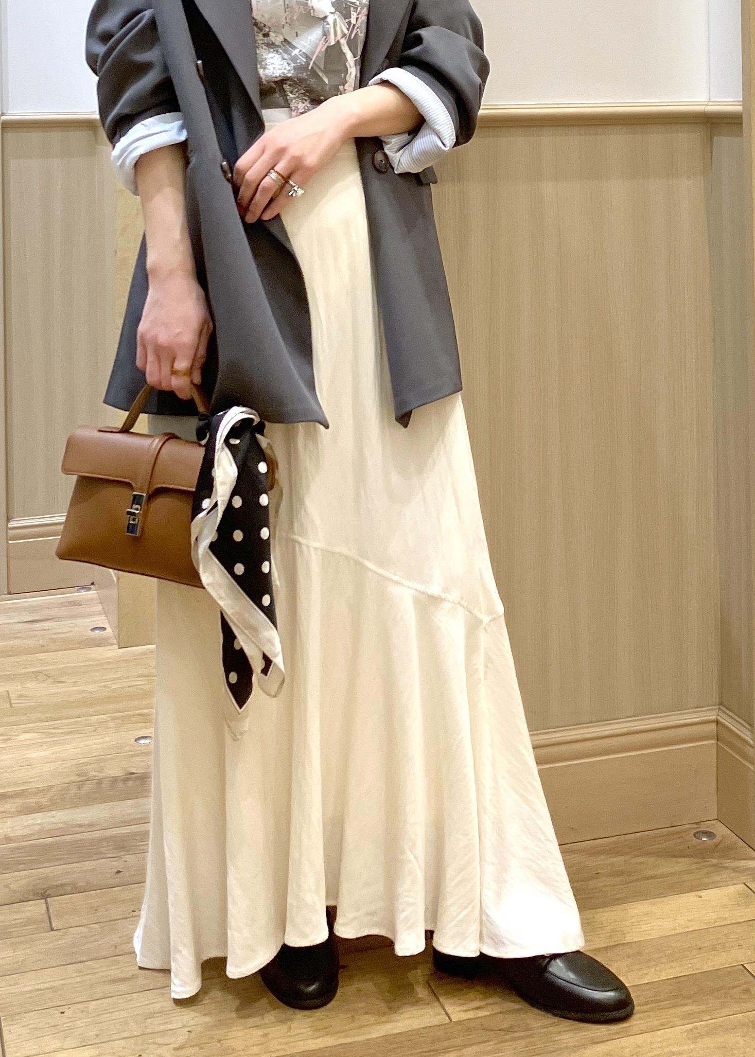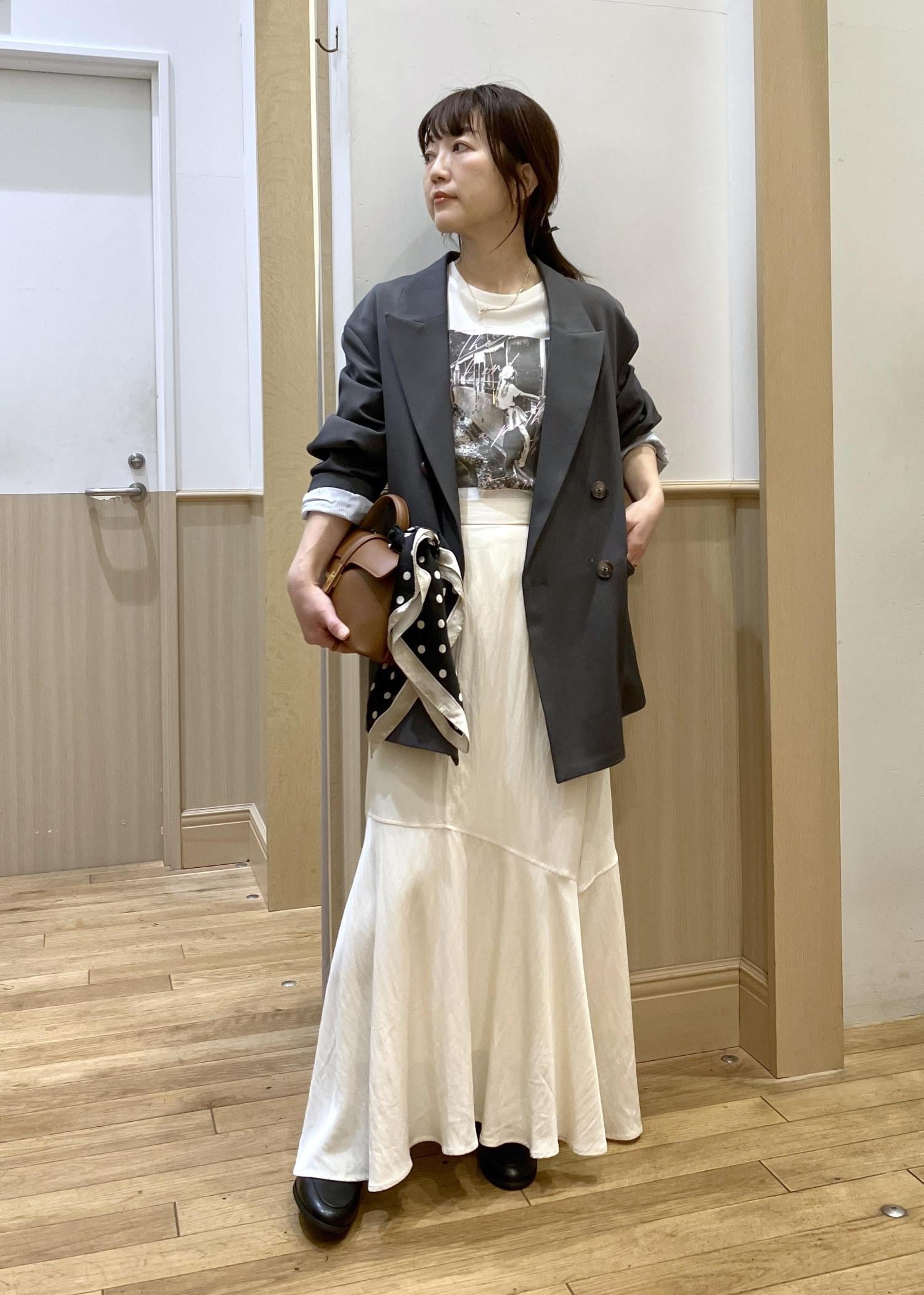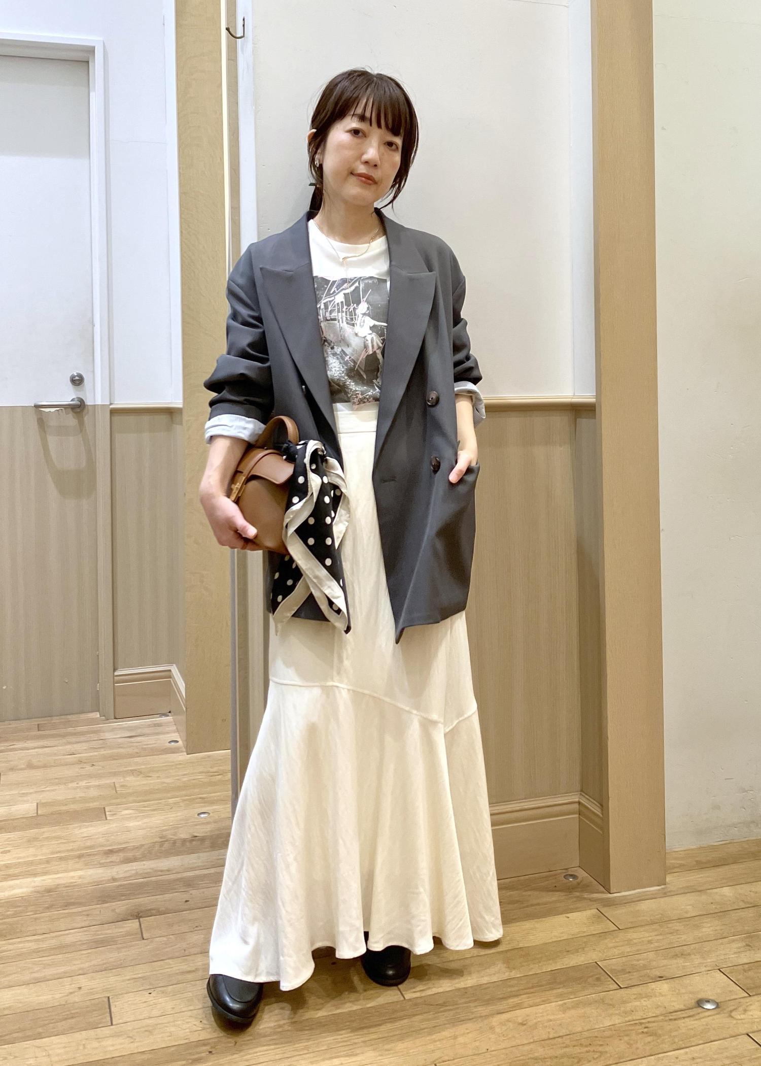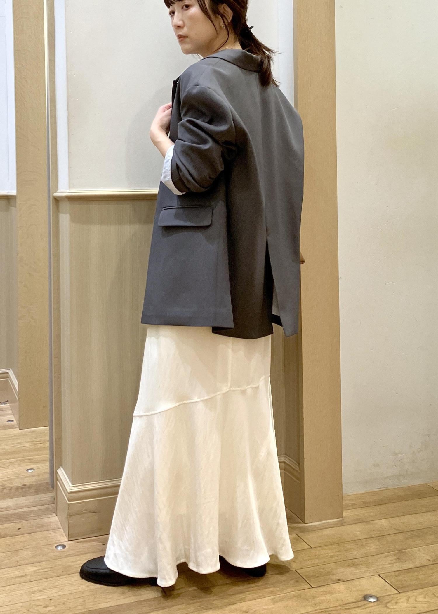 メンズライクなオーバーサイズのジャケットを敢えて女子感高めのスカートで甘めに合わせてみました。
