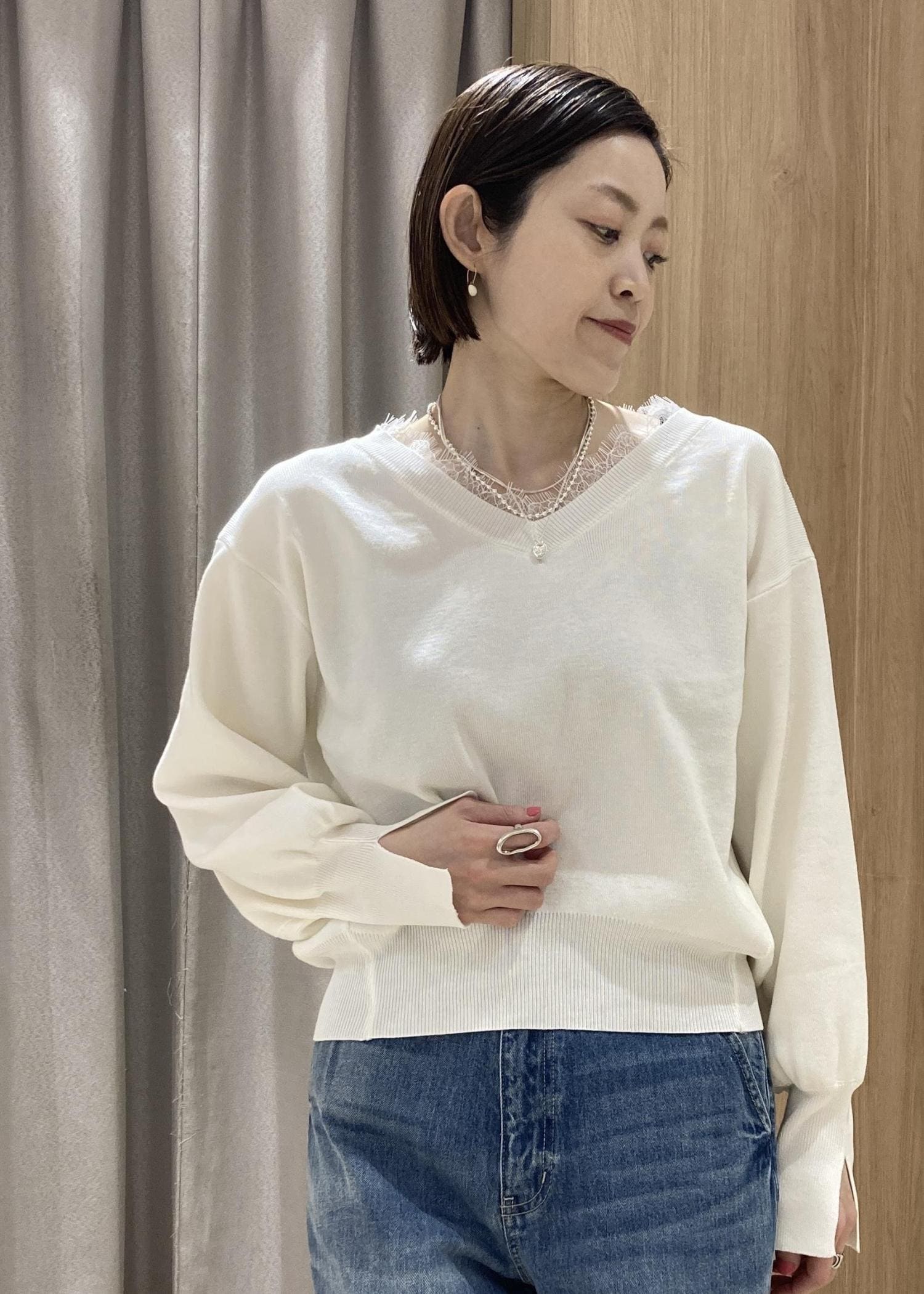 2BUY10%OFFVISVネックレースプルオーバーオフホワイト / F¥5,929レビュー繊細な襟元のレースが素敵な春ニット。