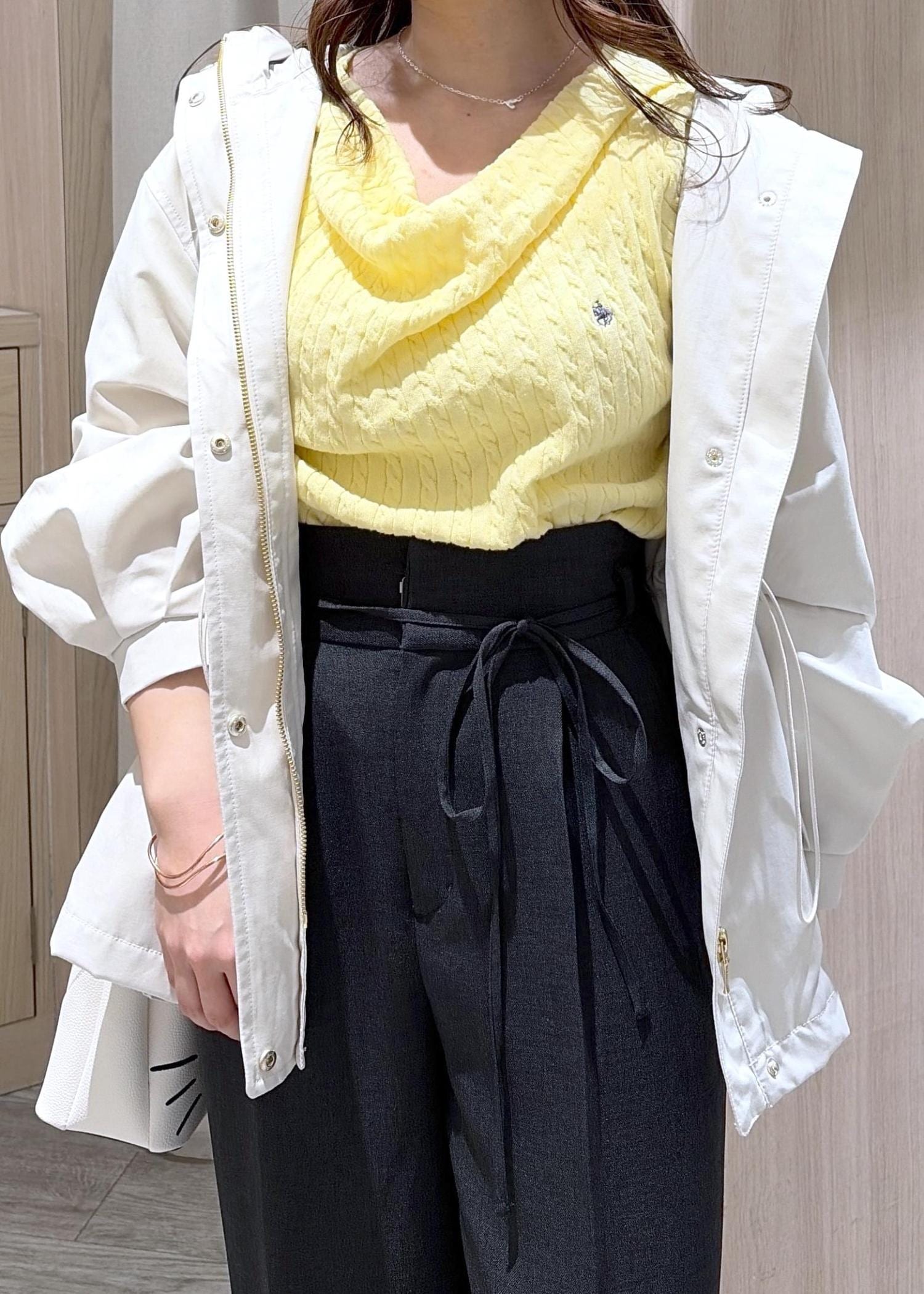 イエローのドレープニットとマウンテンパーカーをあわせた春のお出かけコーデです!