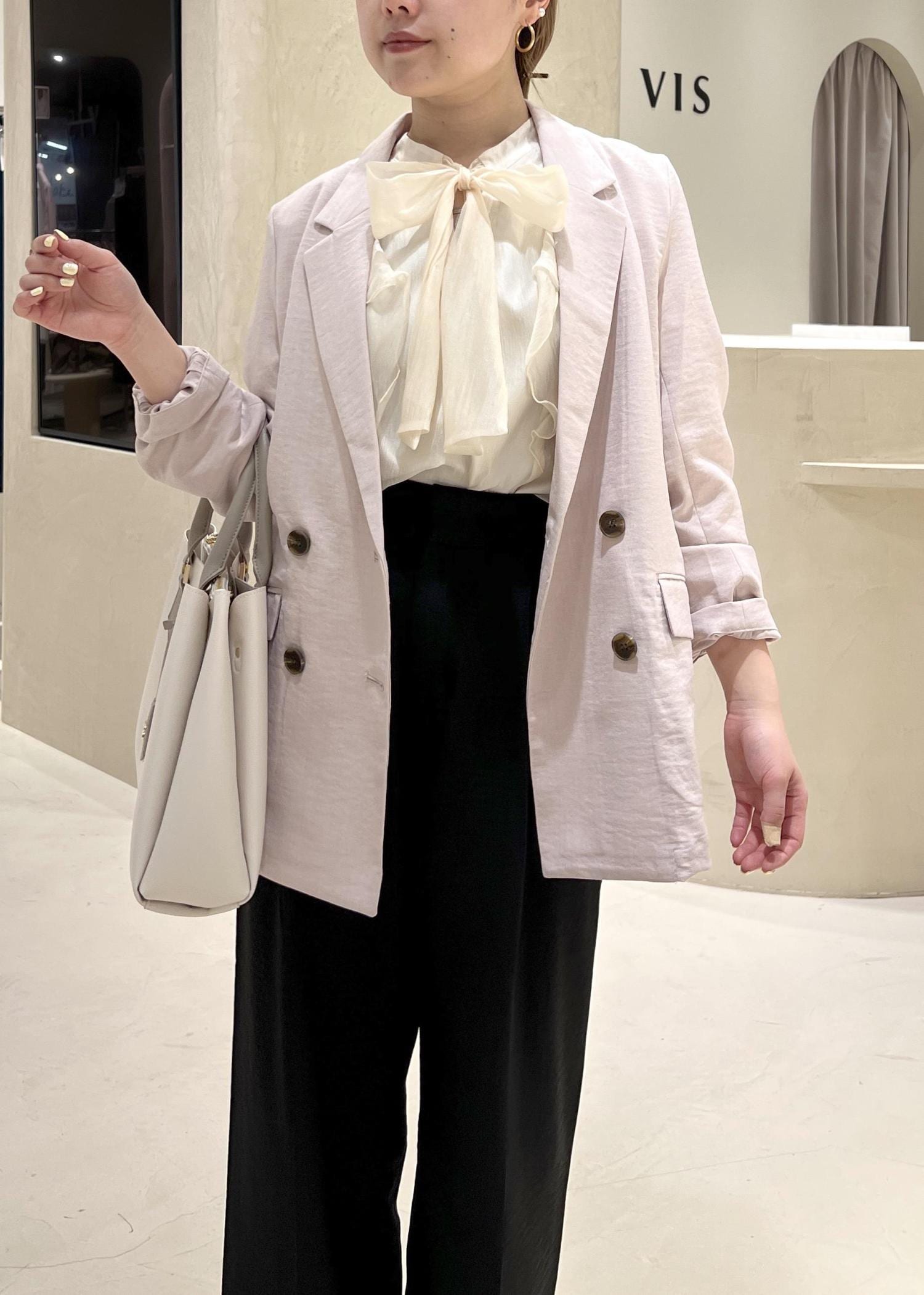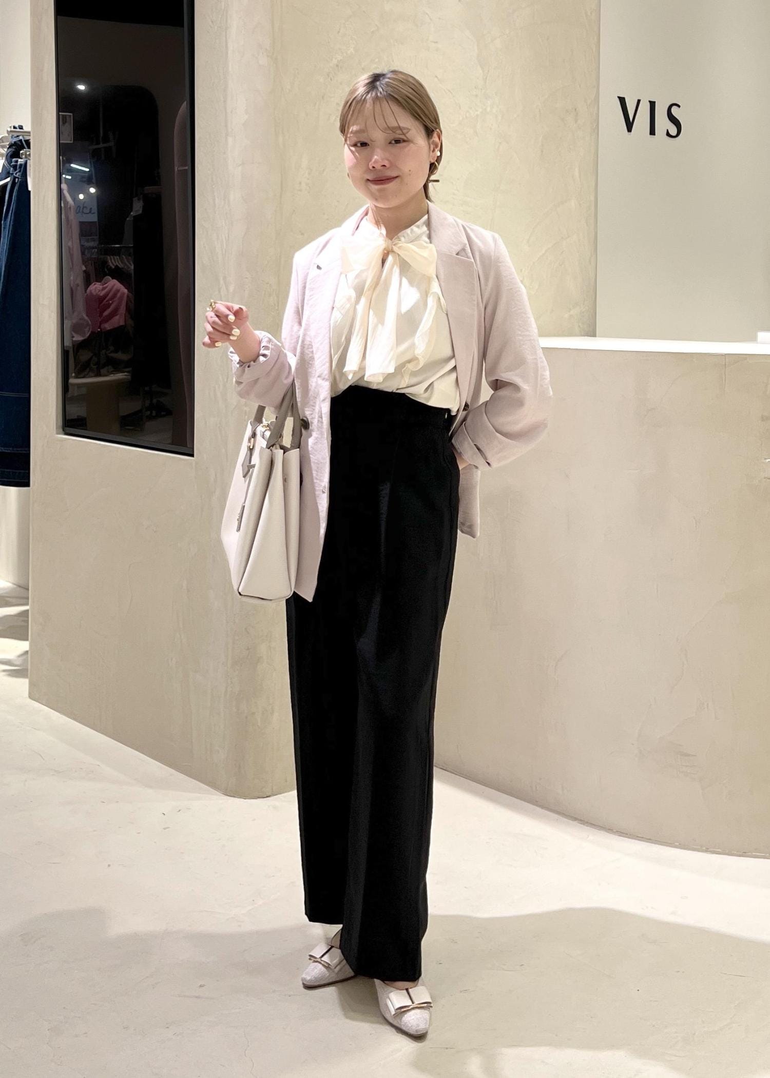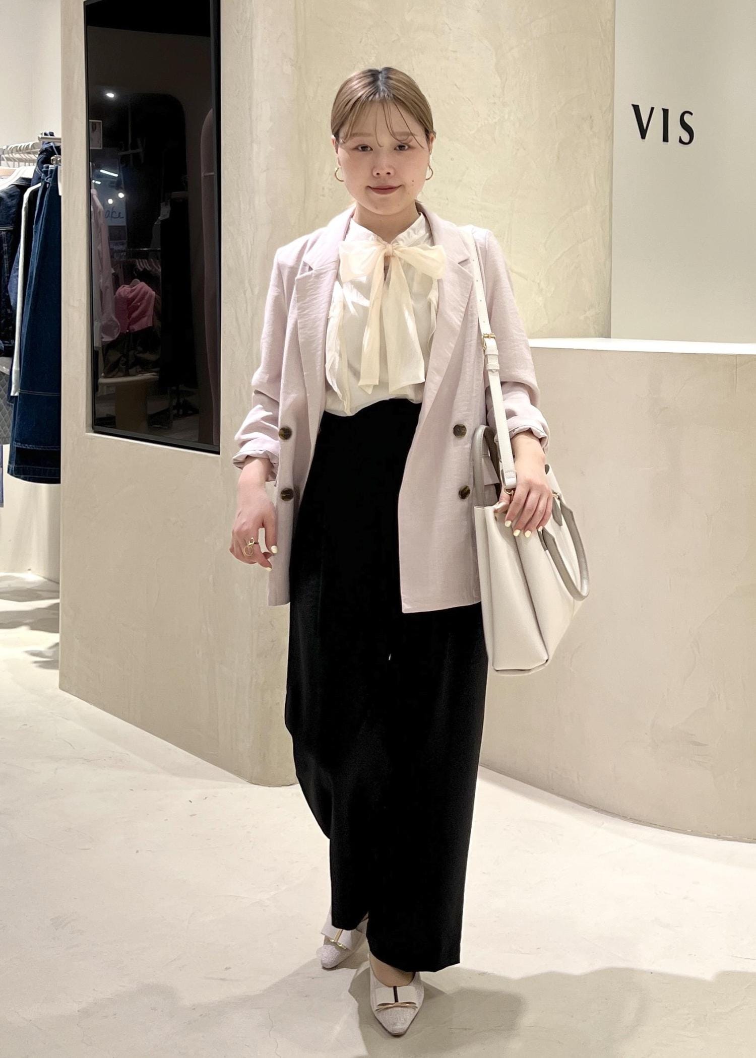 VISシャイニーボウタイ長袖ブラウス/イージーケア・2WAYキナリ / F¥5,929レビューリボンを前にフェミニンな雰囲気でも