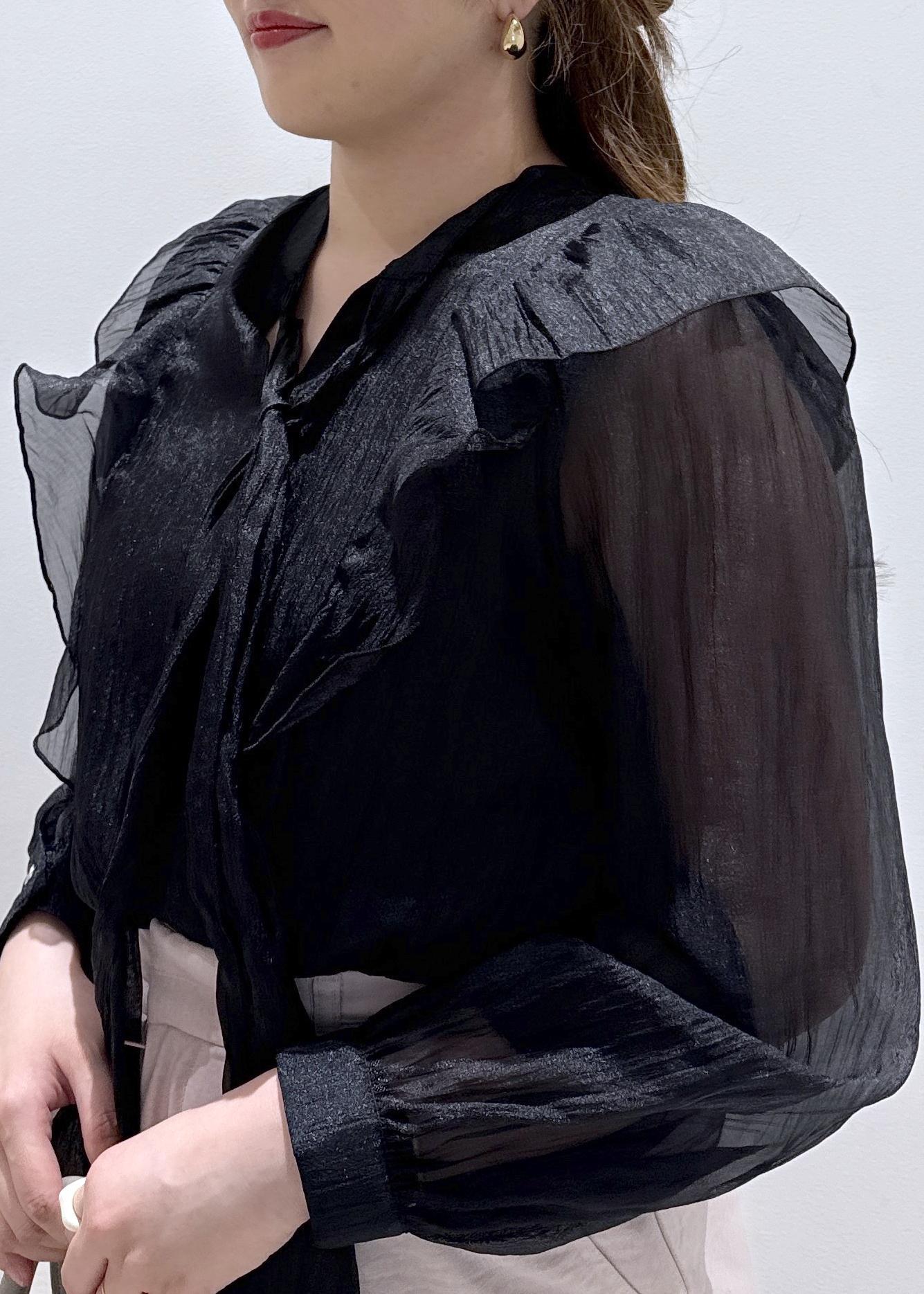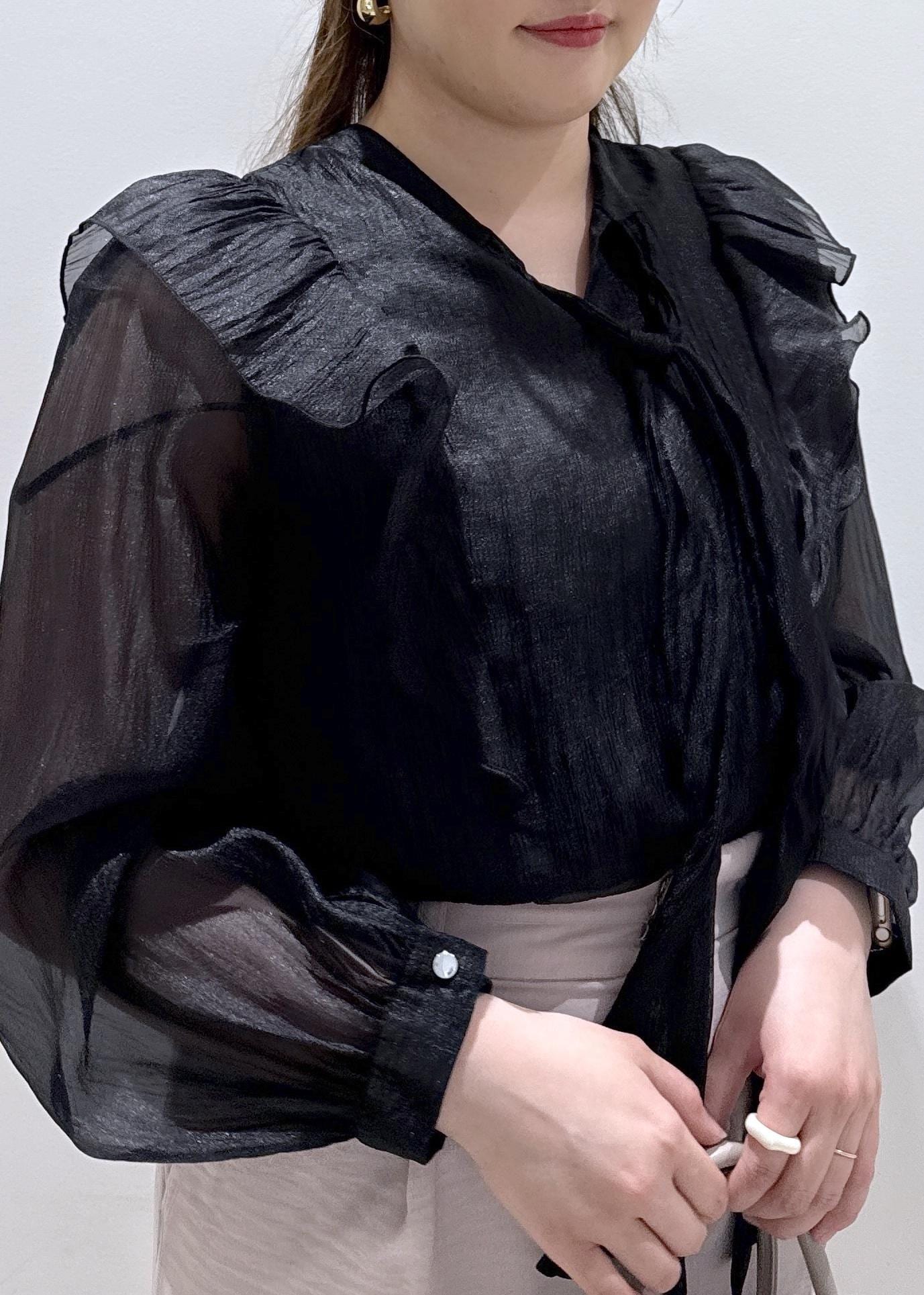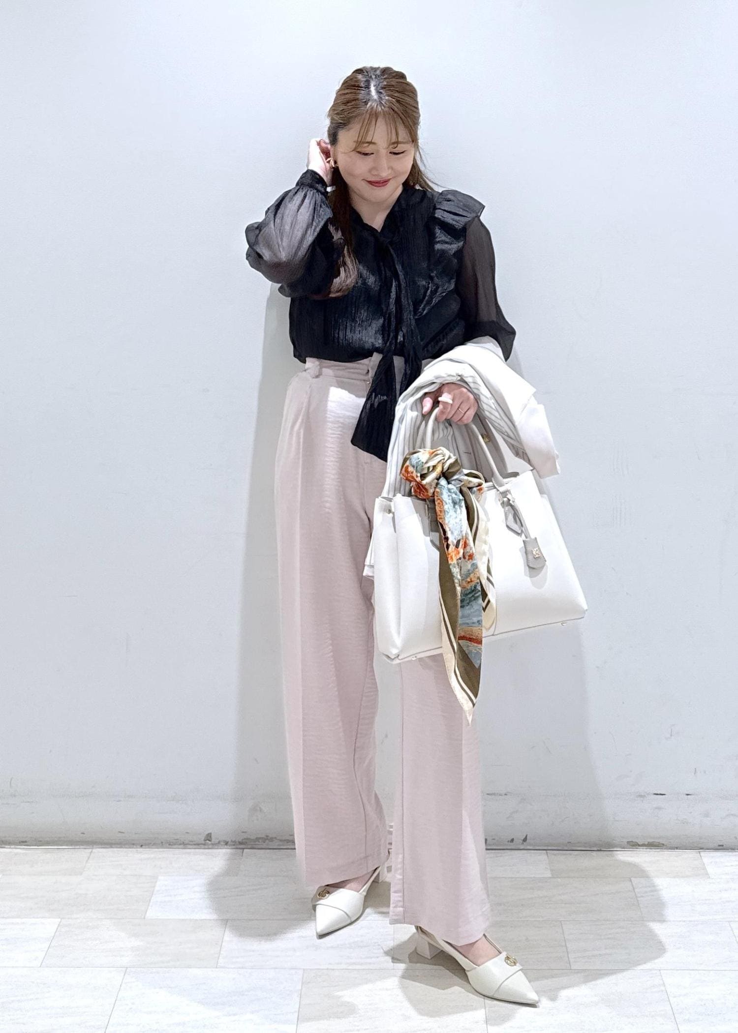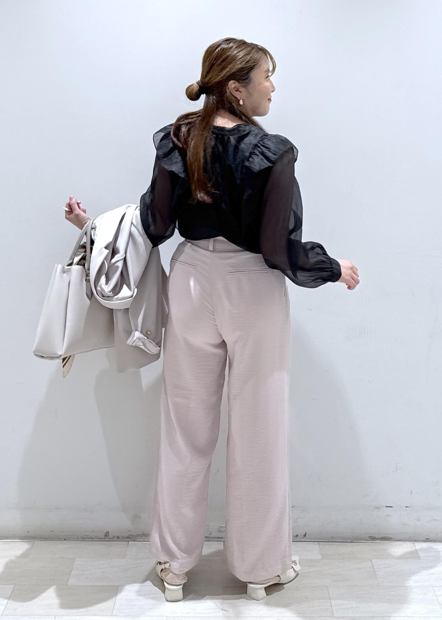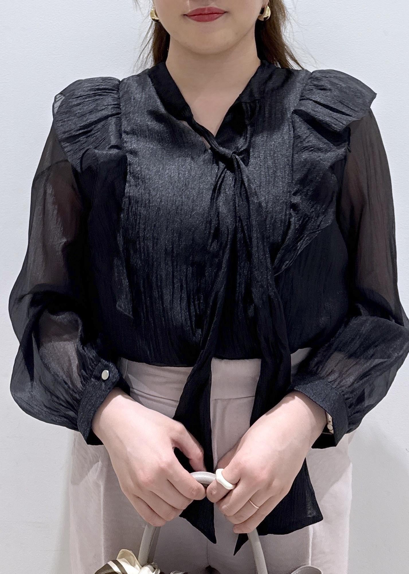 今回は新作で入荷しました、ブラックのシアーのボウタイブラウスにピンクのパンツと合わせて綺麗めなフェミニンコーデにしてみました!