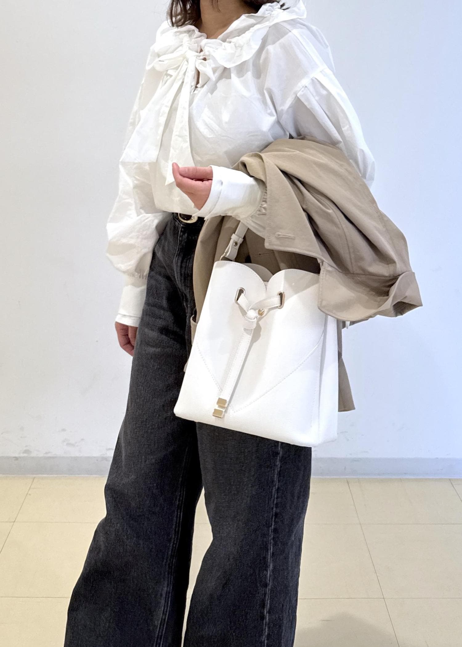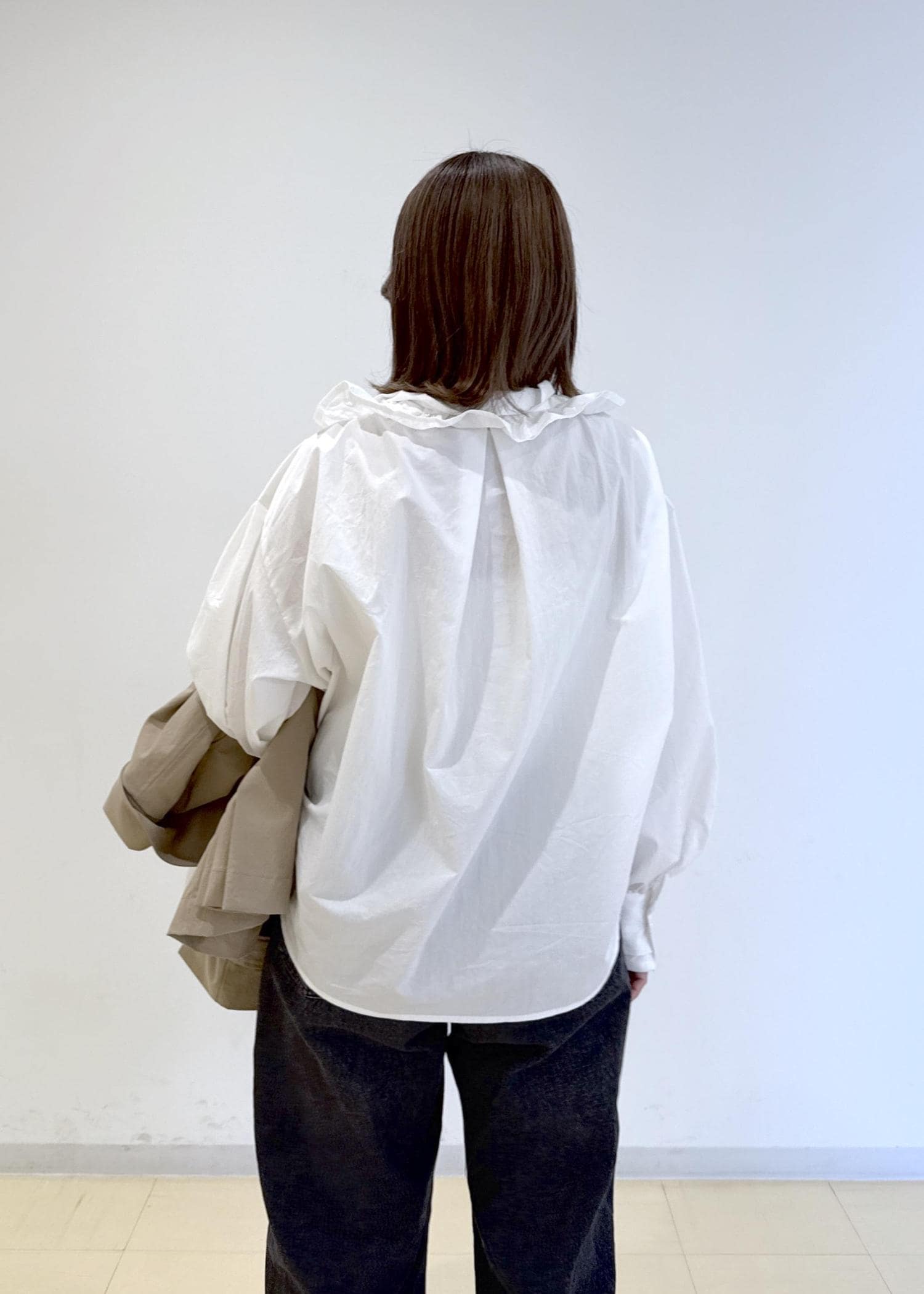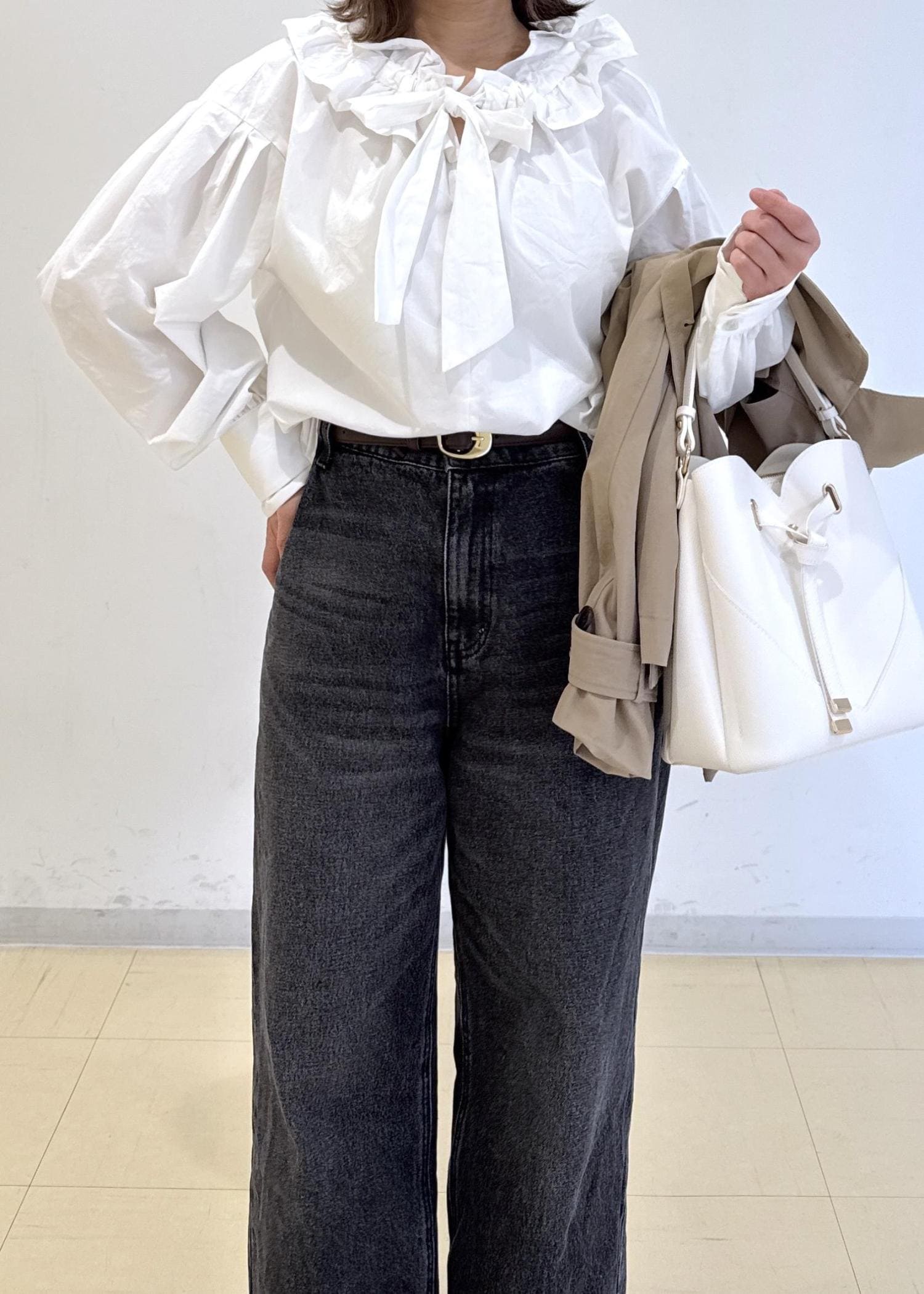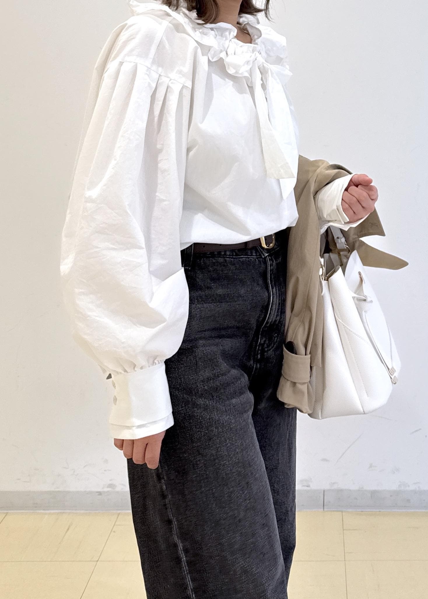 お袖のボリューム感や、襟ぐりのフリルが可愛く、1枚でも春らしく着られるブラウスです。