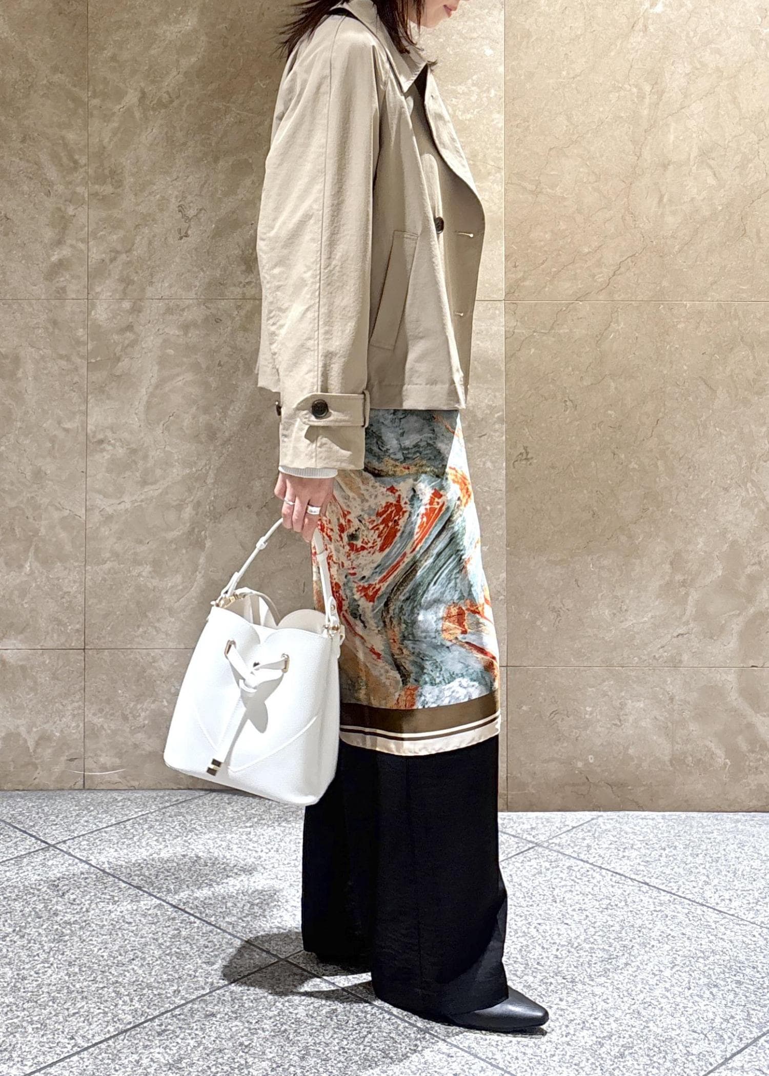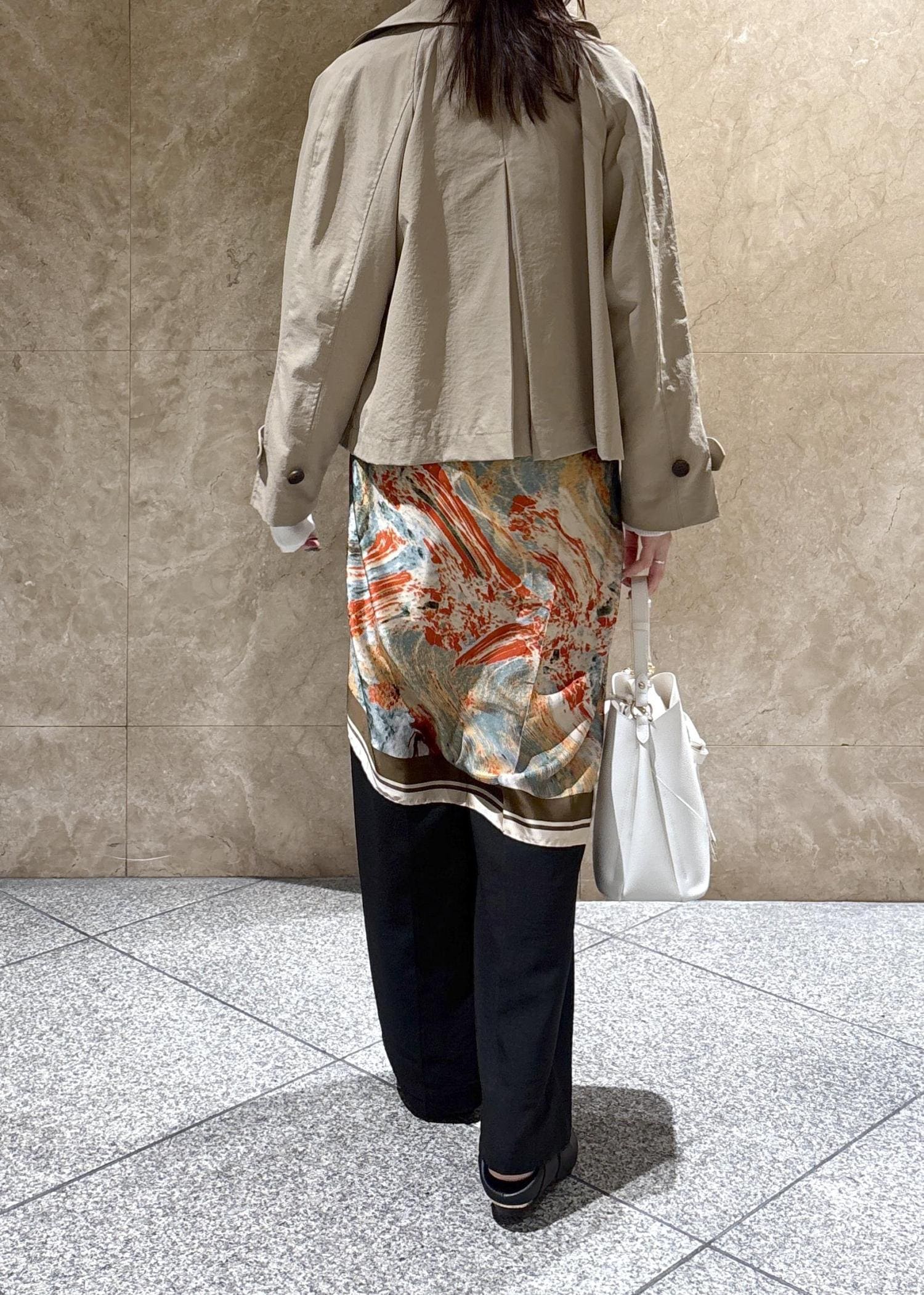 着丈はしっかりハイウエストで履くと踵が隠れる長さでフラットシューズでも下につかないくらいの長さです。 -