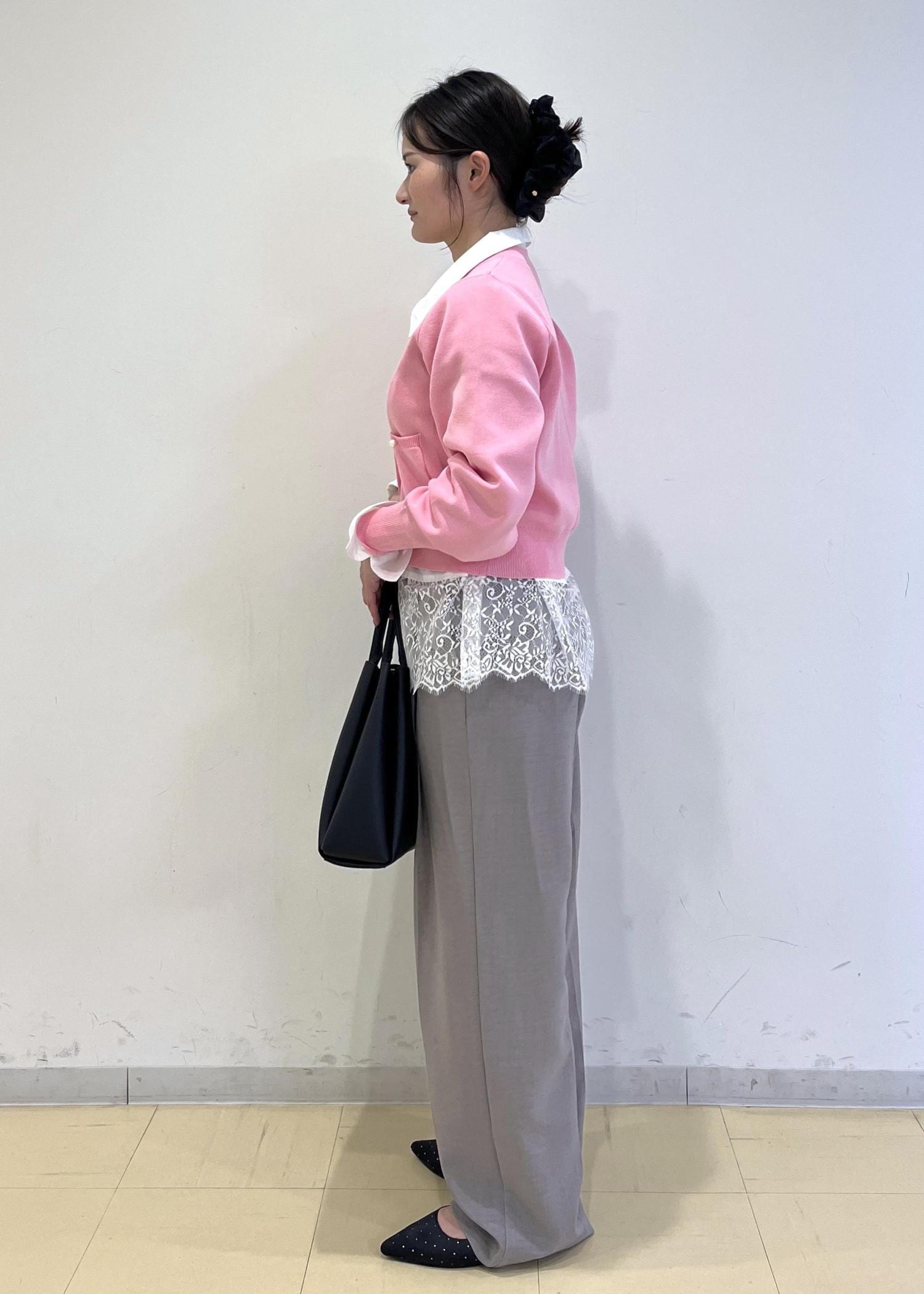 柔らかいグレーのパンツに、