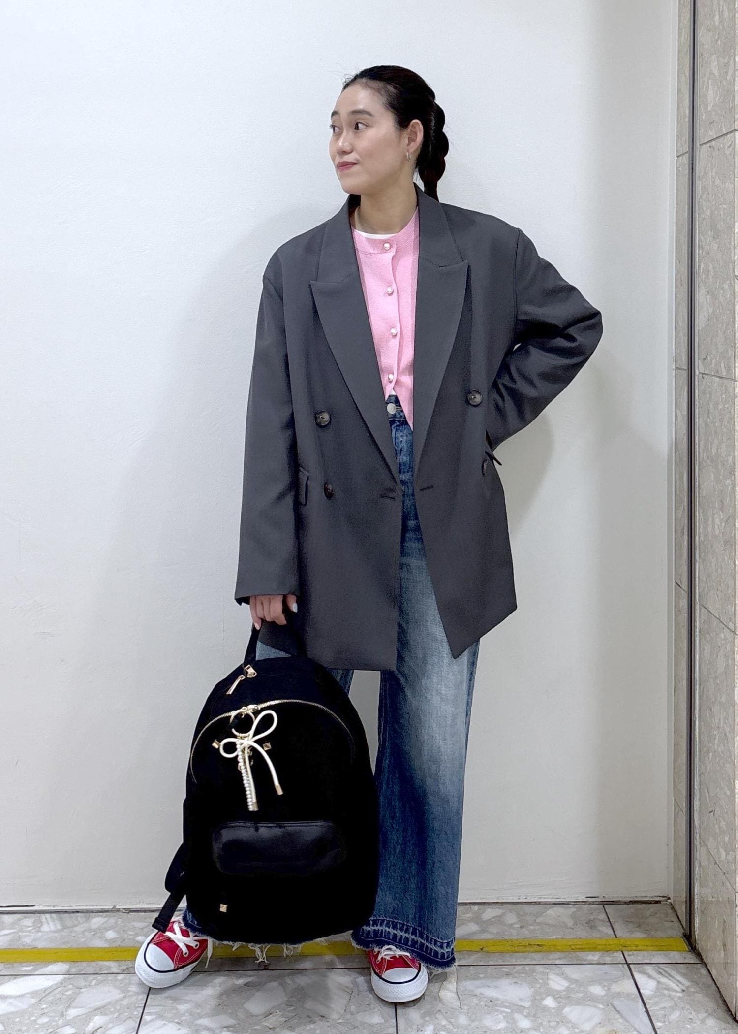 リボンのデザインが女性らしく、パンツスタイリングも華やかに見えます。