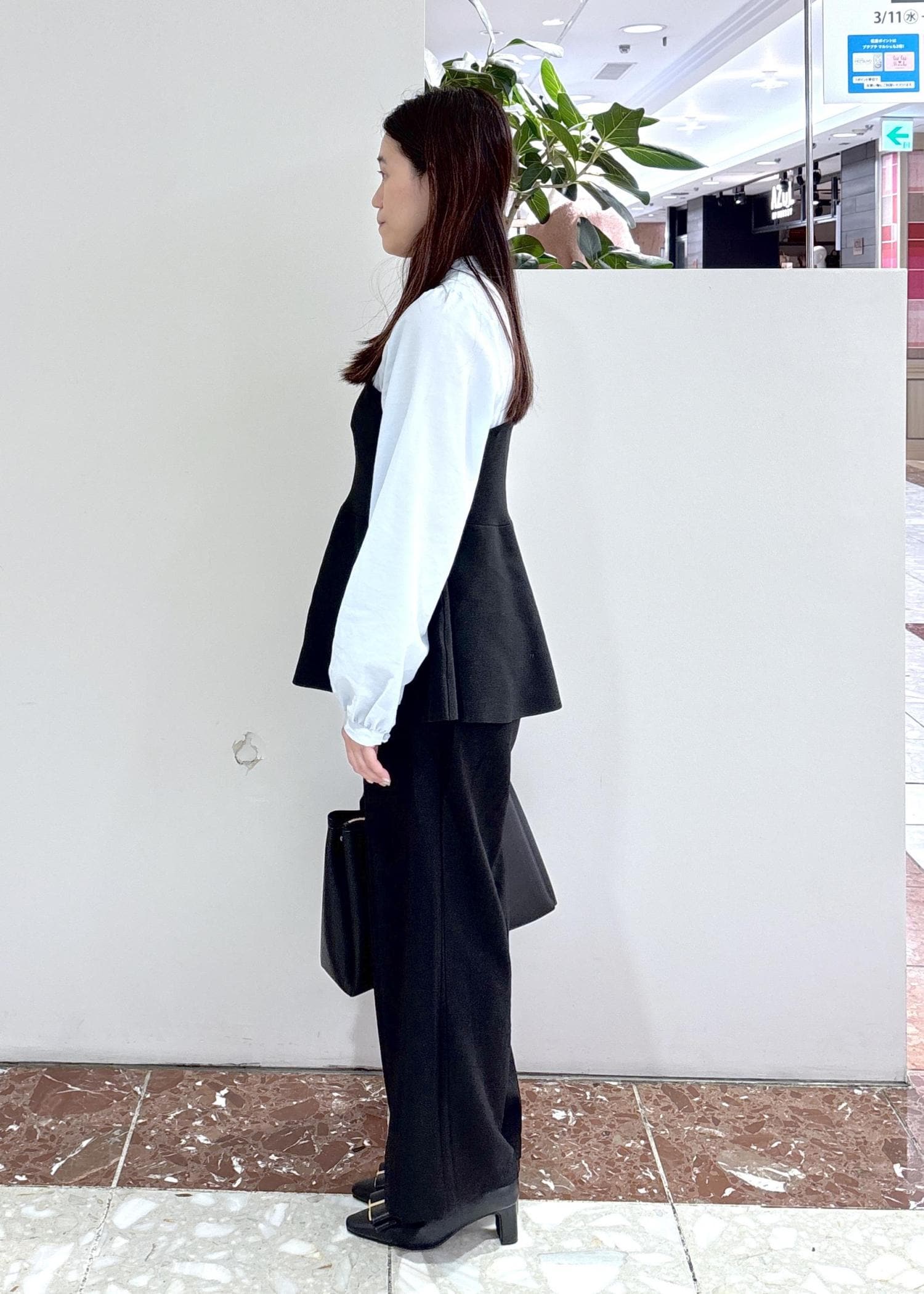 スニーカーのぺたんこ靴でもスッキリ着れます。 -