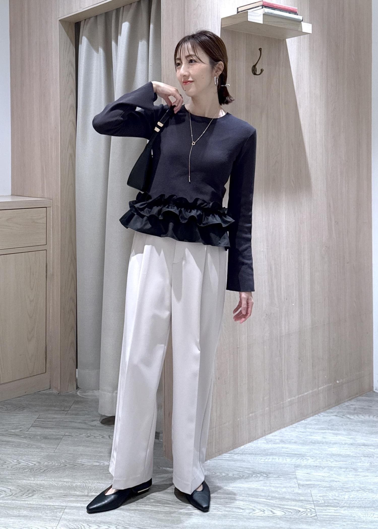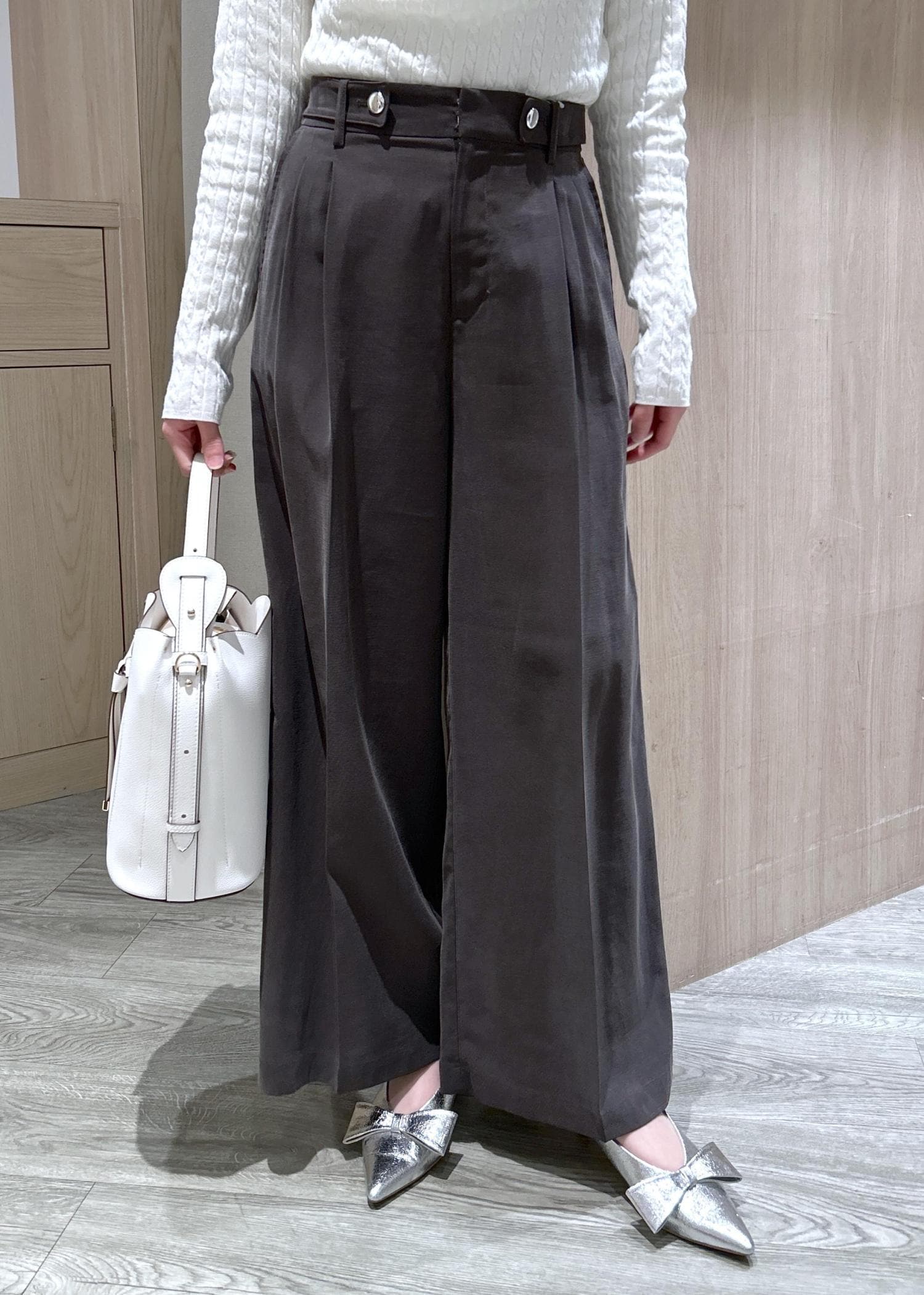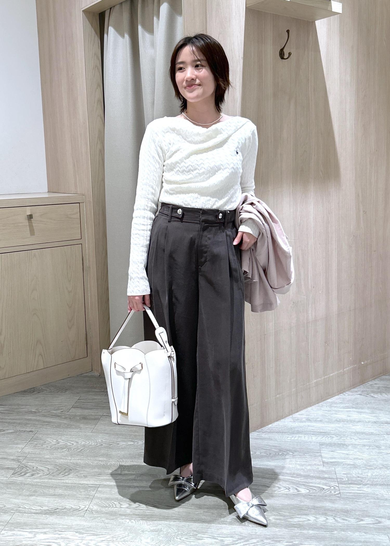 ドレープのトップスにワイドなシルエットのパンツを合わせキレイめな印象のコーデです!