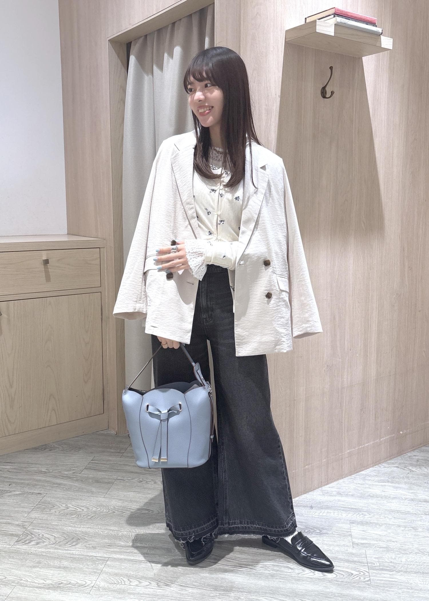 モノトーンなのでピンクのジャケットをプラスしカッチリしすぎなく柔らかい雰囲気に◎