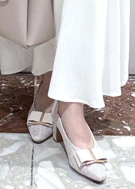 リボンのデザインが女性らしく、パンツスタイリングも華やかに見えます。