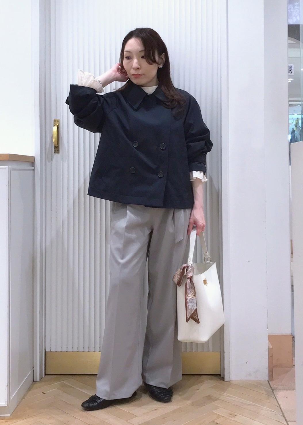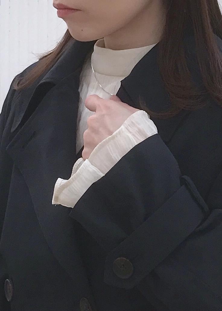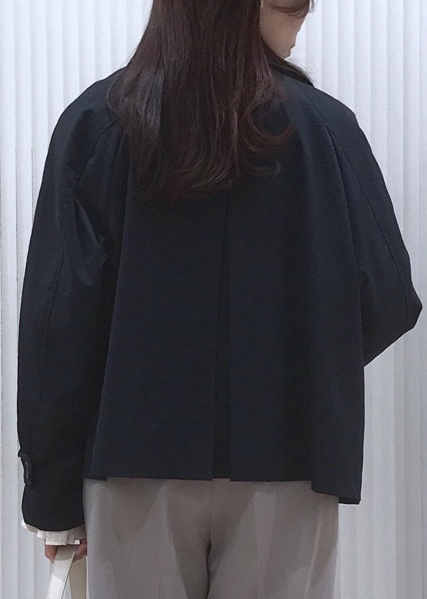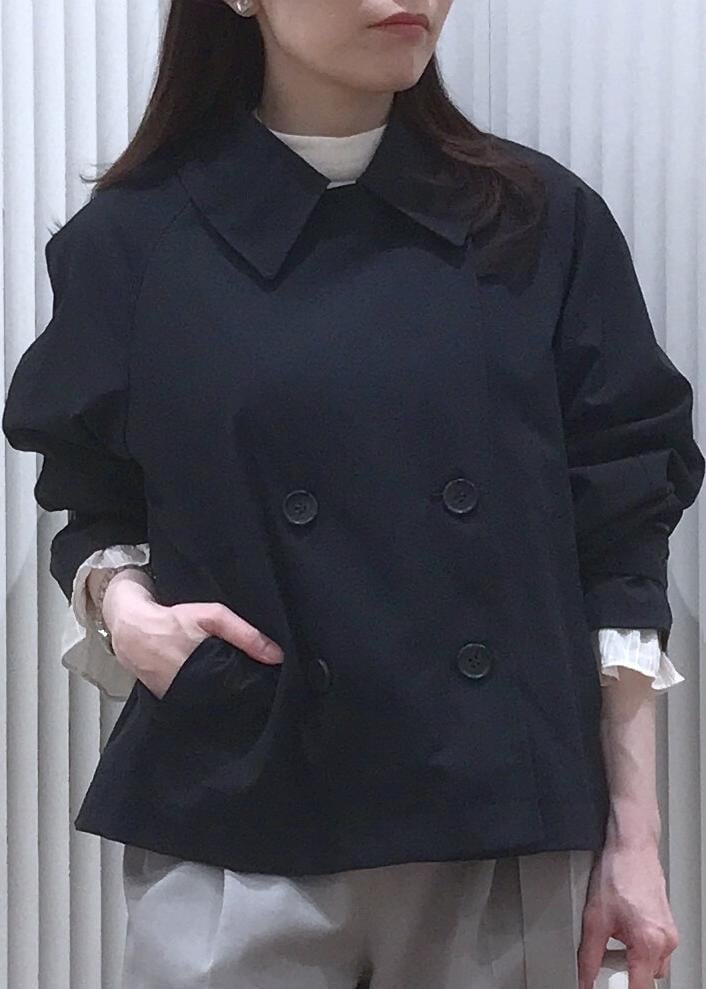 ブラウス×きれいめパンツのベーシックな通勤コーデをショートトレンチで鮮度良く。