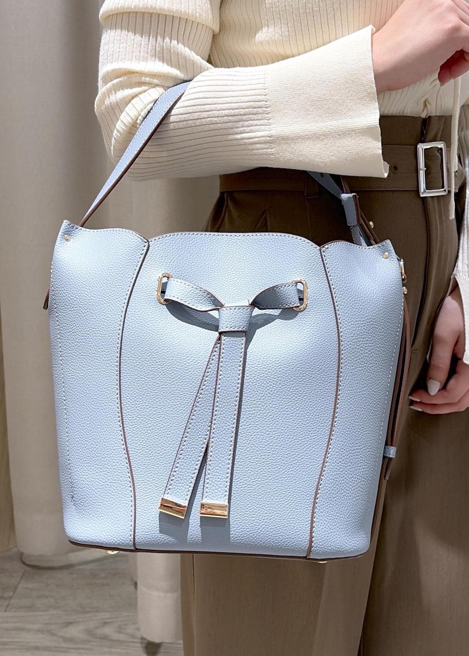バッグは差し色でサックスカラーを取り入れています!