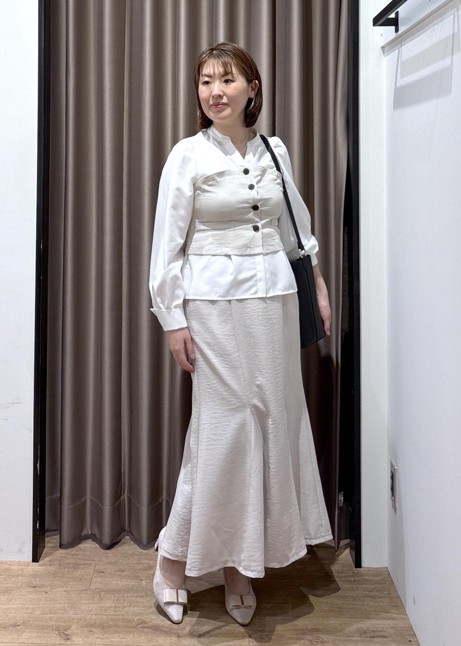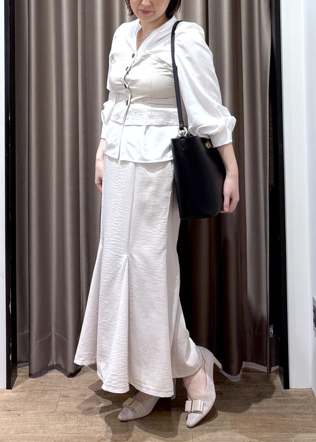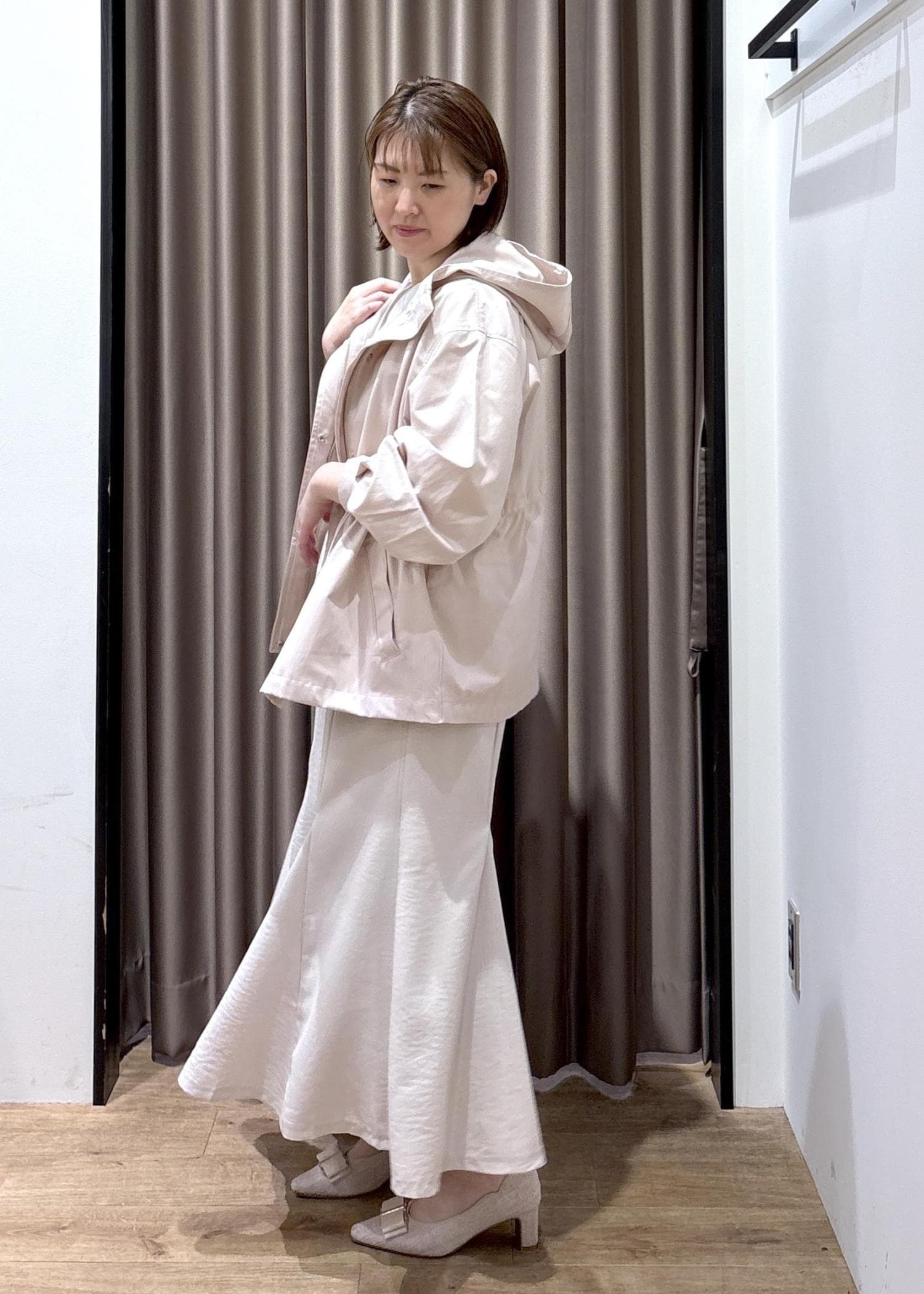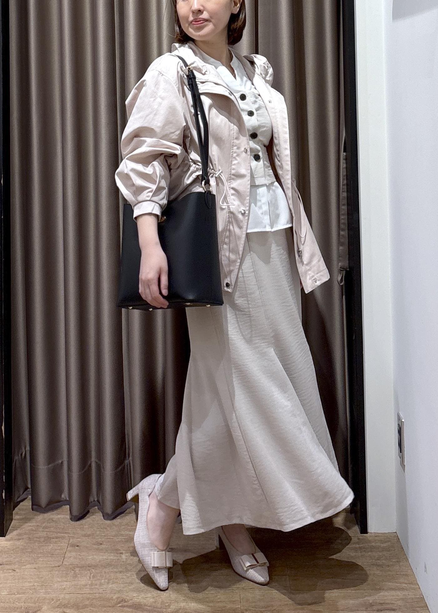 美easyのマーメイドスカートとブラウスのセットアップでお仕事コーディネートを組んでみました!春らしくベージュを選び明るい印象に!またVIS人気のウエストマークナイロンジャケット(マウンテンパーカー)は通勤時のアウターとしておすすめです!