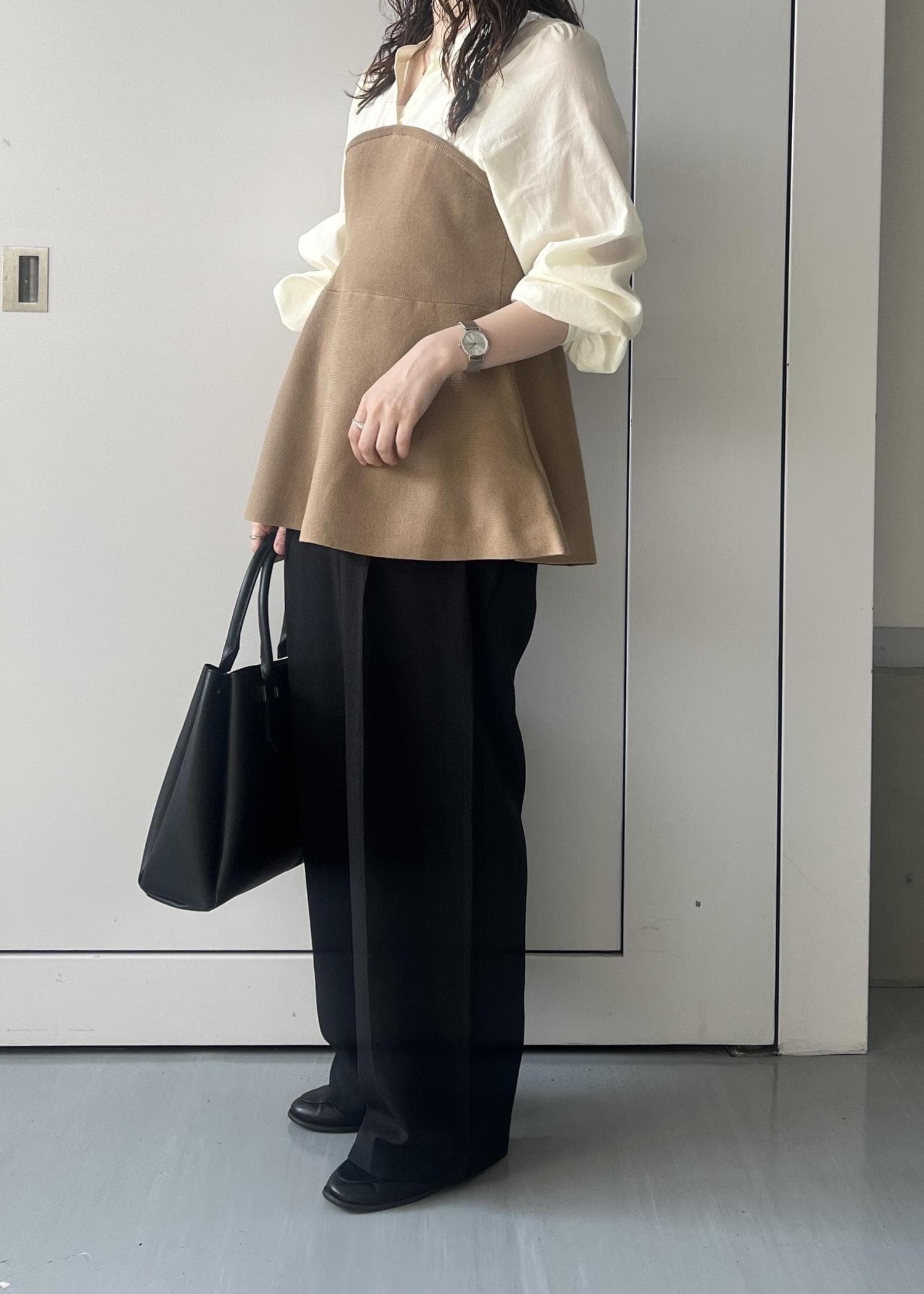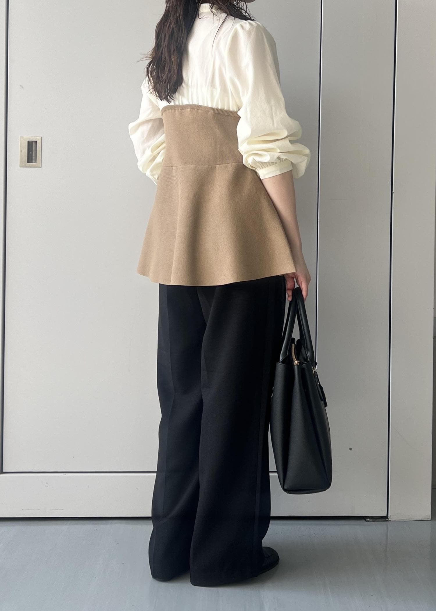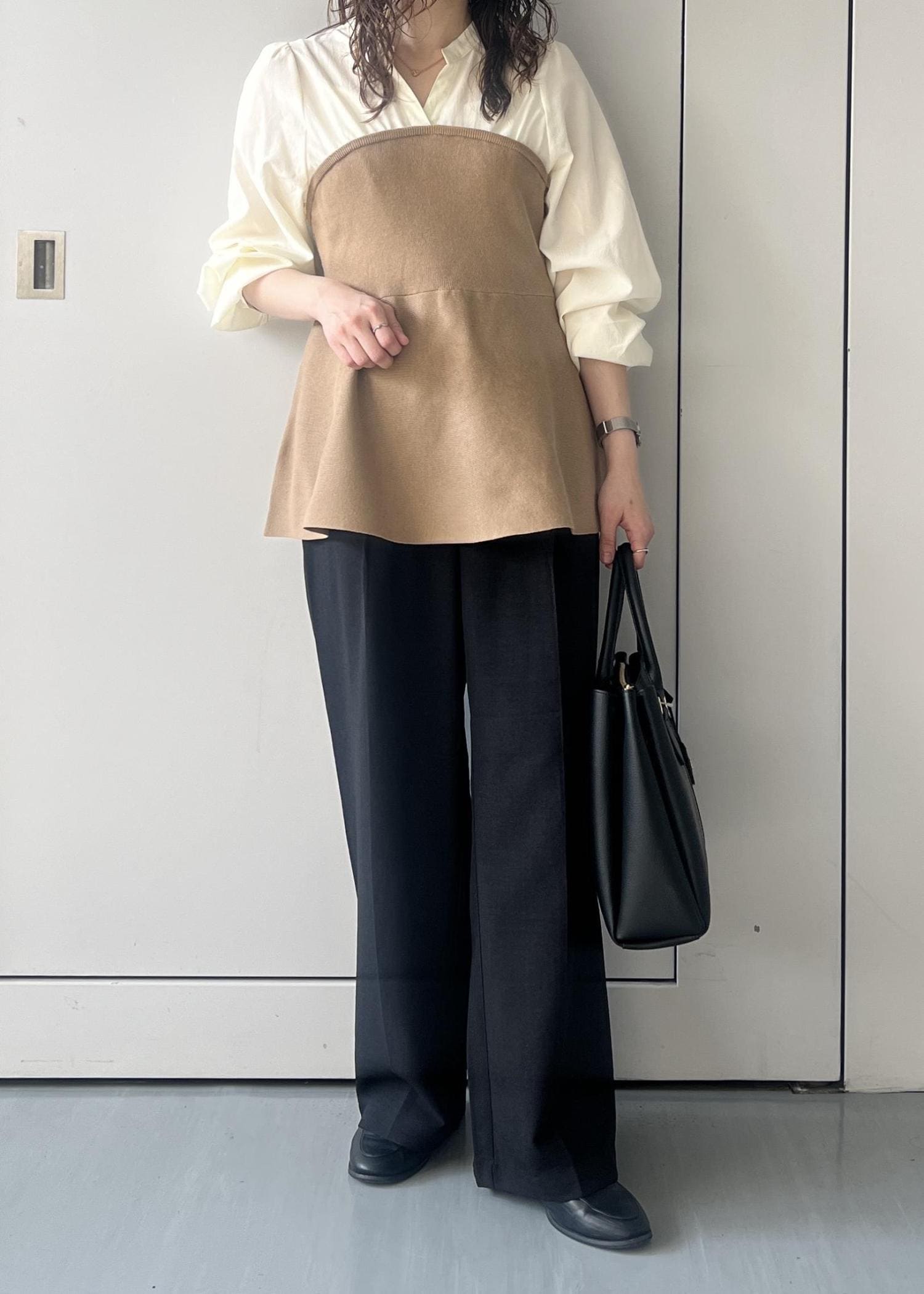 2BUY10%OFFVISペプラムニットドッキングブラウスベージュ / F¥5,271レビュー152cmでお尻が隠れる着丈。キーネックが首元すっきりにみせてくれます。ペプラムのシルエットが1枚で着映えします✨