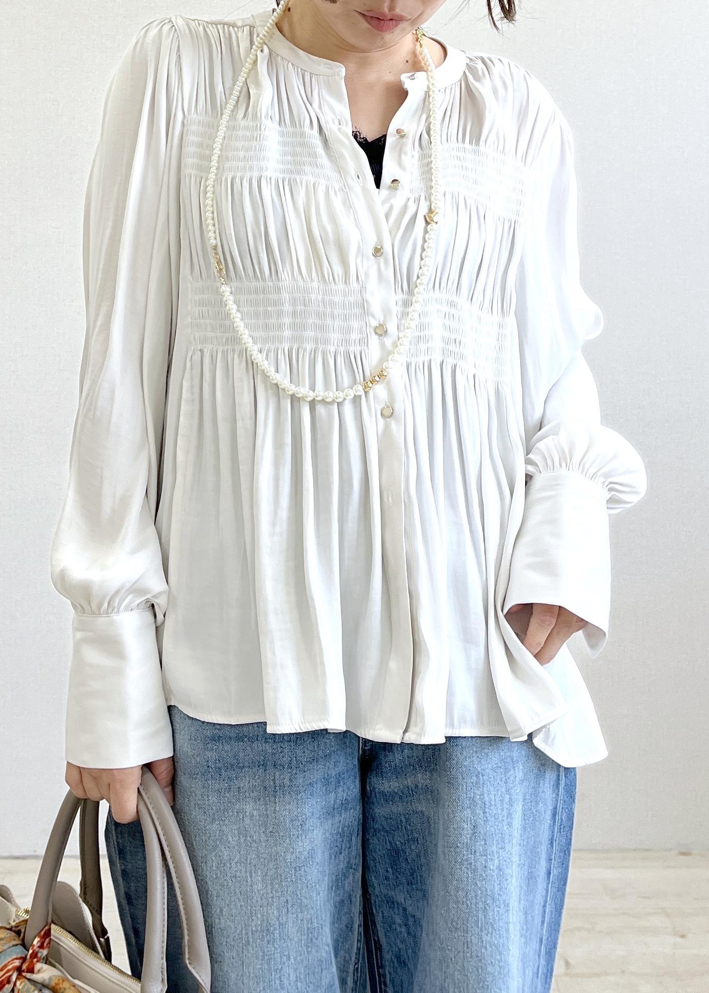 2BUY10%OFFVISエアリーサテンシャーリングブラウス/イージーケアキナリ / F¥5,489レビュー152cmでFサイズ着用し、着丈はお尻が隠れる丈。トロミのある素材感でとっても上品な落ち感のあるブラウスです。毎年定番で人気のあるシリーズです。タポッとしたボリュームのあるお袖が個人的に好きなポイント。デニムでもキレイめに合わせてもどちらのスタイリングにもお勧めな着回し力抜群なトップスです!
