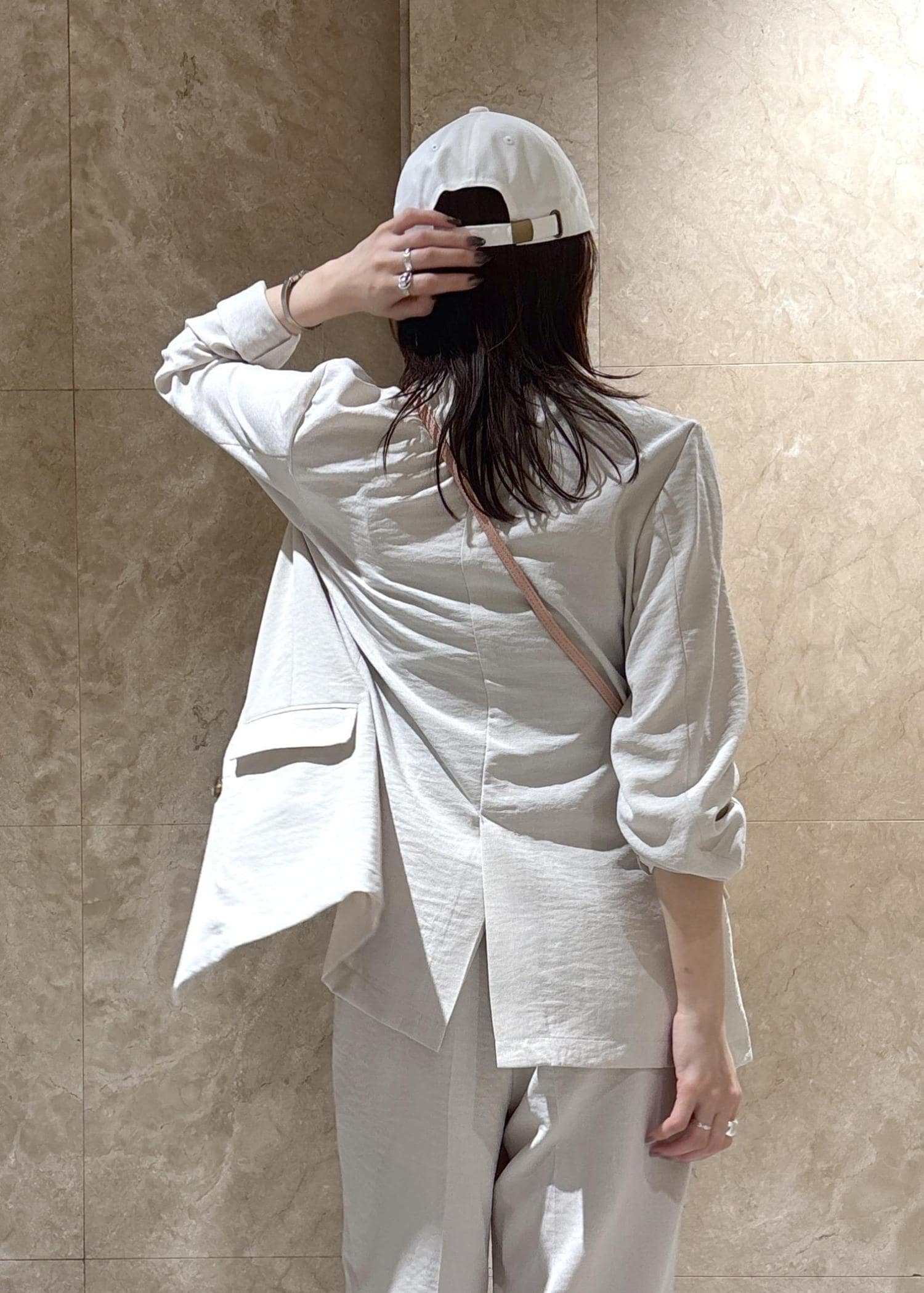 オーバーサイズですが、裏地もなくテロっとした落ち感で、袖をまくるとこなれ感もあり、スッキリかっこよく着られます。 -