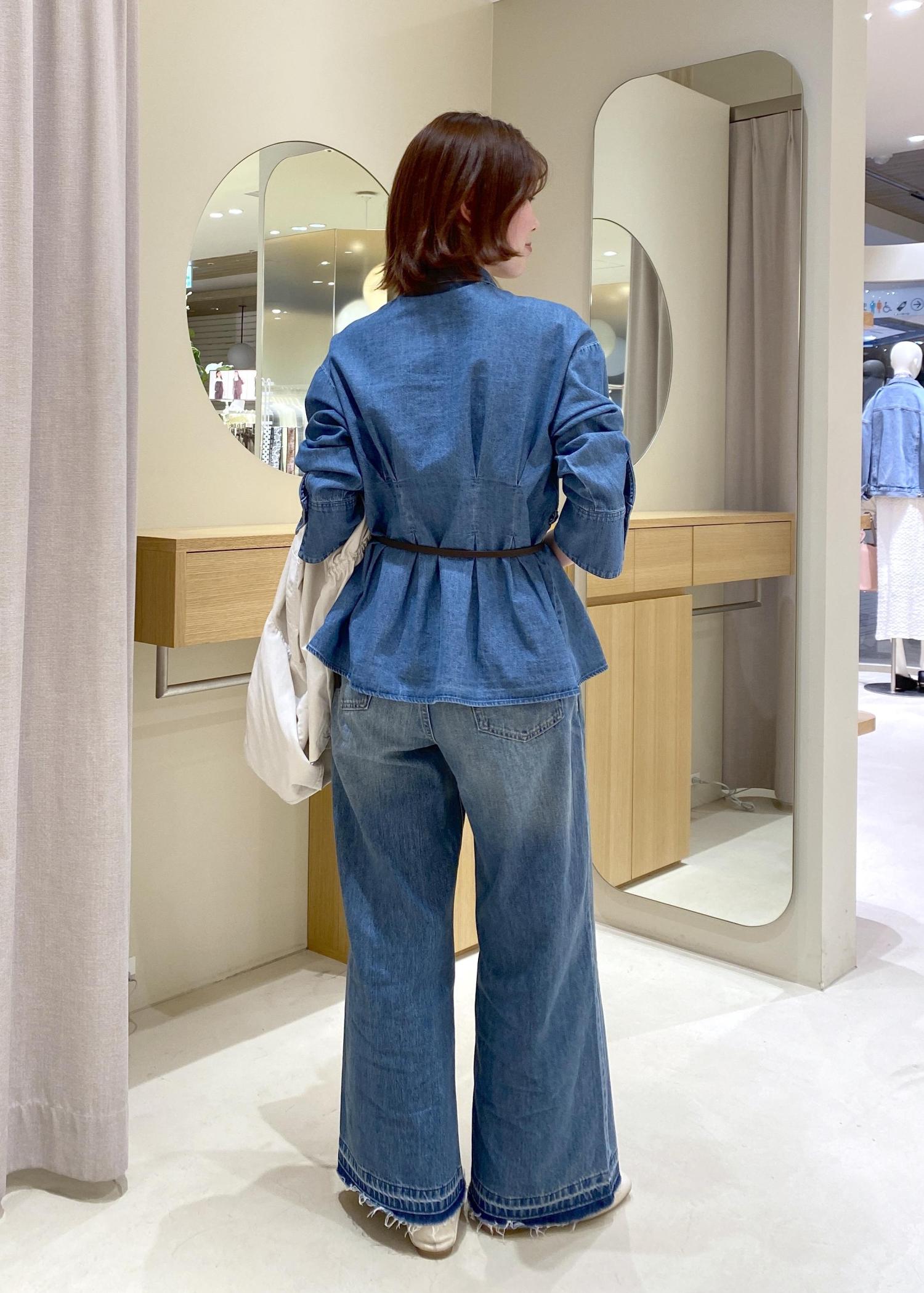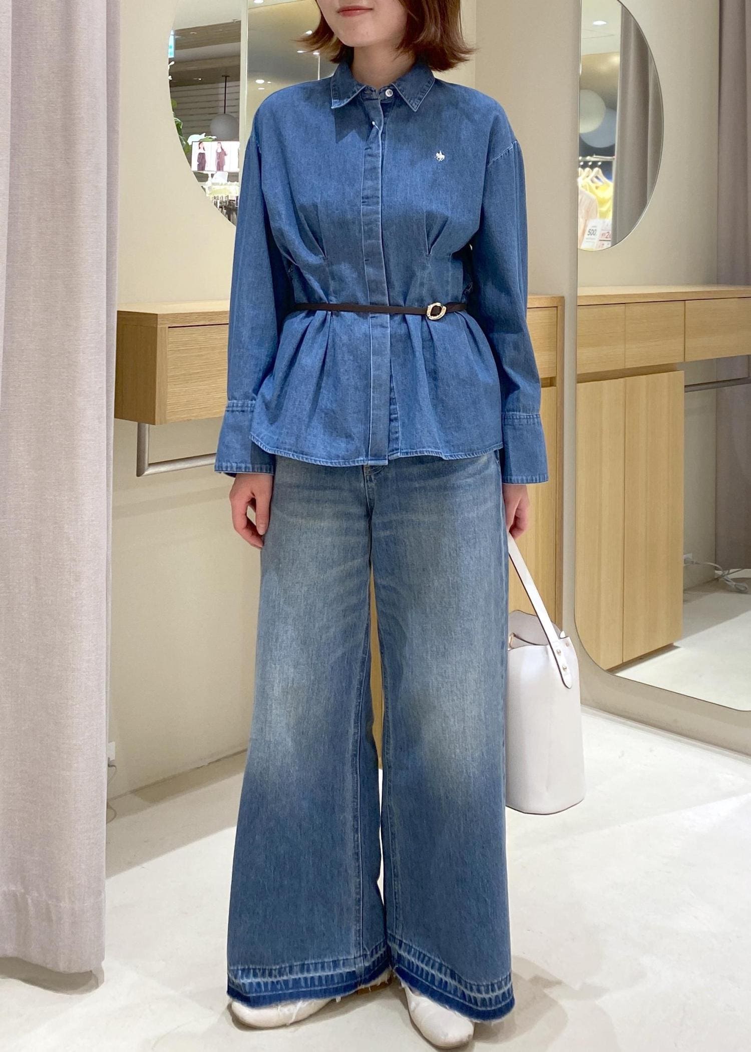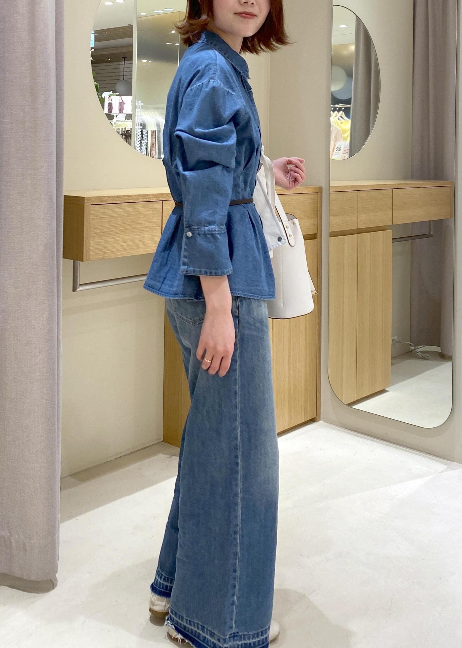 トップスボトムスをブルーの色味で統一し、縦のラインを意識した春のデニムお出かけコーデです!