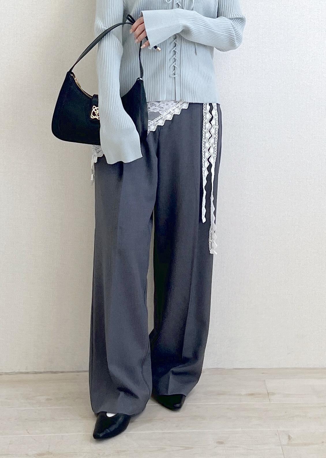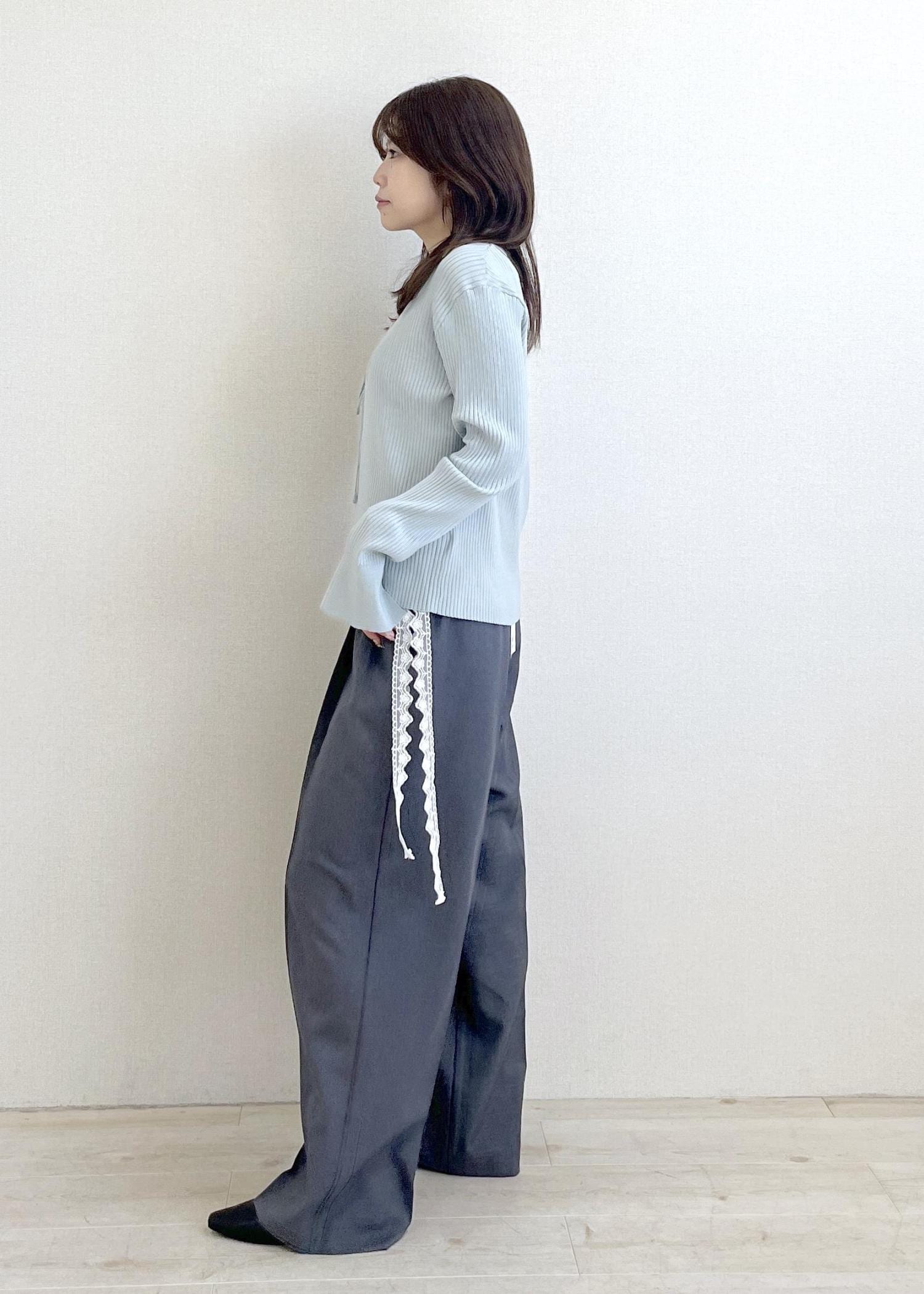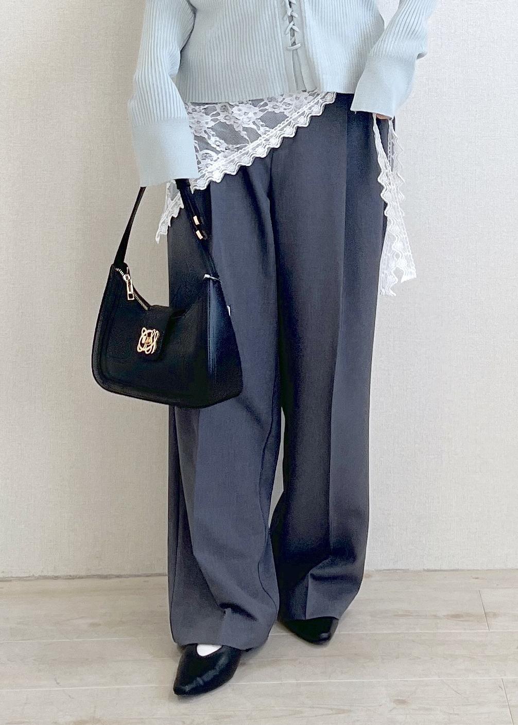 ツータックで太もも周りはゆったりめですが、落ち感のあるシルエットなのでストレートに近くすっきりとしたシルエットです。