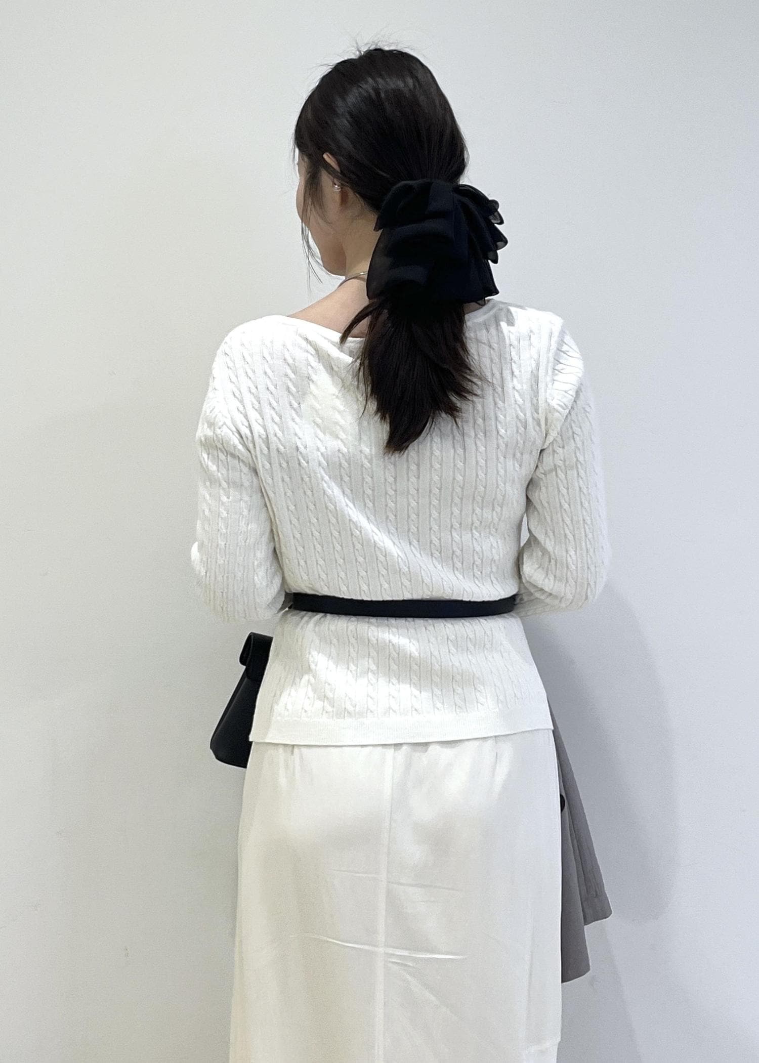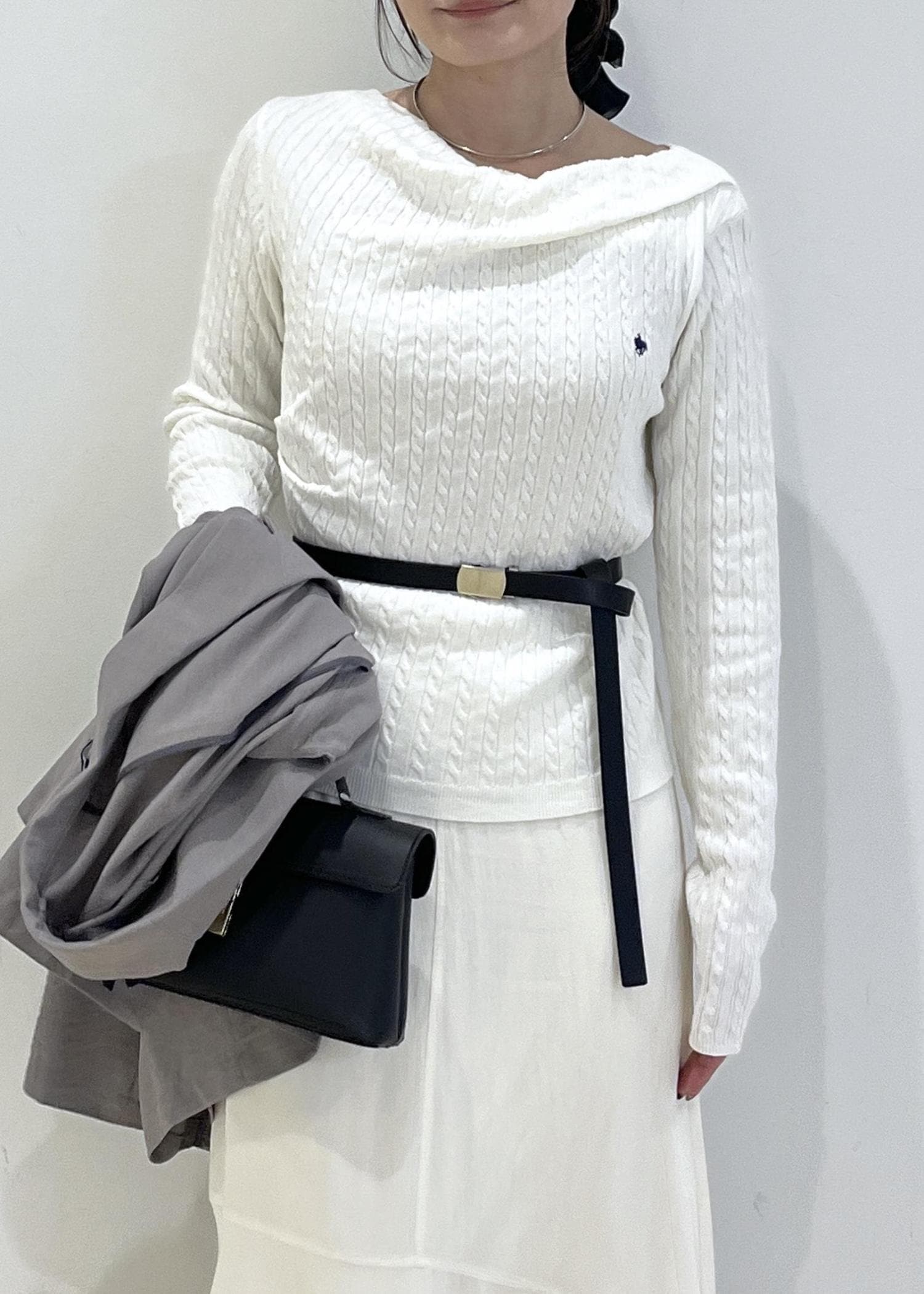 首元のドレープと、ケーブル編み×ワンポイントのデザインがシンプルすぎないので、1枚でも映えます。