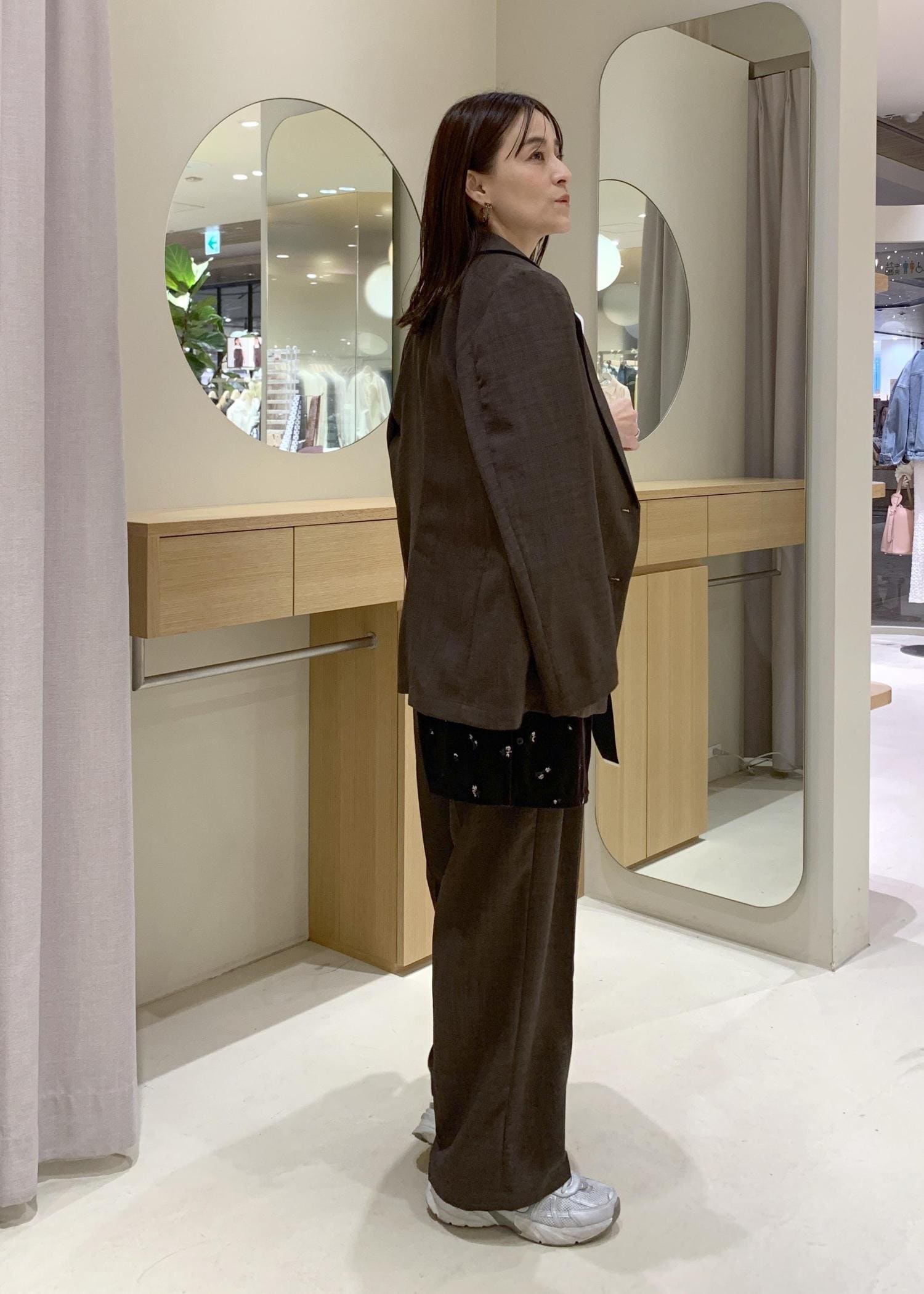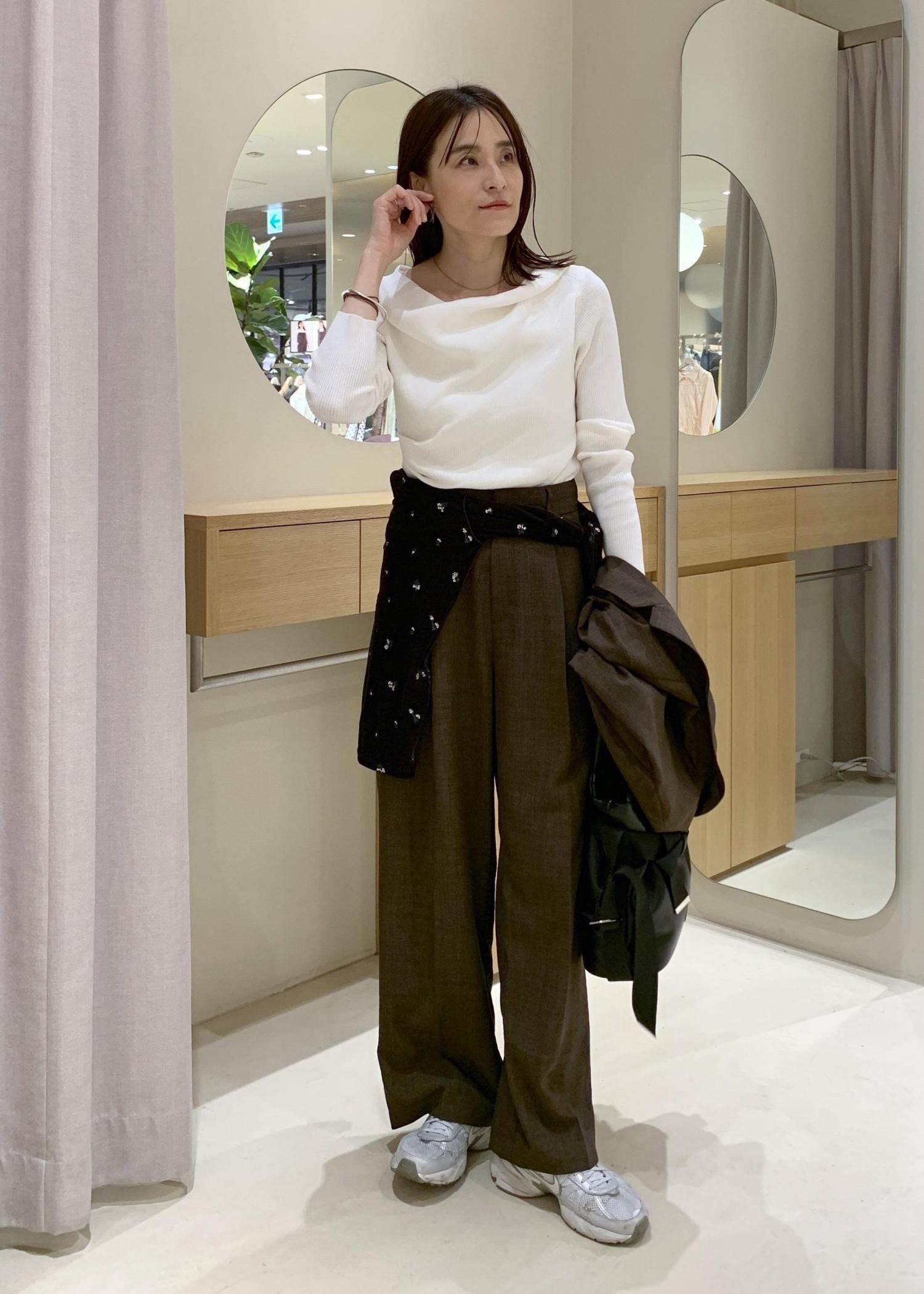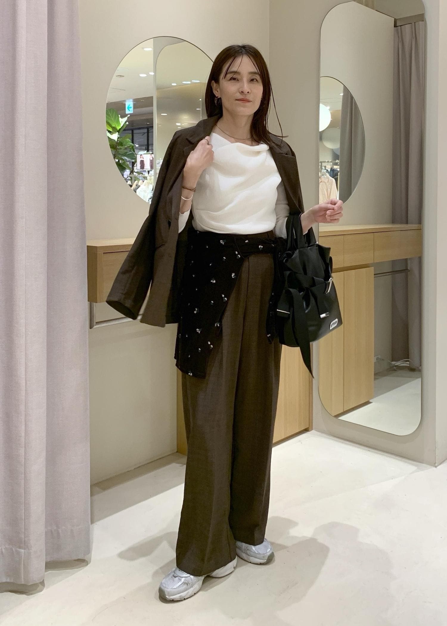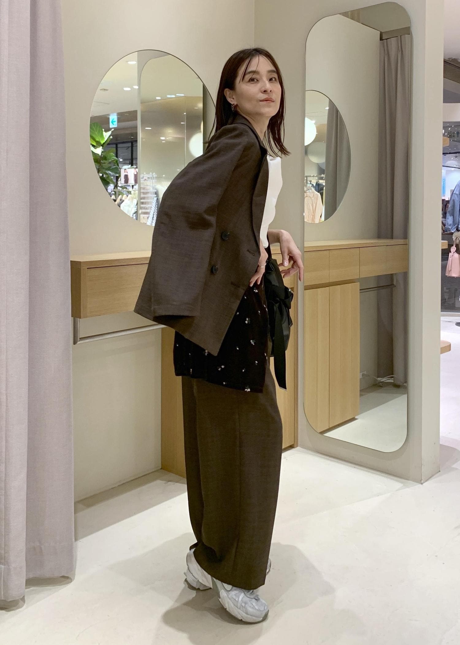 セットアップでもシャープになりすぎないよう、インナーは柔らかいデザイントップスとスニーカーで抜け感を出してみました。