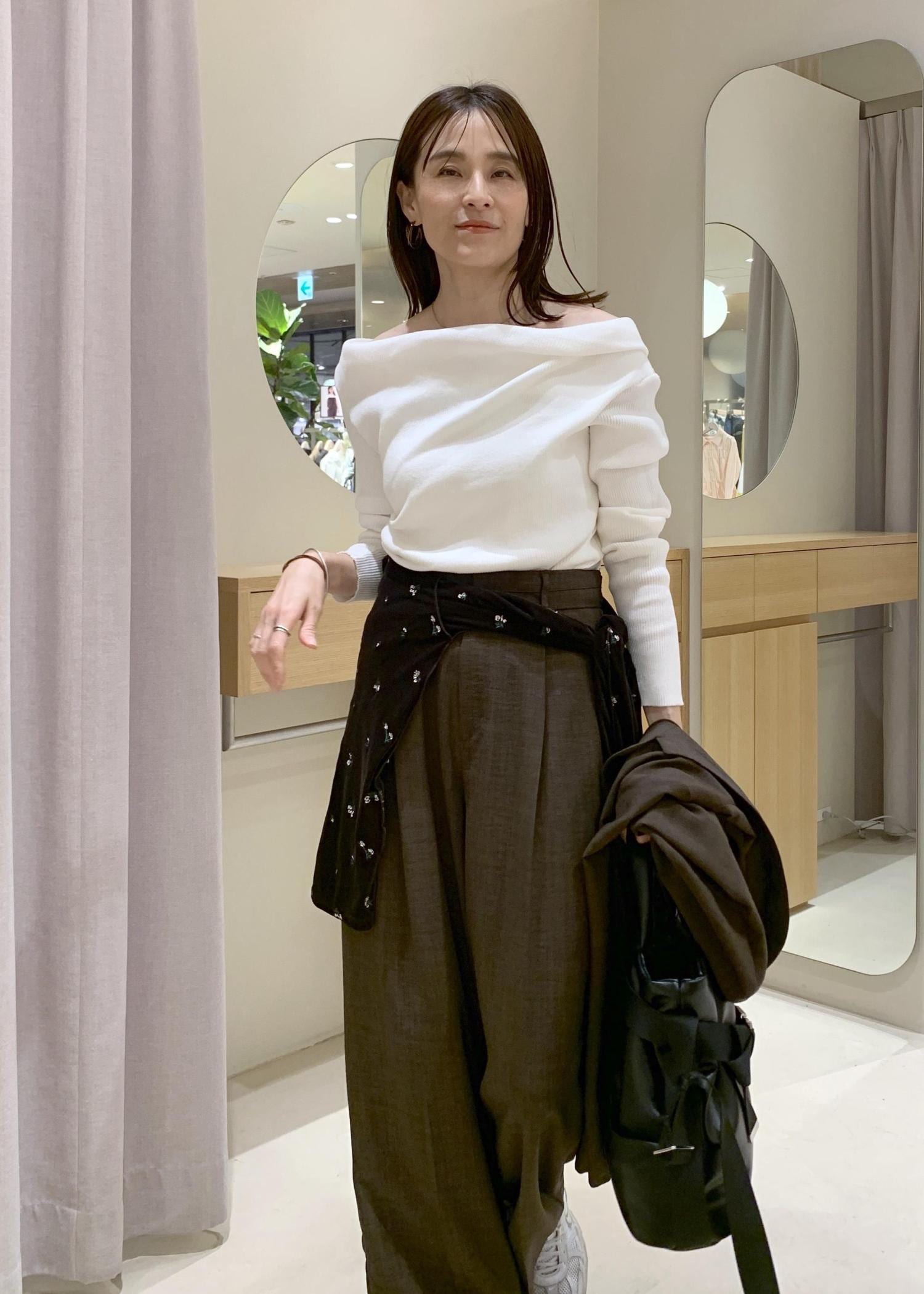 オフショルダー風に肩を落としても着れて、抜け感を出すことができます。