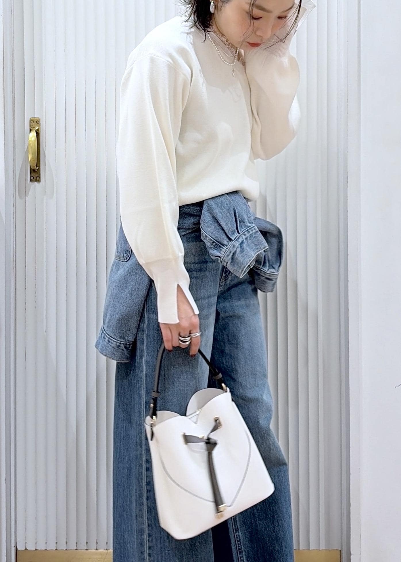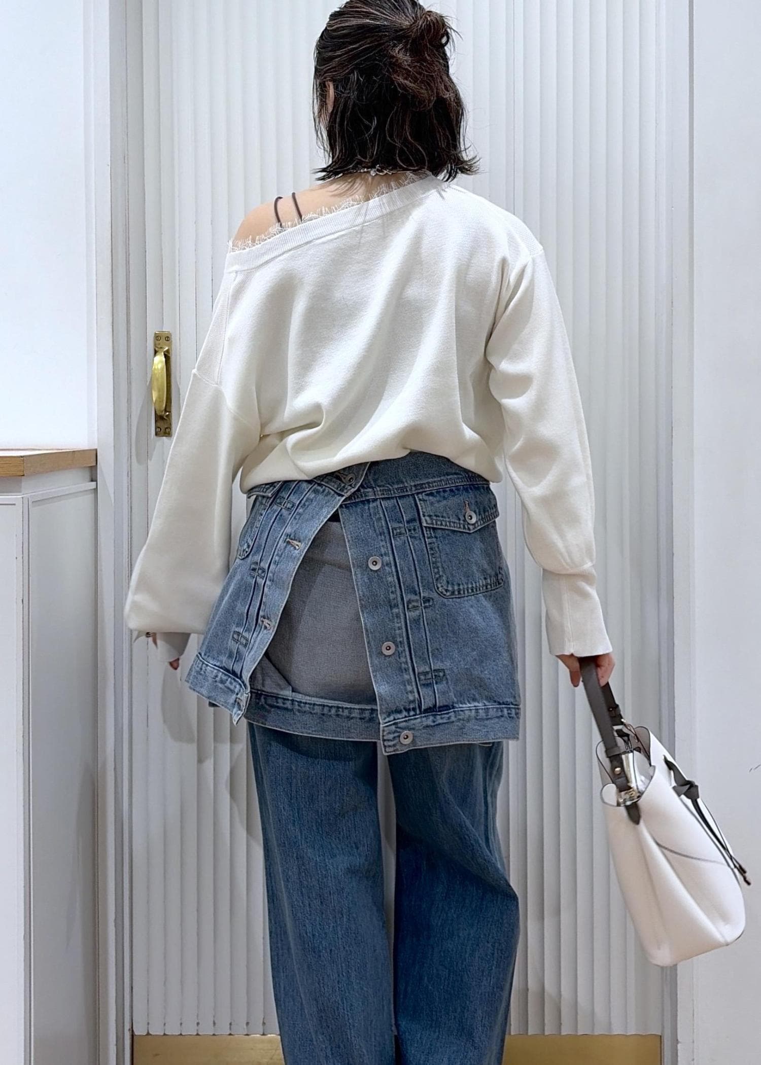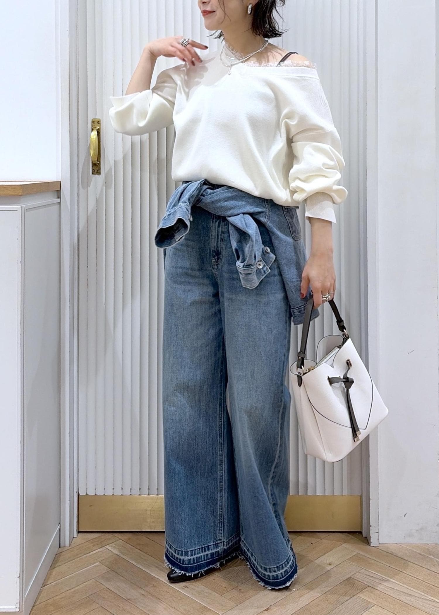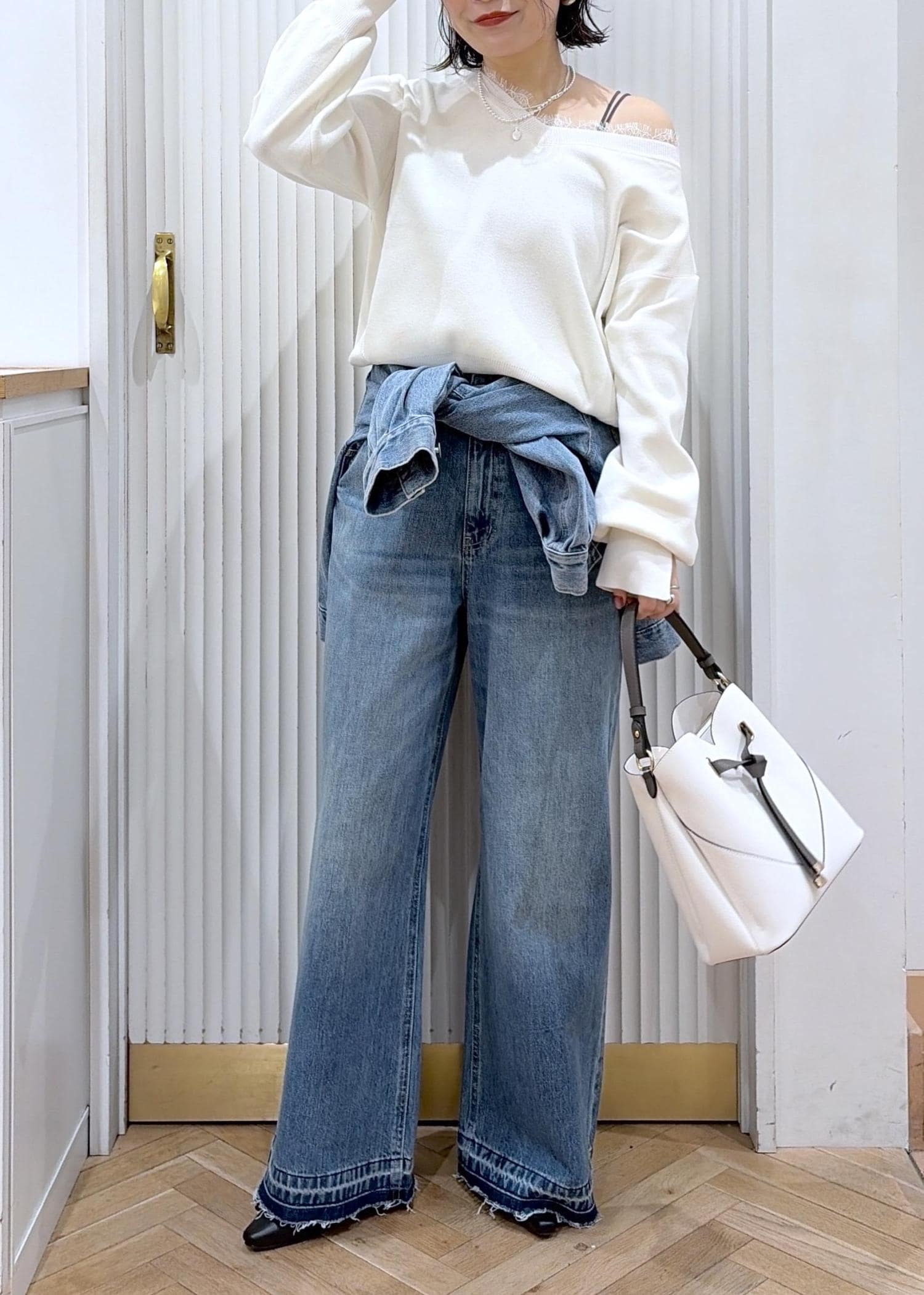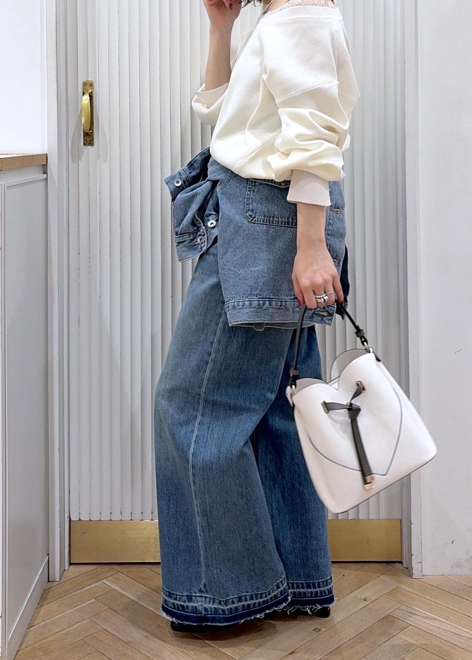 太ももから足もとにかけてラインを拾いにくいワイドシルエット。デニムなのに柔らかい履き心地で1シーズンを通して着用出来ます。 -