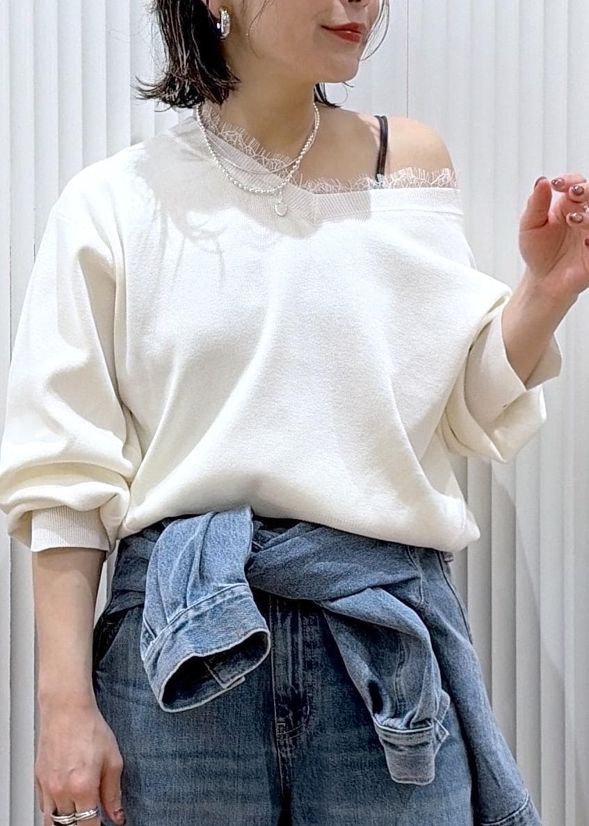 VISVネックレースプルオーバーオフホワイト / F¥5,929レビュードライタッチで滑らかなニット素材とVネック部分に施されたレースがポイントの大人可愛いプルオーバー。