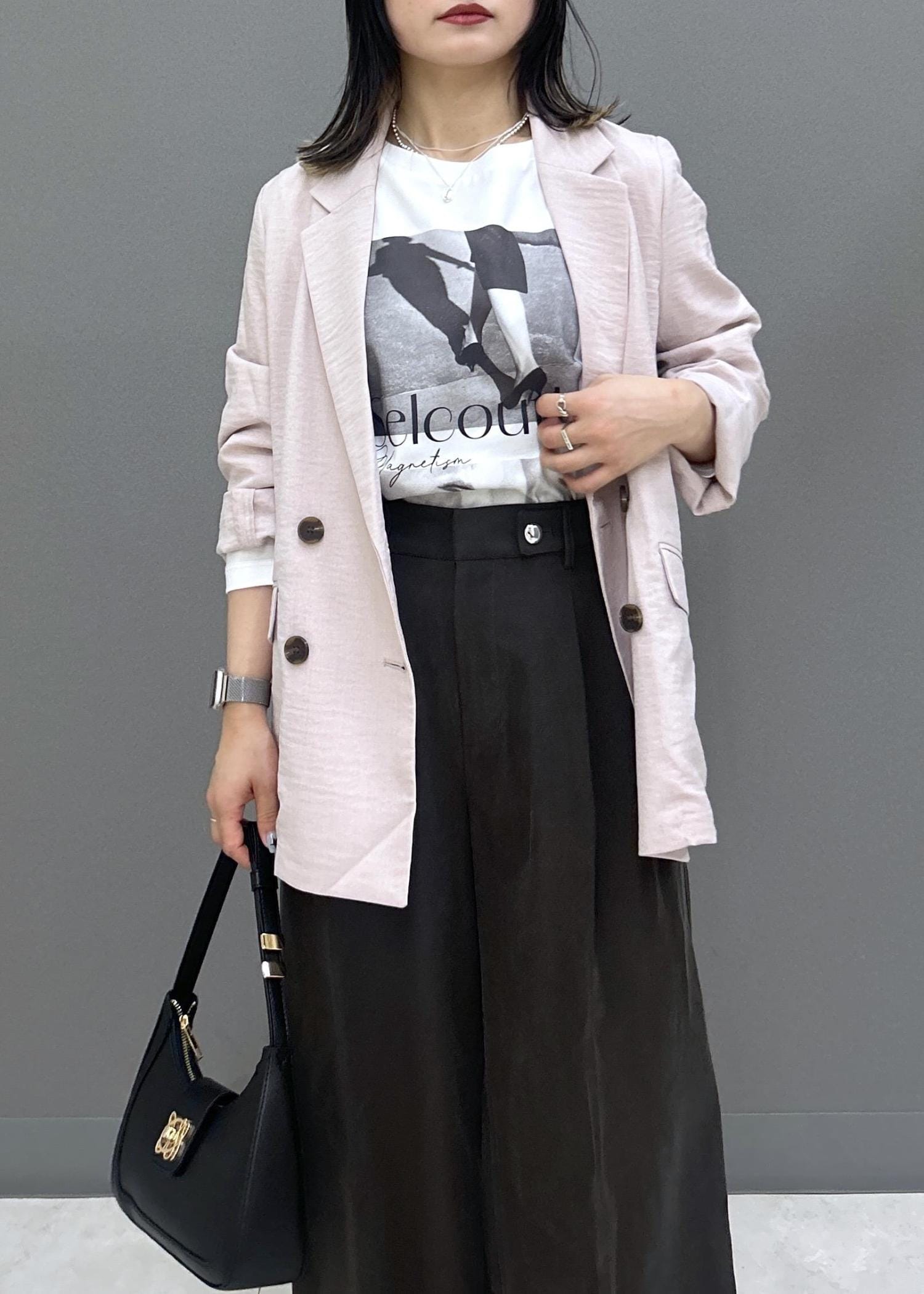 二の腕周りも身体のラインは拾わず程よいゆとりがありますが、オーバーサイズすぎないのでレイヤードにもピッタリ◎
