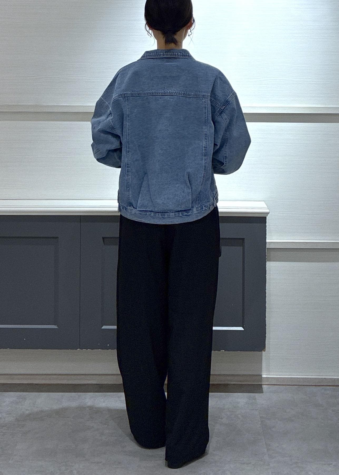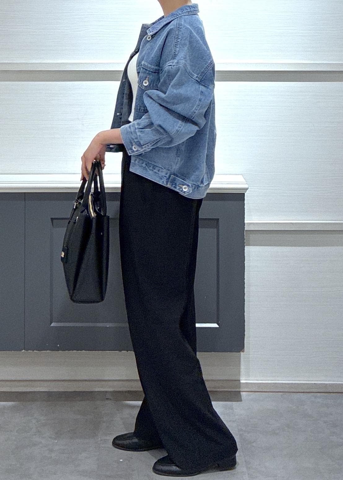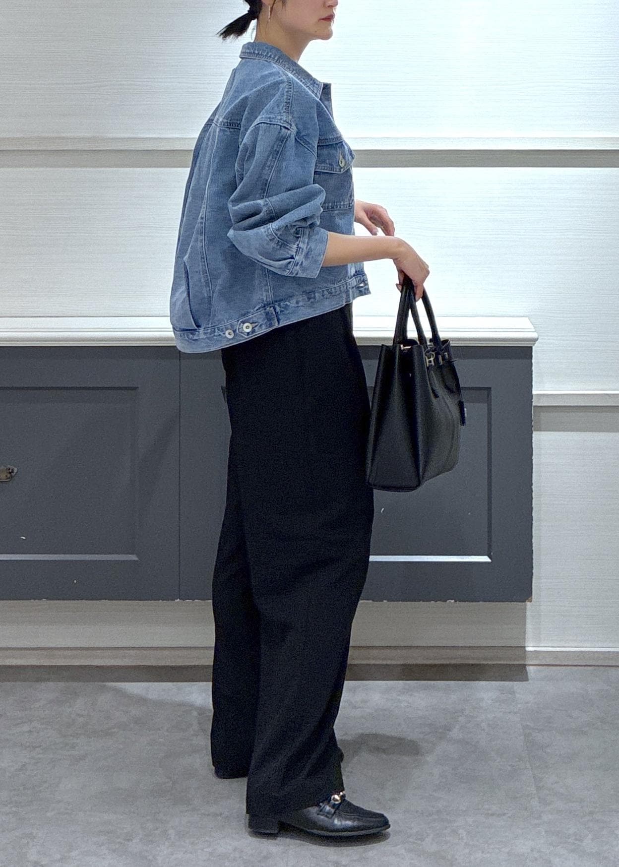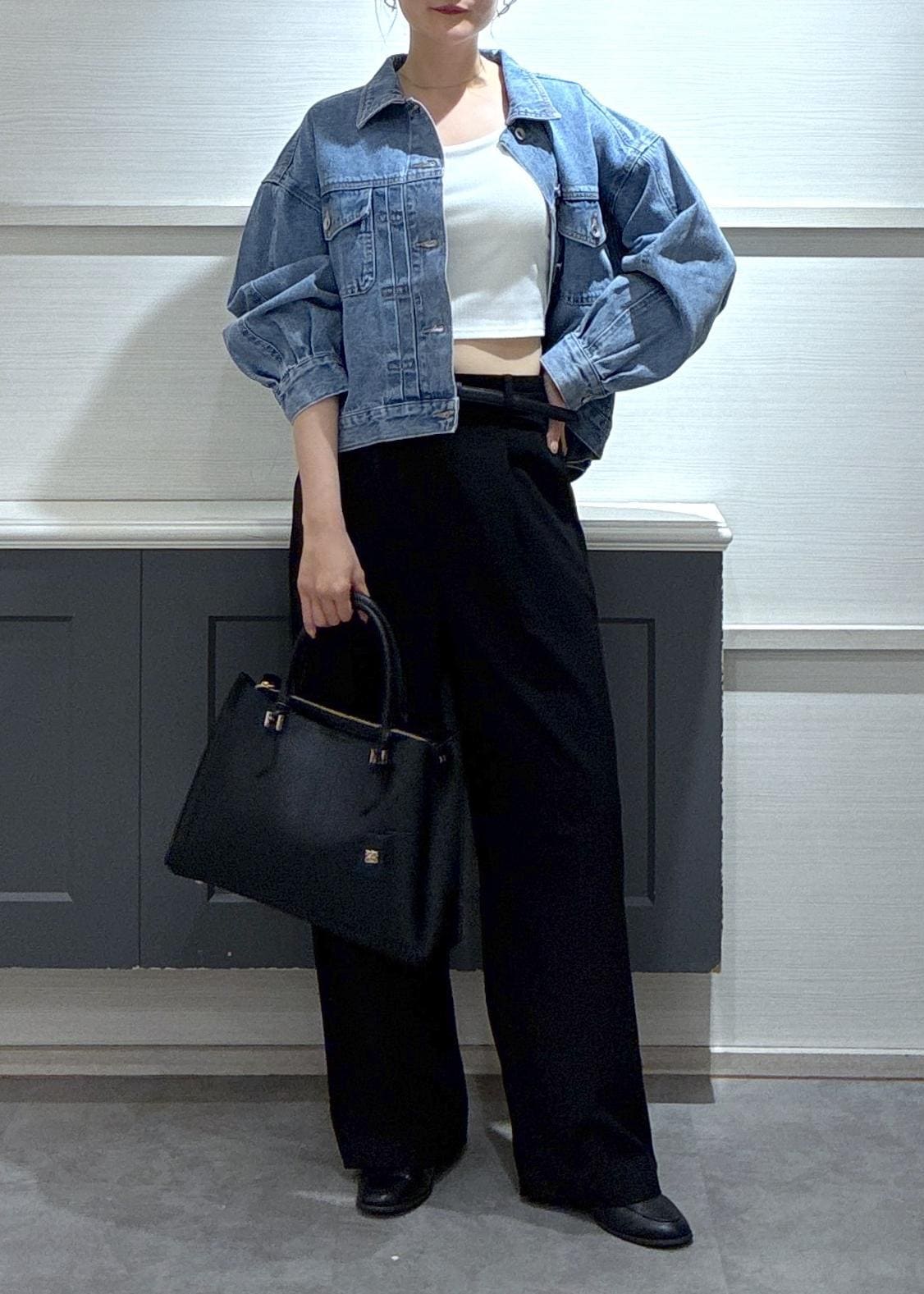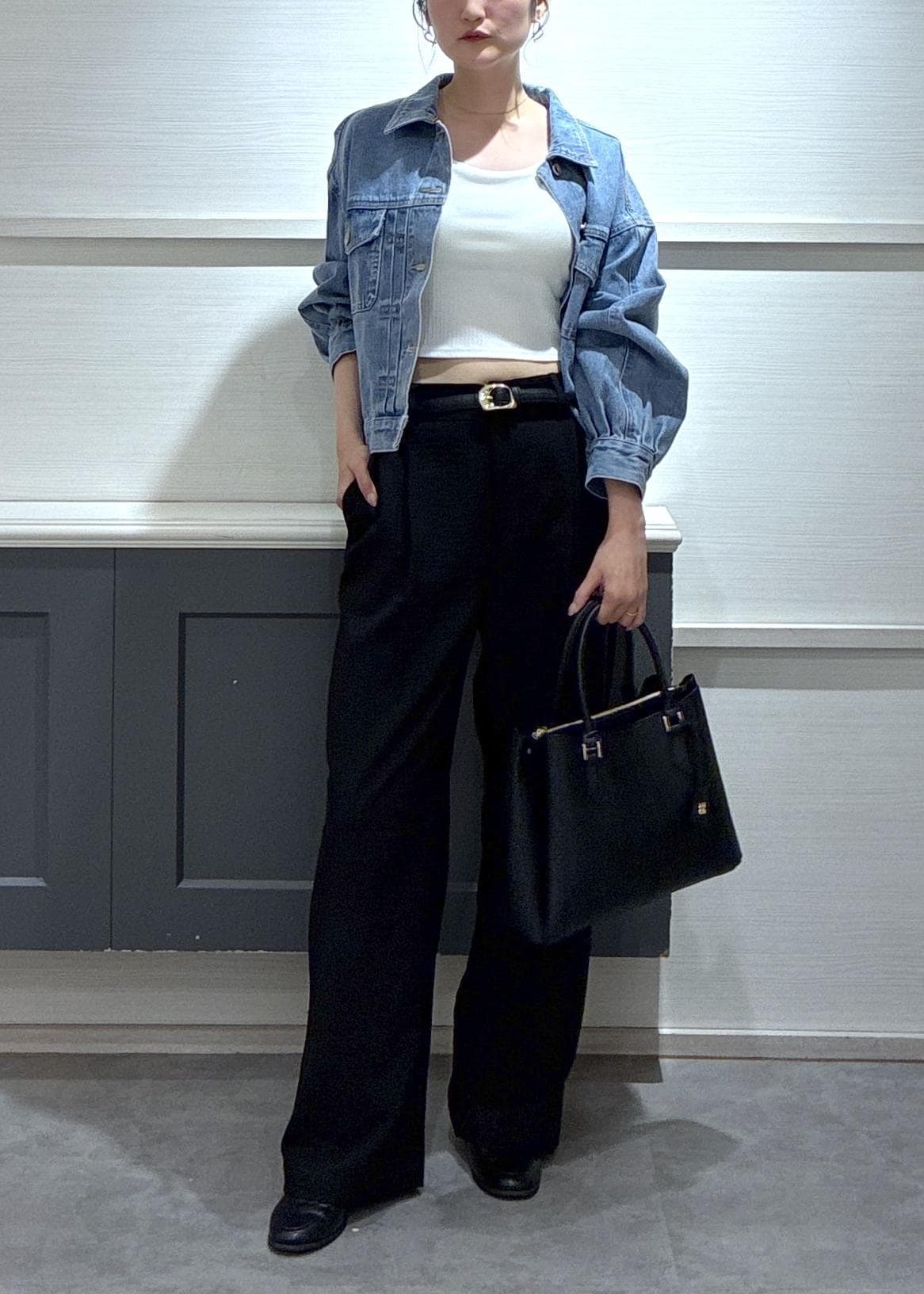 ボトムスはデニムカラーが引き立つように黒を選び、デニムジャケットを今年らしくアップデート!