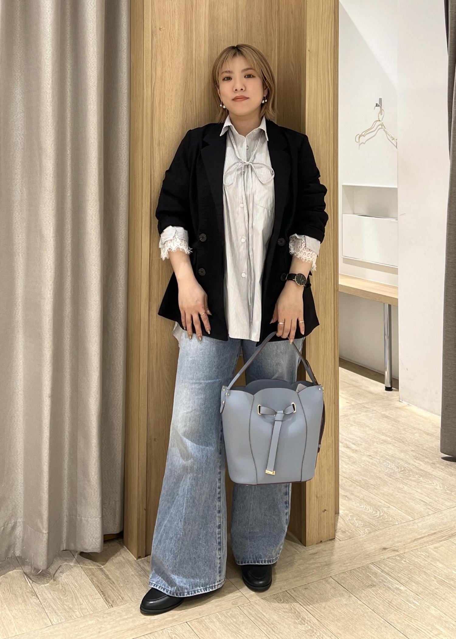 メンズライクになりすぎないよう華やかなフラワーバッグで女性らしさをプラスし、ウエストリボンは首元でアクセント使いにしてみました◎