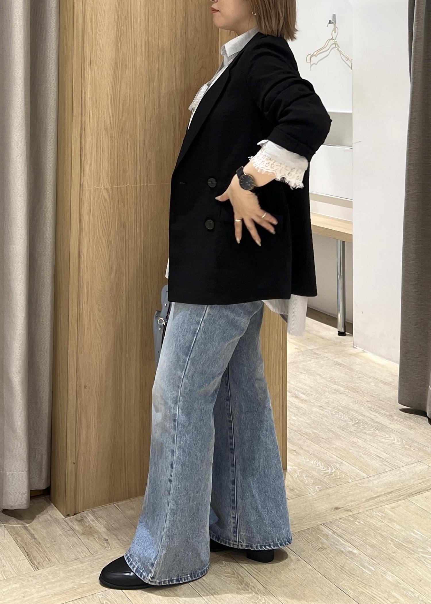 ウエストはジャストで太もも周りは少し余りますが、フレアのシルエットが綺麗です!