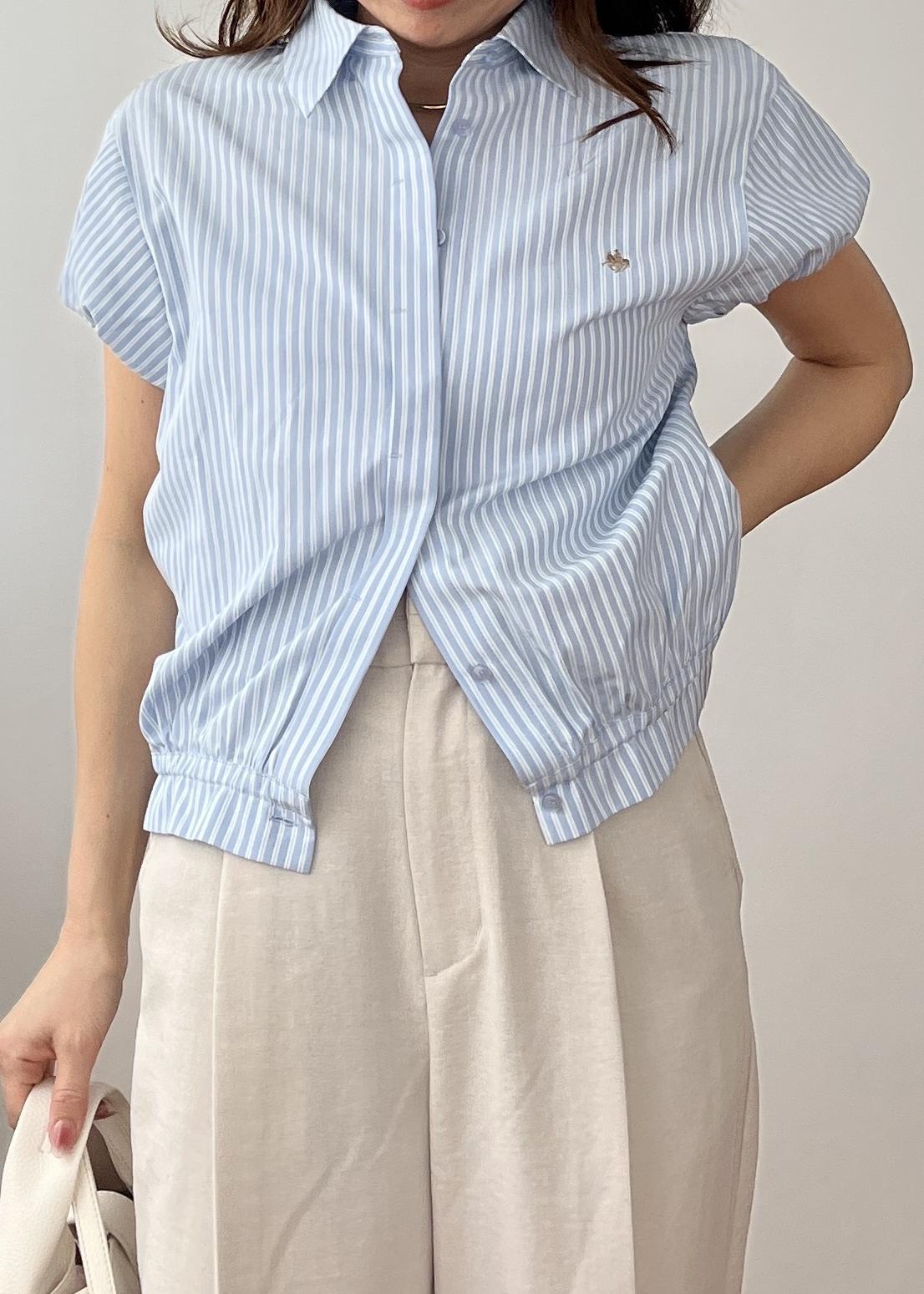 ブルーストライプで清潔感を出しつつ、