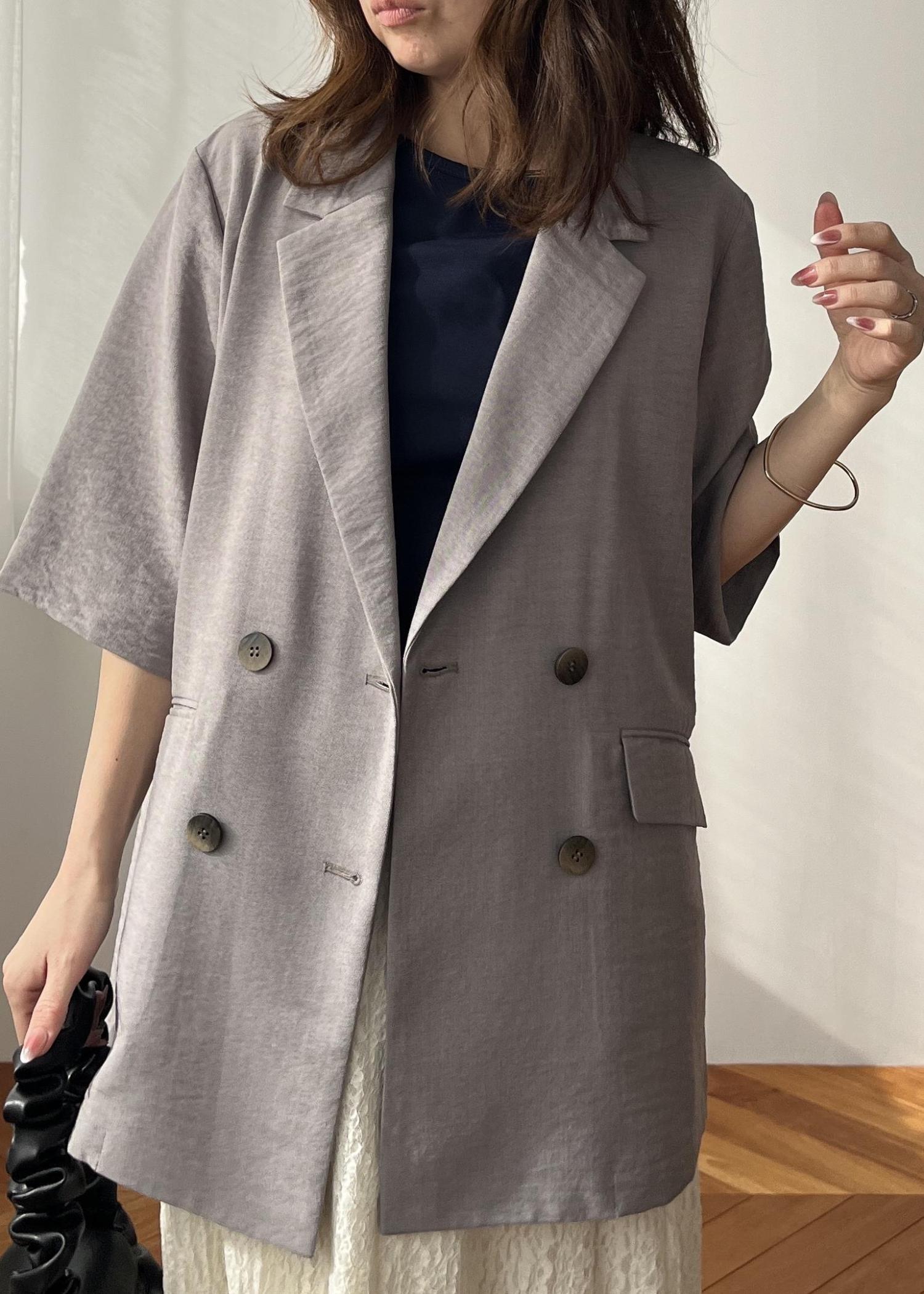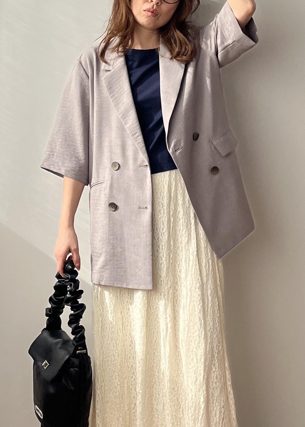 NEW! 予約VIS美easyハーフスリーブダブルジャケット/イージーケア・接触冷感・セットアップ対応グレー / M¥7,909レビュー152cmでサンプルの為Mサイズ着用し、着丈はお尻が隠れるくらいの丈。ややオーバーサイズですが、柔らかくシワになりにくい素材なので横に広がりすぎることなくお召しいただけます。リラックス感ありが良い方はMサイズ。コンパクト見えがお好きな方はSサイズがお勧めです。夏まで涼しく着られるシンプルジャケットは持っていると安心です!