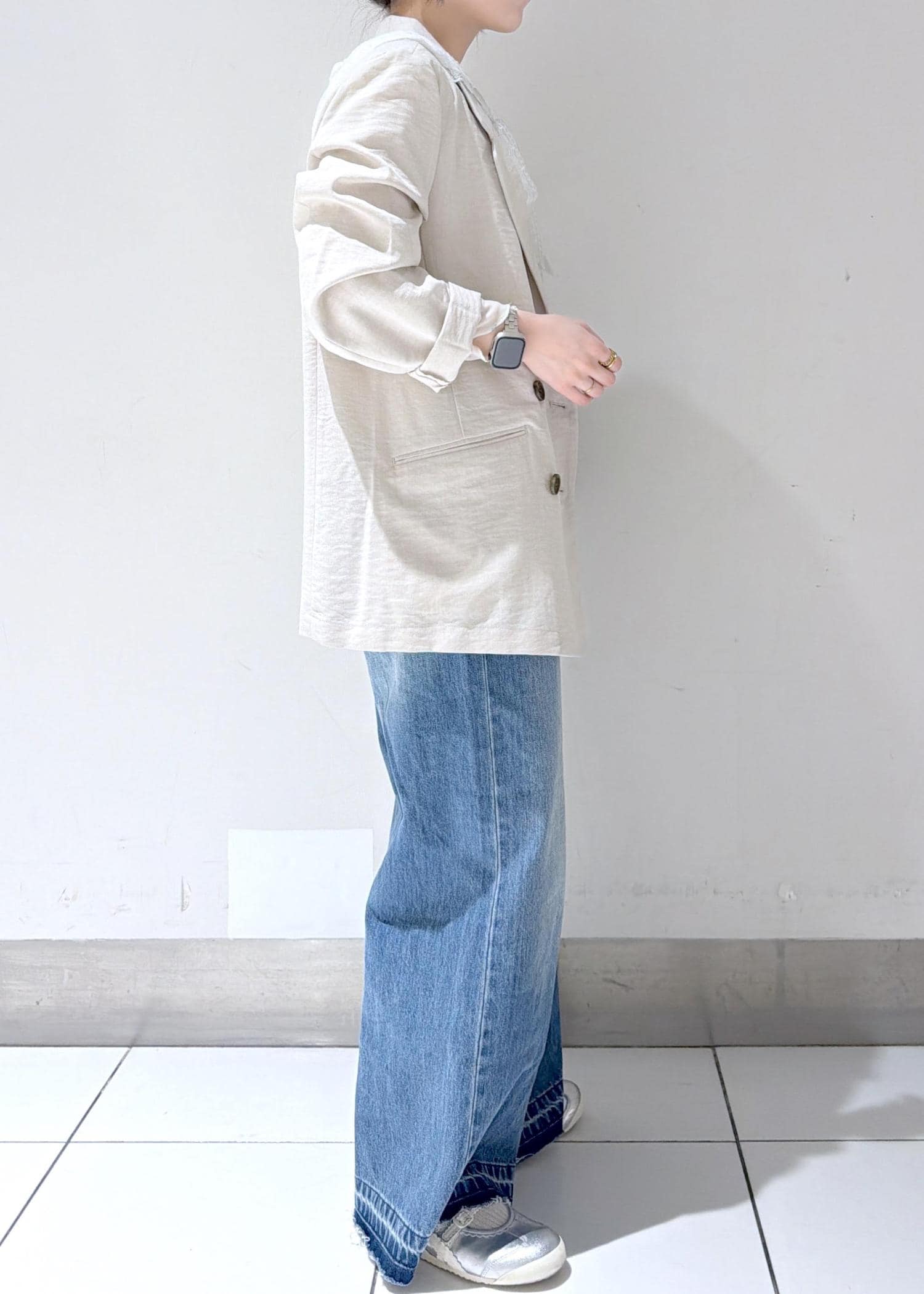 リネンライクジャケットを羽織ることで、ラフになりすぎず大人っぽい印象に仕上げました